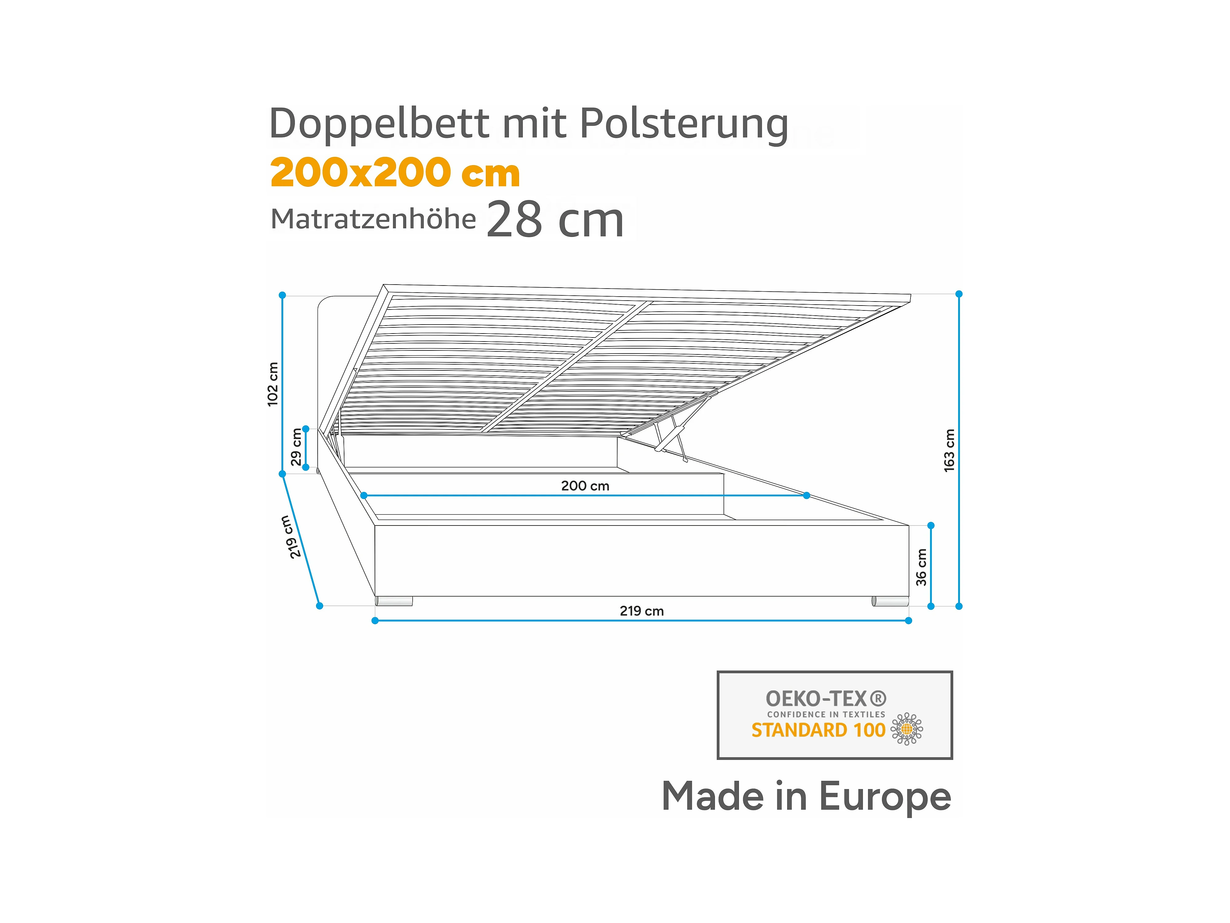 Polsterbett MALAGA mit gepolstertem Kopfteil, ELEMENT-Stoff, Bettkasten mit Gasdruckfeder, Betthöhe 39 cm, 200×200 cm, Hellgrün