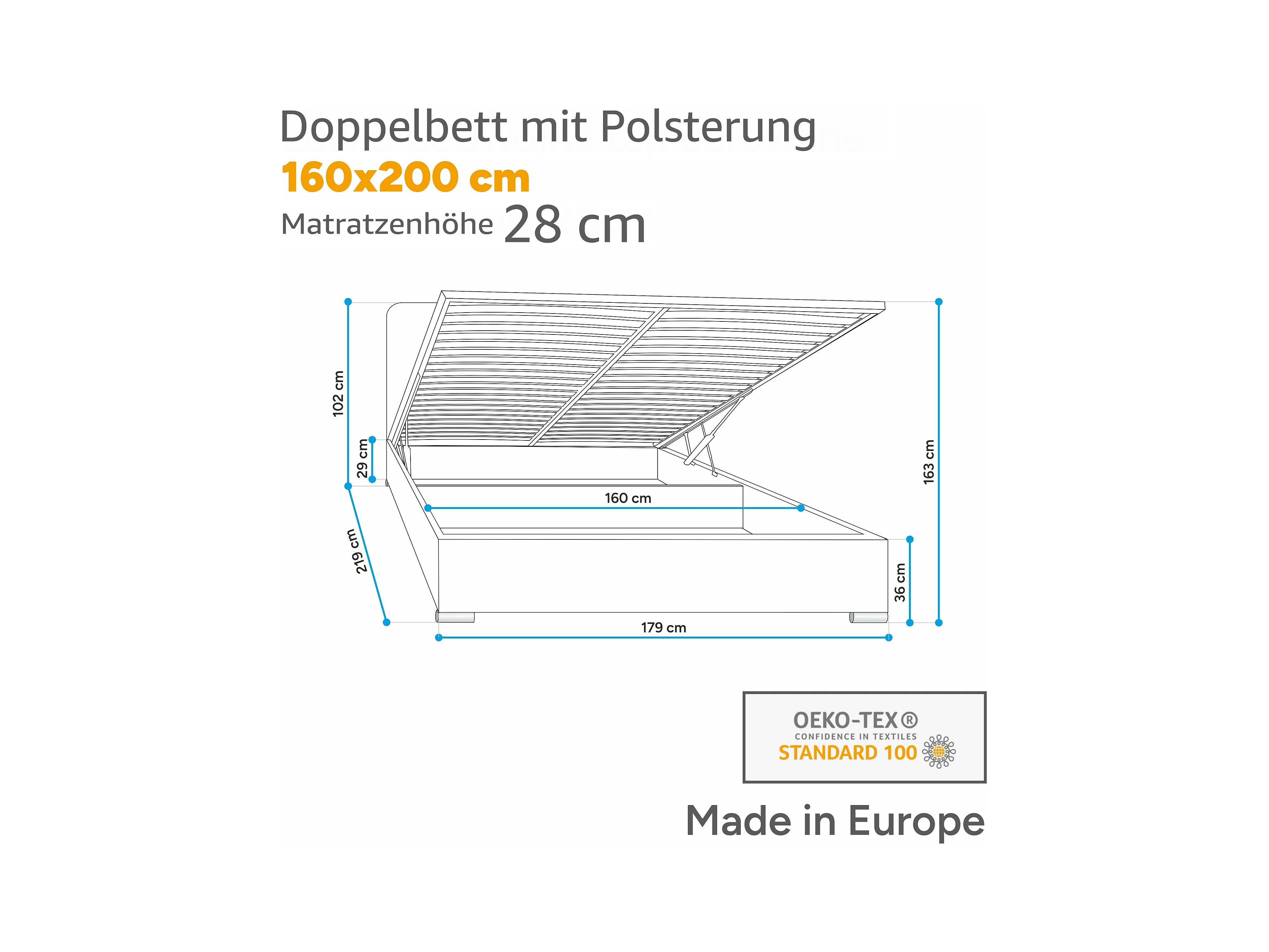 Polsterbett MALIBU 160x200 Kastanienbraun, MONOLITH-Stoff, gepolstertes Kopfteil, Bettkasten mit Gasdruckfeder, 39 cm hoch, Grau