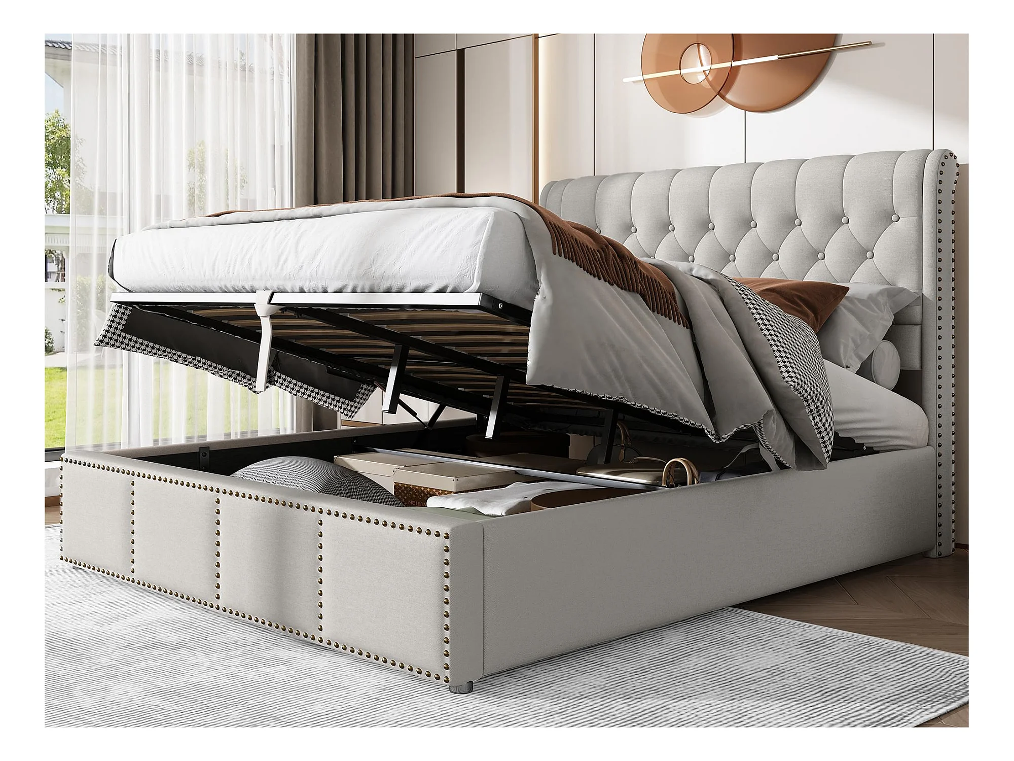 Gepolstertes Bett mit Stauraum aus Leinen – verziert mit Nieten – mit Lattenrost – 160 x 200 cm – Hellgrau