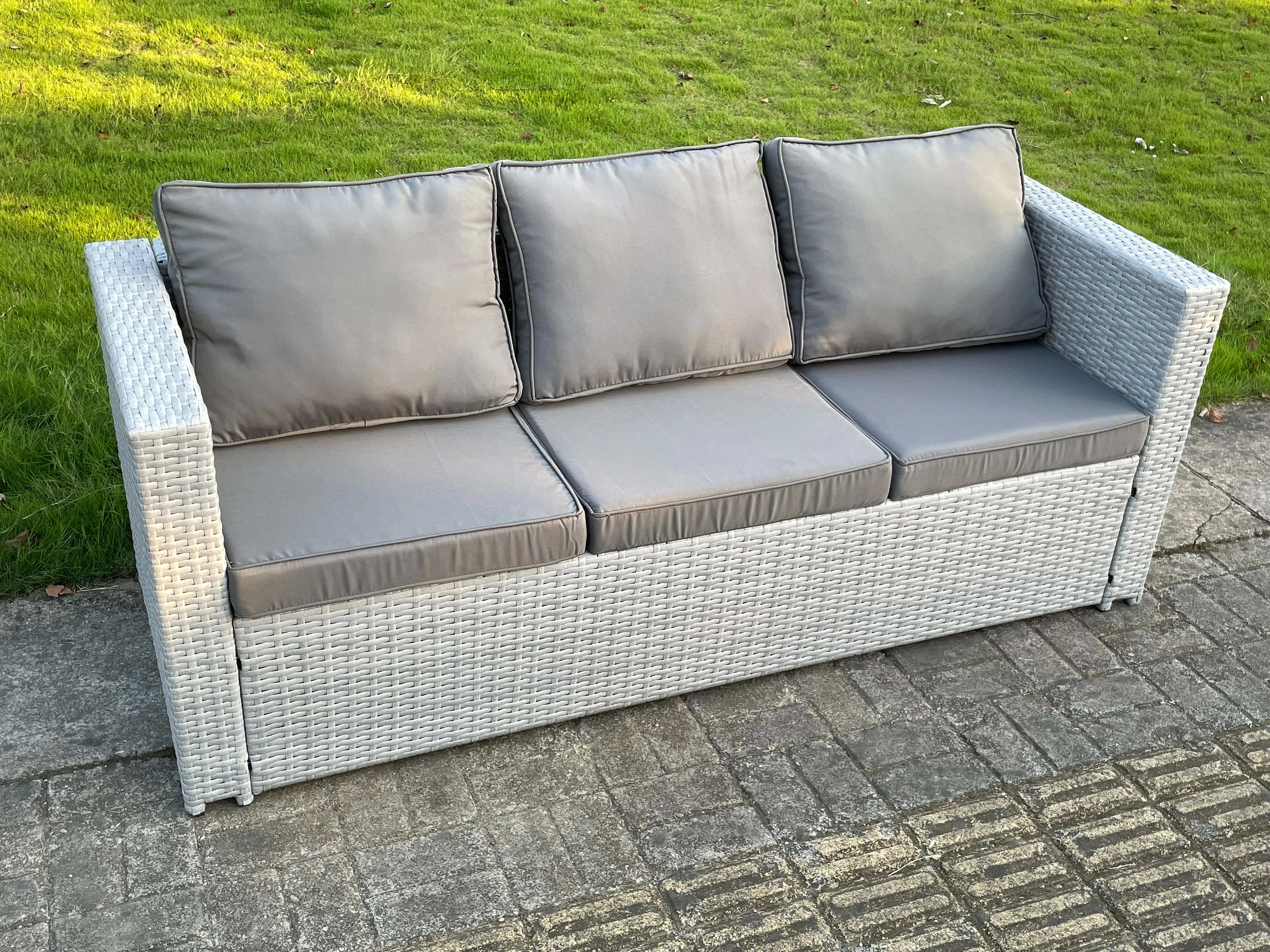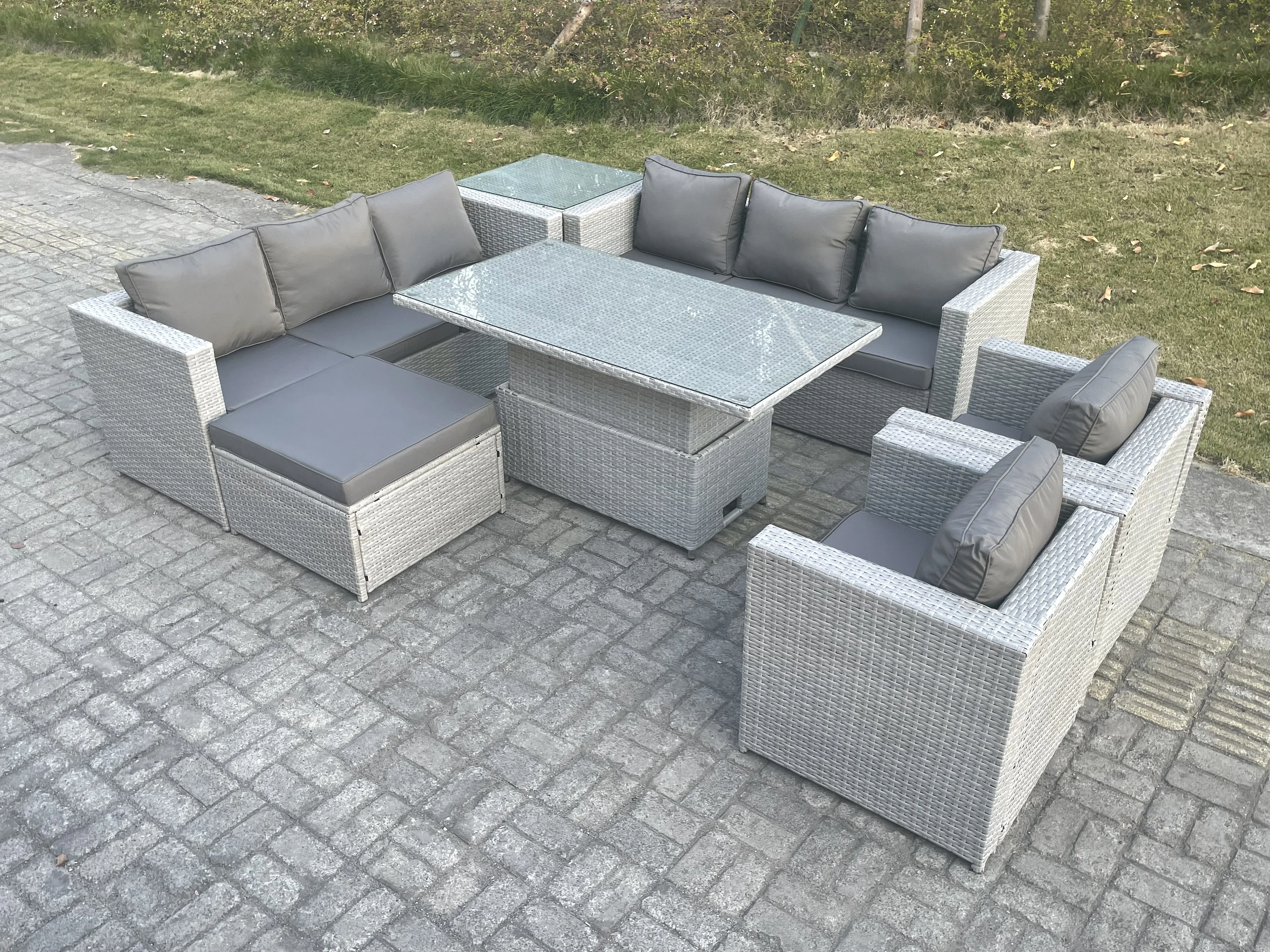 Polyrattan Essgruppe Gartenmöbel Set Höhe verstellbar Esstisch Set mit Sofa 2 Sessel Beistelltisch Großer Fußhocker Helles Grau