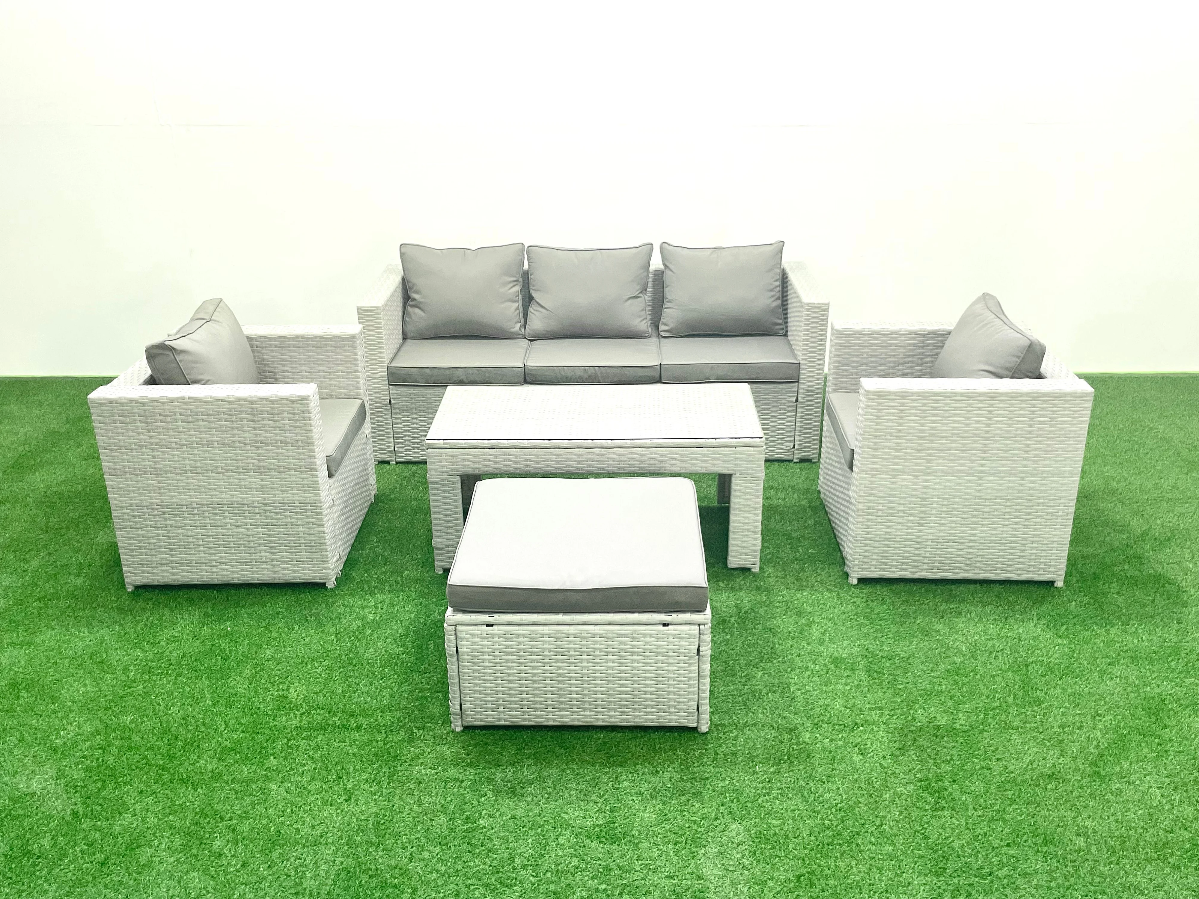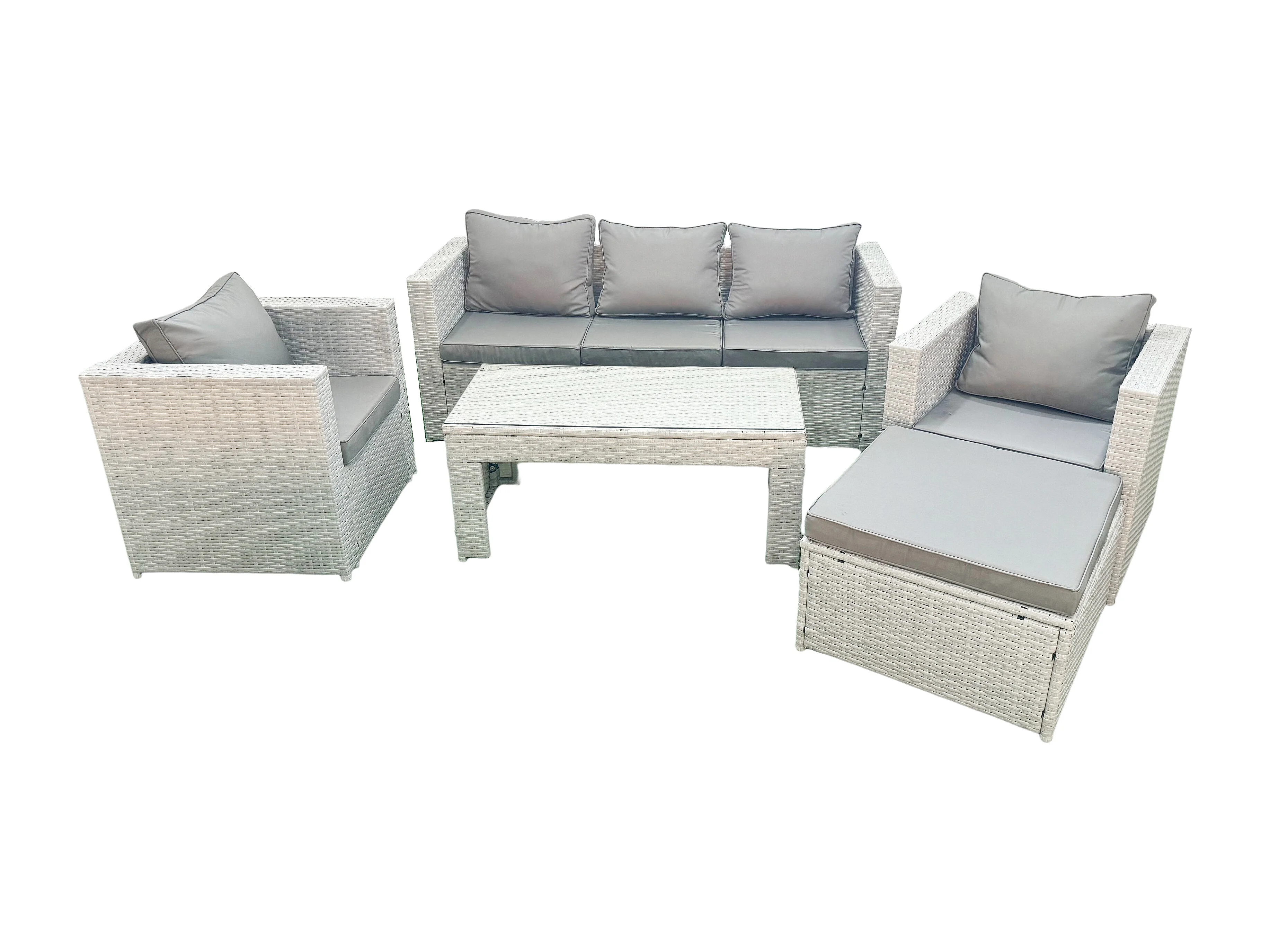 Polyrattan Gartenmöbel Set 5 Stücke Outdoor Garten Sofa Rechteckiger Couchtisch Set mit 2 Sesseln Hocker Hellgrau gemischt