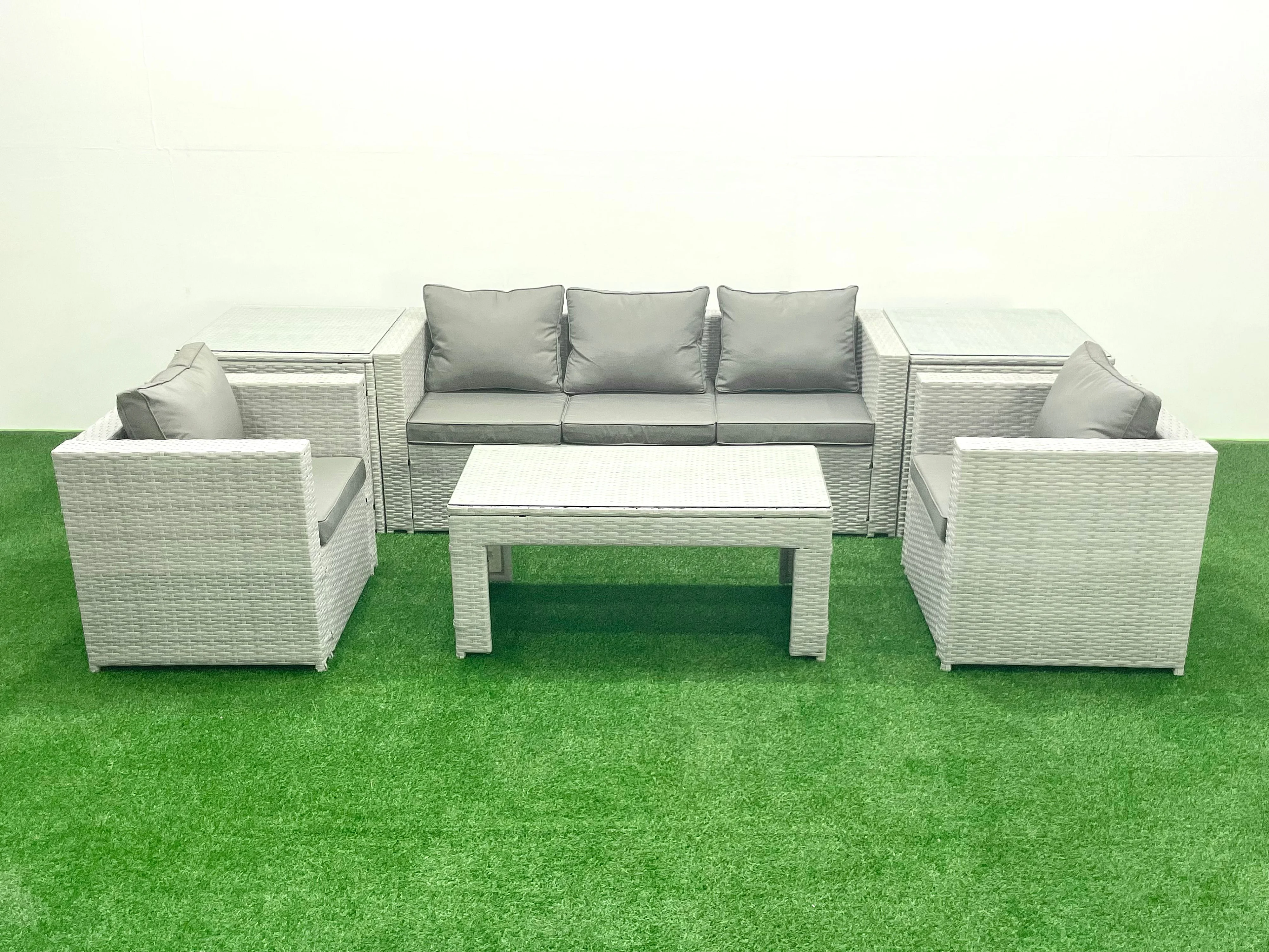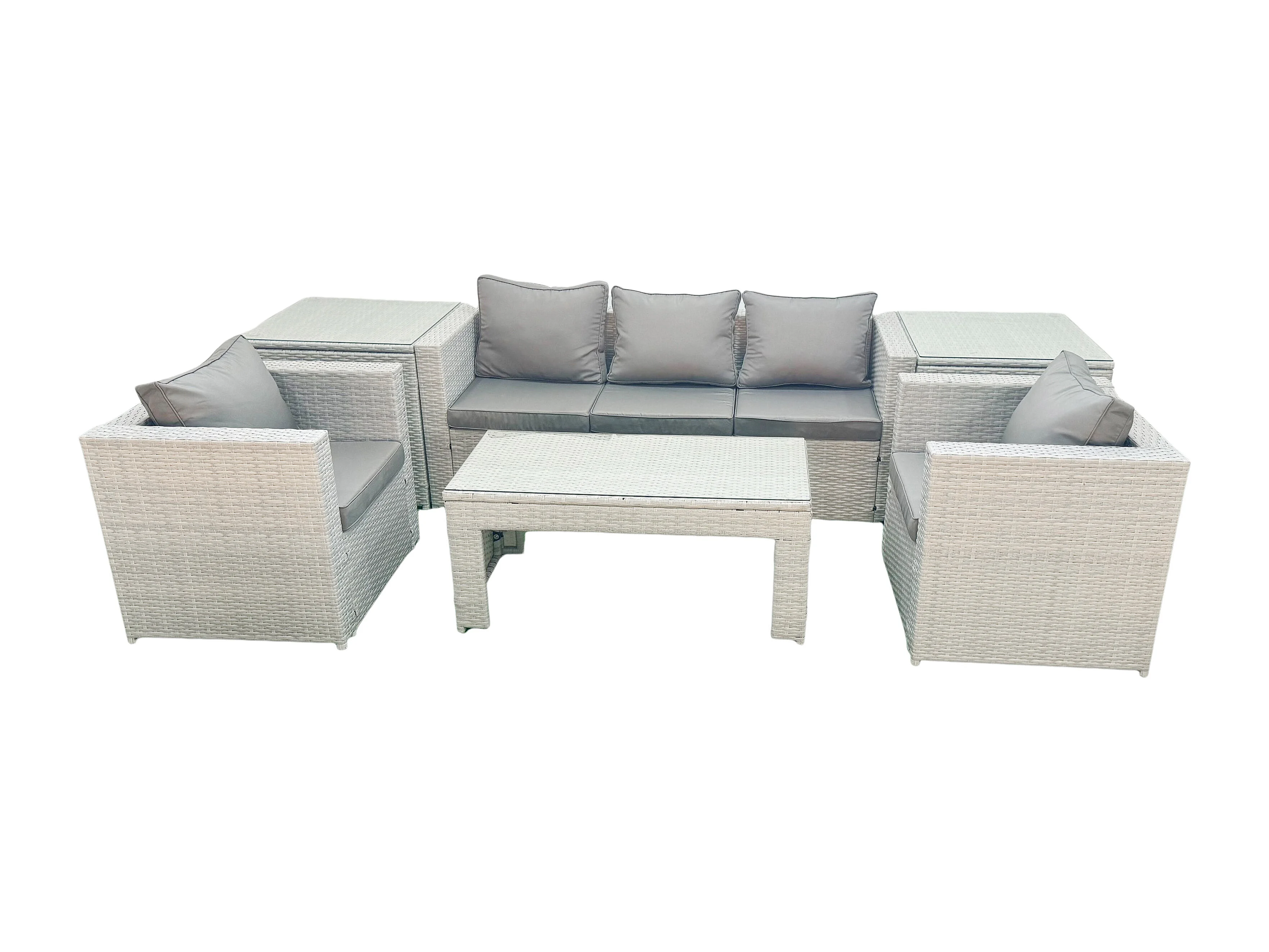 Polyrattan Gartenmöbel Set 6 Stücke Outdoor Garten Sofa Rechteckiger Couchtisch Set mit 2 Sesseln 2 Beistelltischen Hellgrau gemischt
