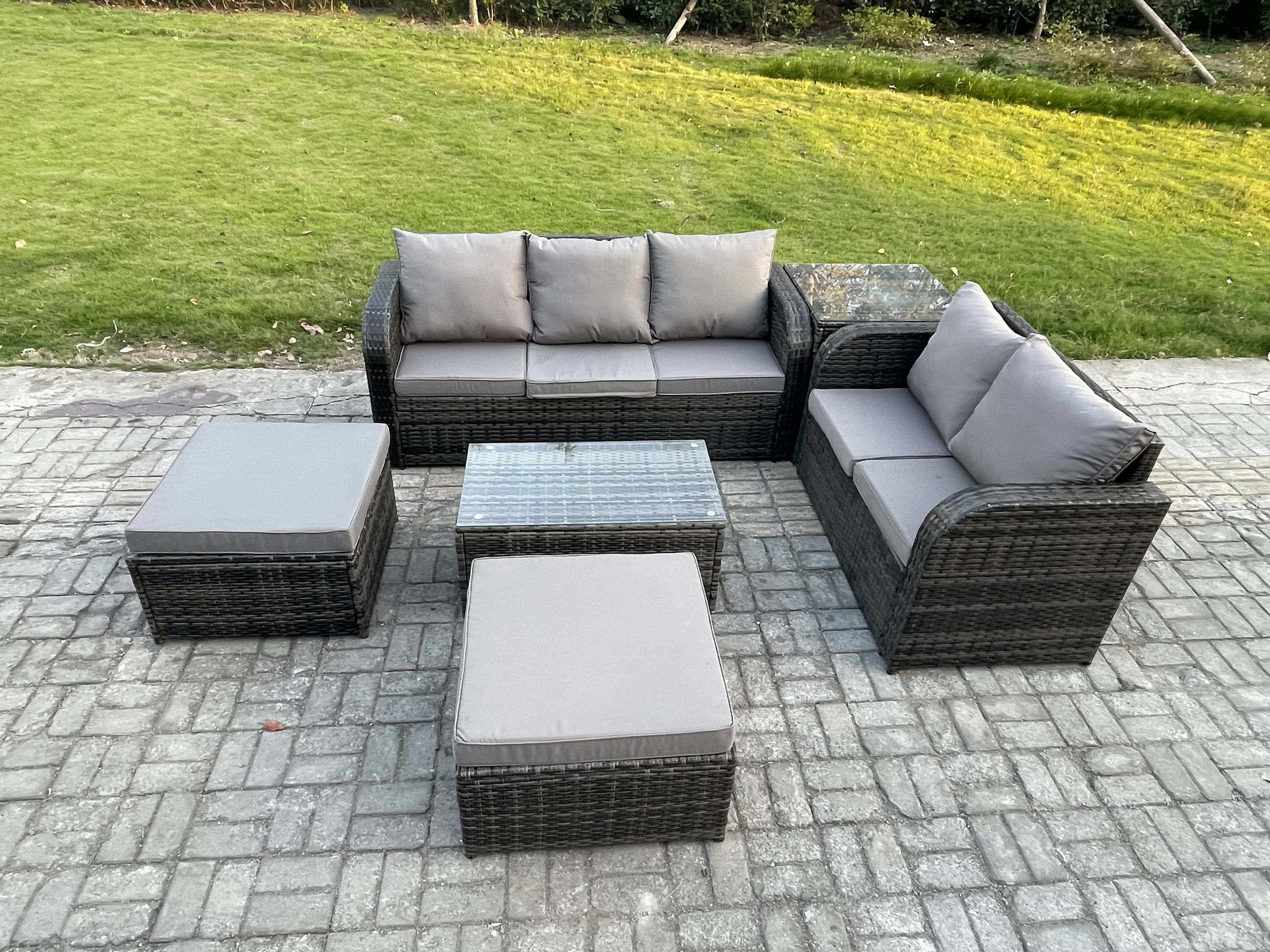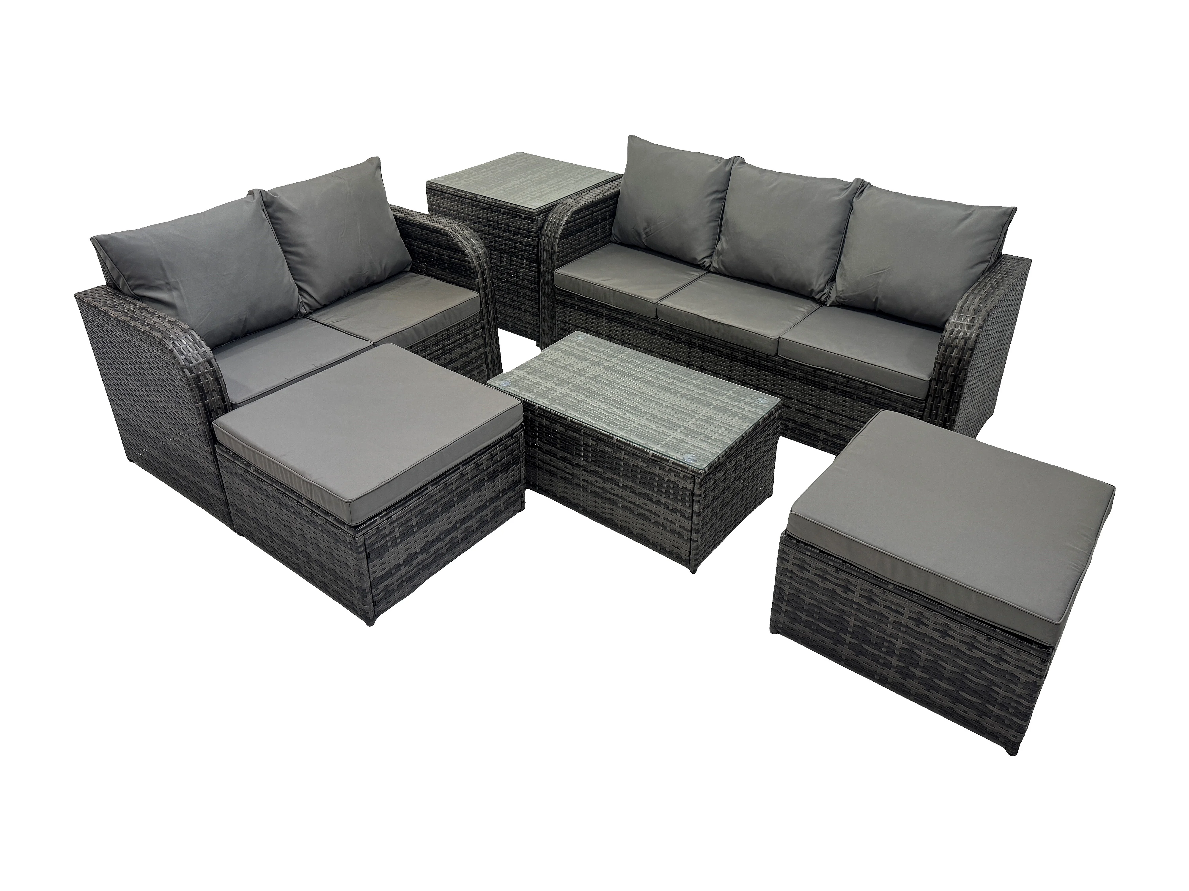 Polyrattan Gartenmöbel Set 7-Sitzer Garten Sofa im Freien Set mit Love Sofa Couchtisch 2 hohen Hockern Beistelltisch Dunkelgrau Gemischt