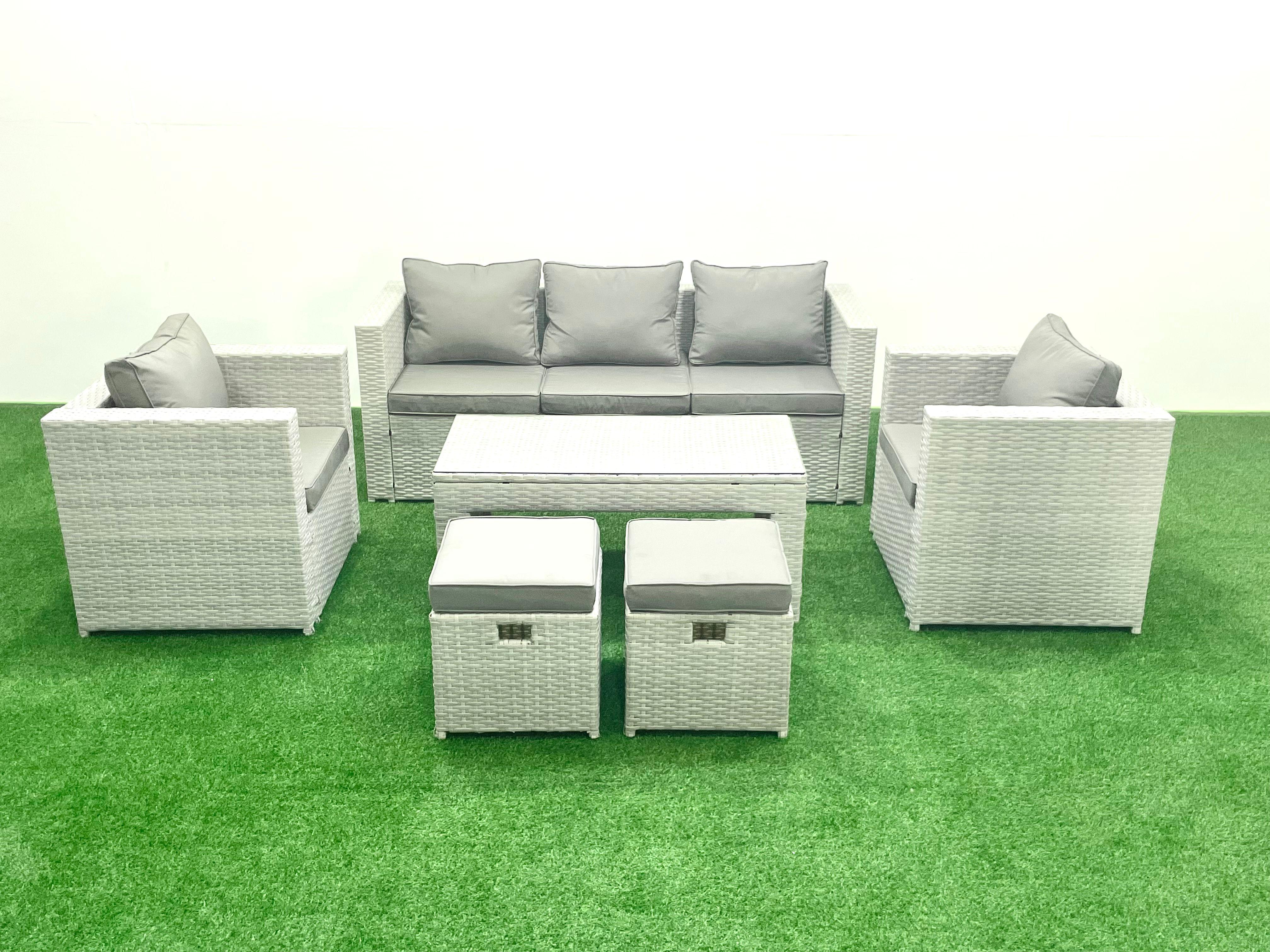 Polyrattan Gartenmöbel Set 7-Sitzer Outdoor Garten Sofa Rechteckiger Couchtisch Set mit 2 Sesseln 2 Hockern Hellgrau gemischt