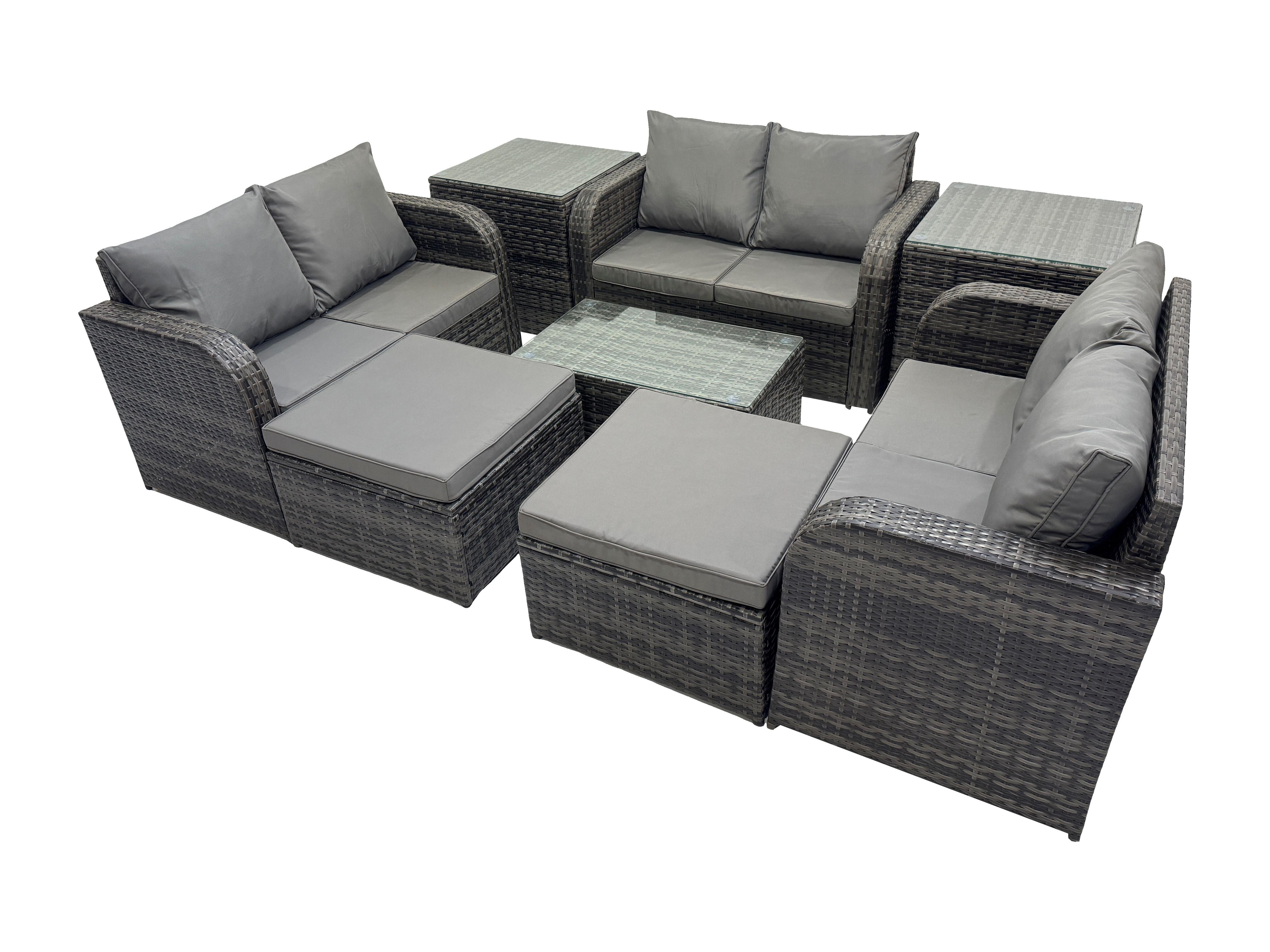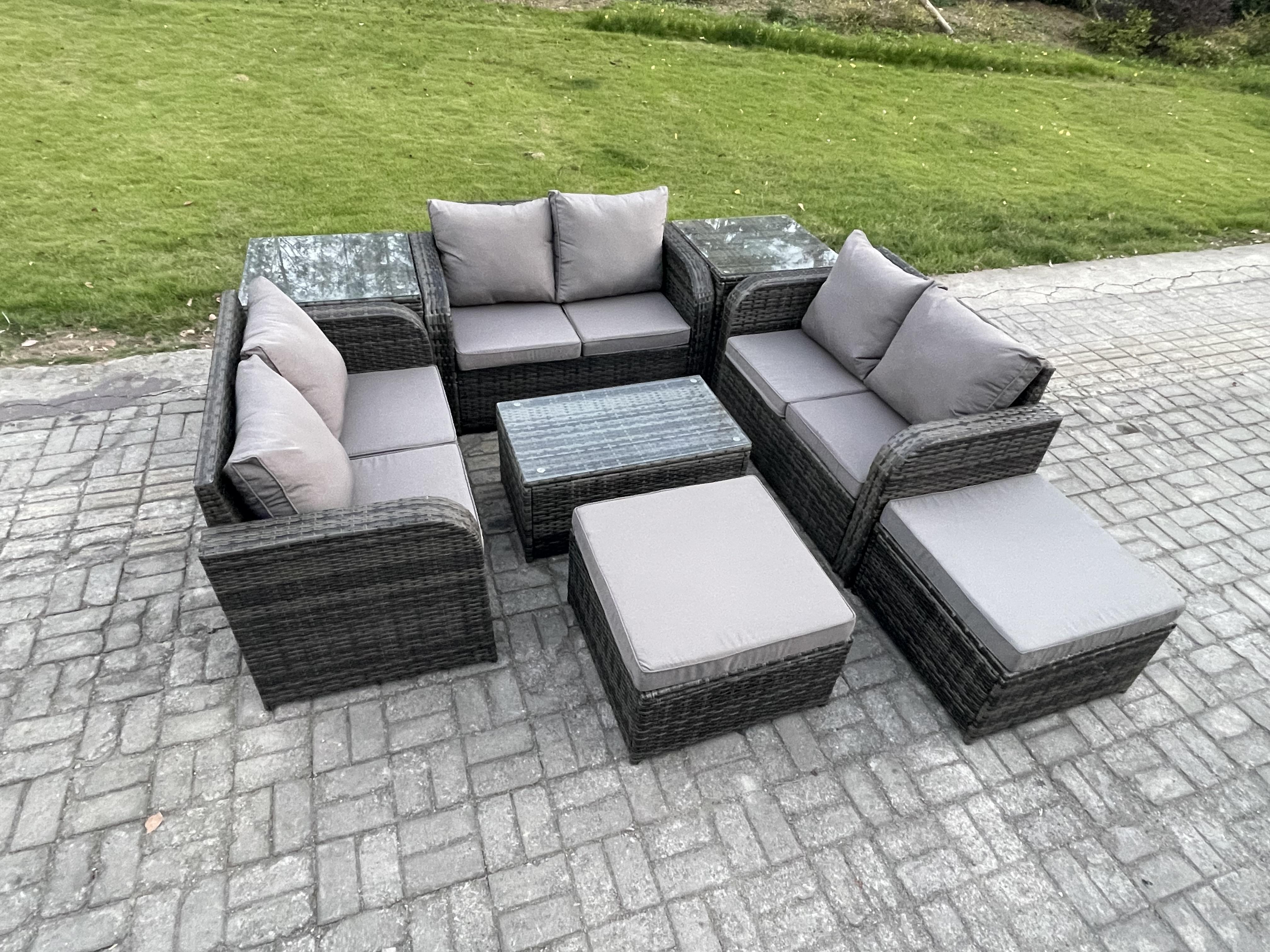 Polyrattan Gartenmöbel Set 8-Sitzer Garten Sofa im Freien Set mit Love Sofa Couchtisch 2 Beistelltischen 2 hohen Hockern Dunkelgrau Gemischt