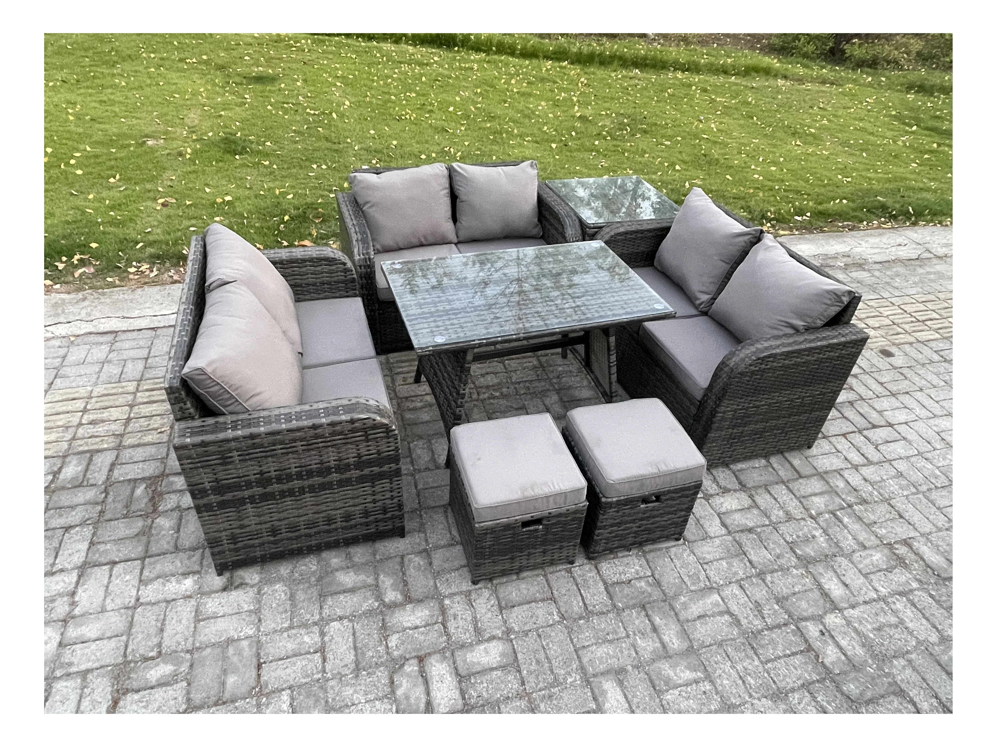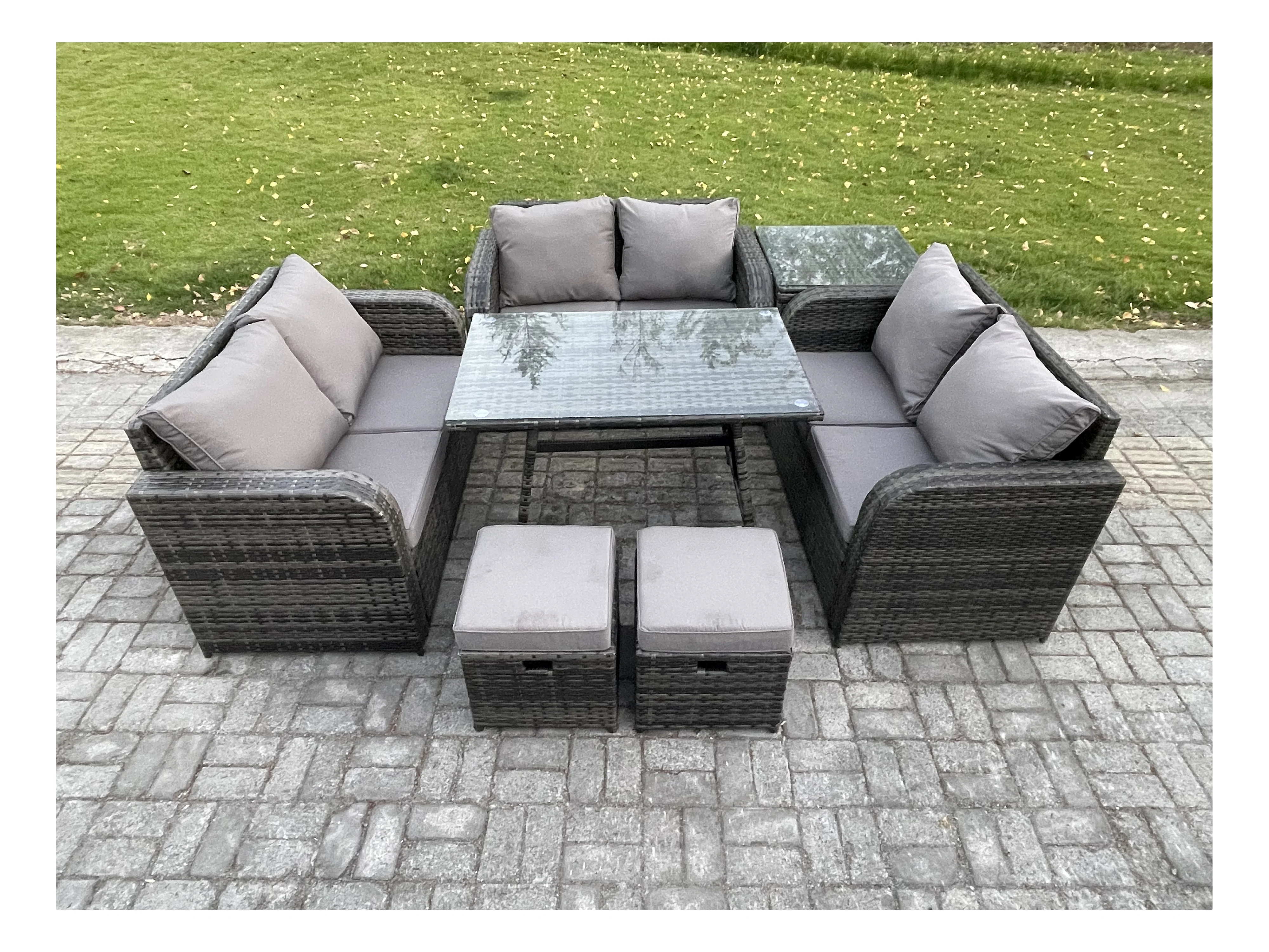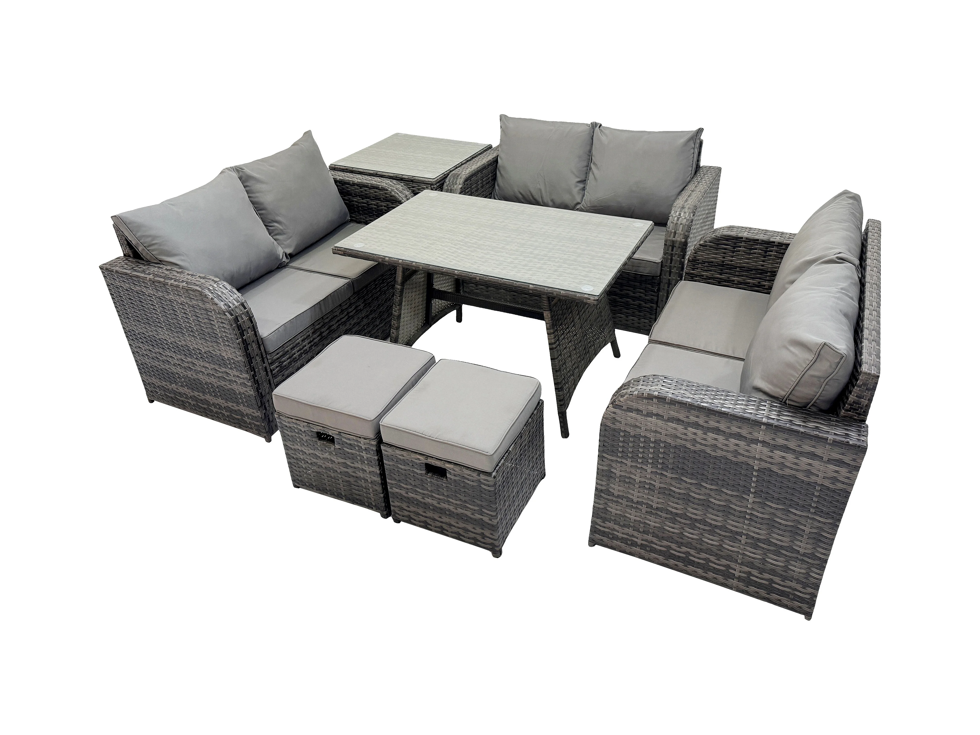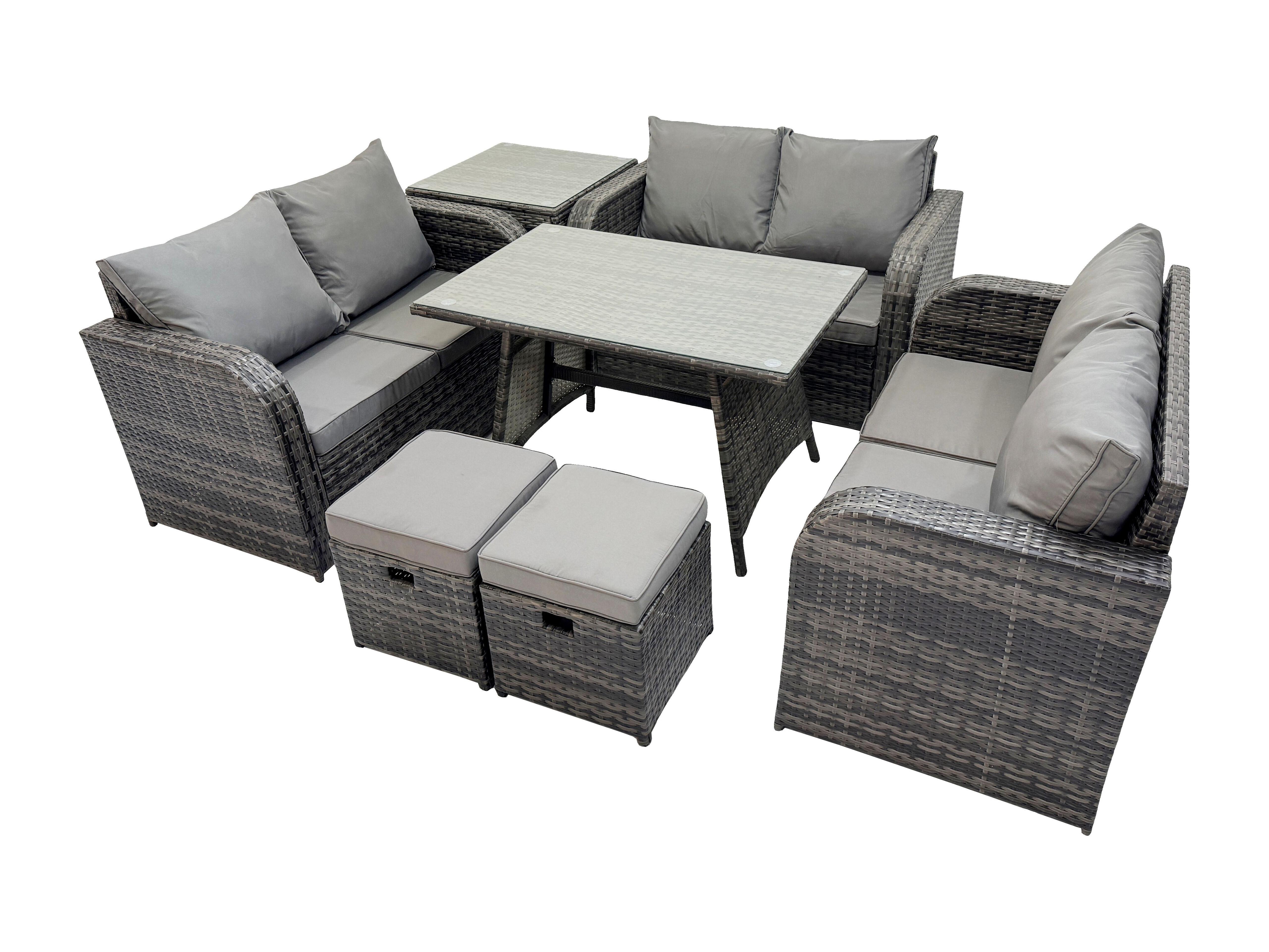 Polyrattan Gartenmöbel Set 8-Sitzer Gartensofa Set mit Rechteckiger Esstisch Beistelltisch 2 kleine Fußhockern Dunkelgrau Gemischt