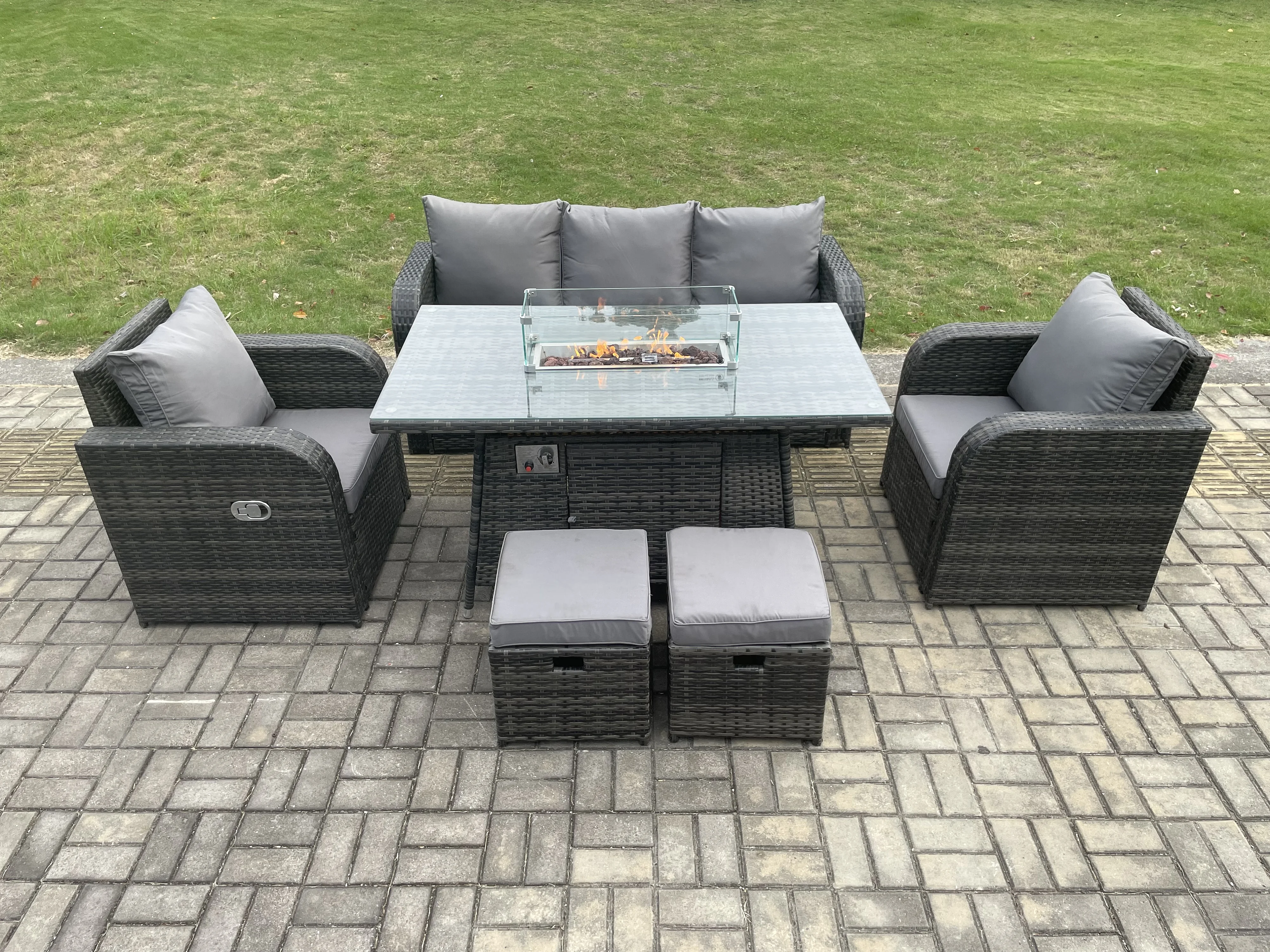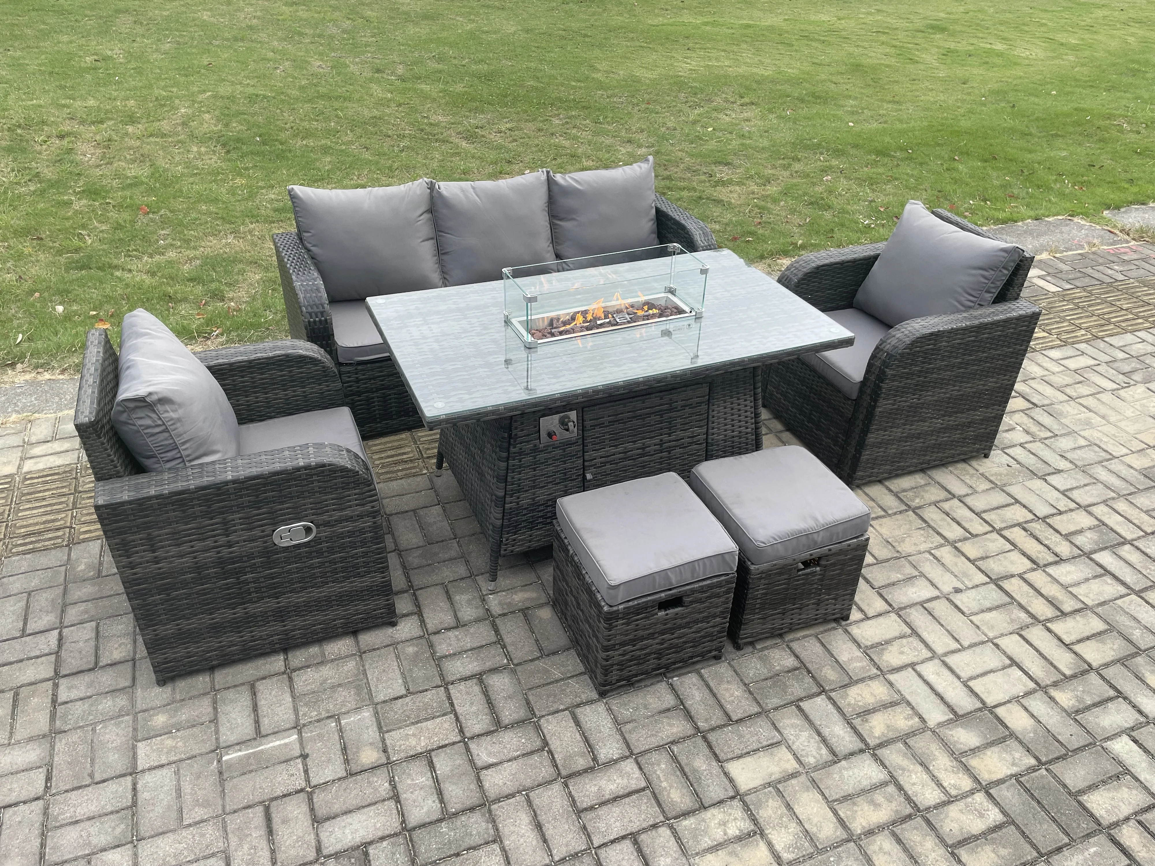 Polyrattan Gartenmöbel Set Garten Sofa im Freien Gasfeuerstelle Esstisch Set mit 3-Sitzer Sofa 2 kleine Fußhockern Dunkelgrau Gemischt