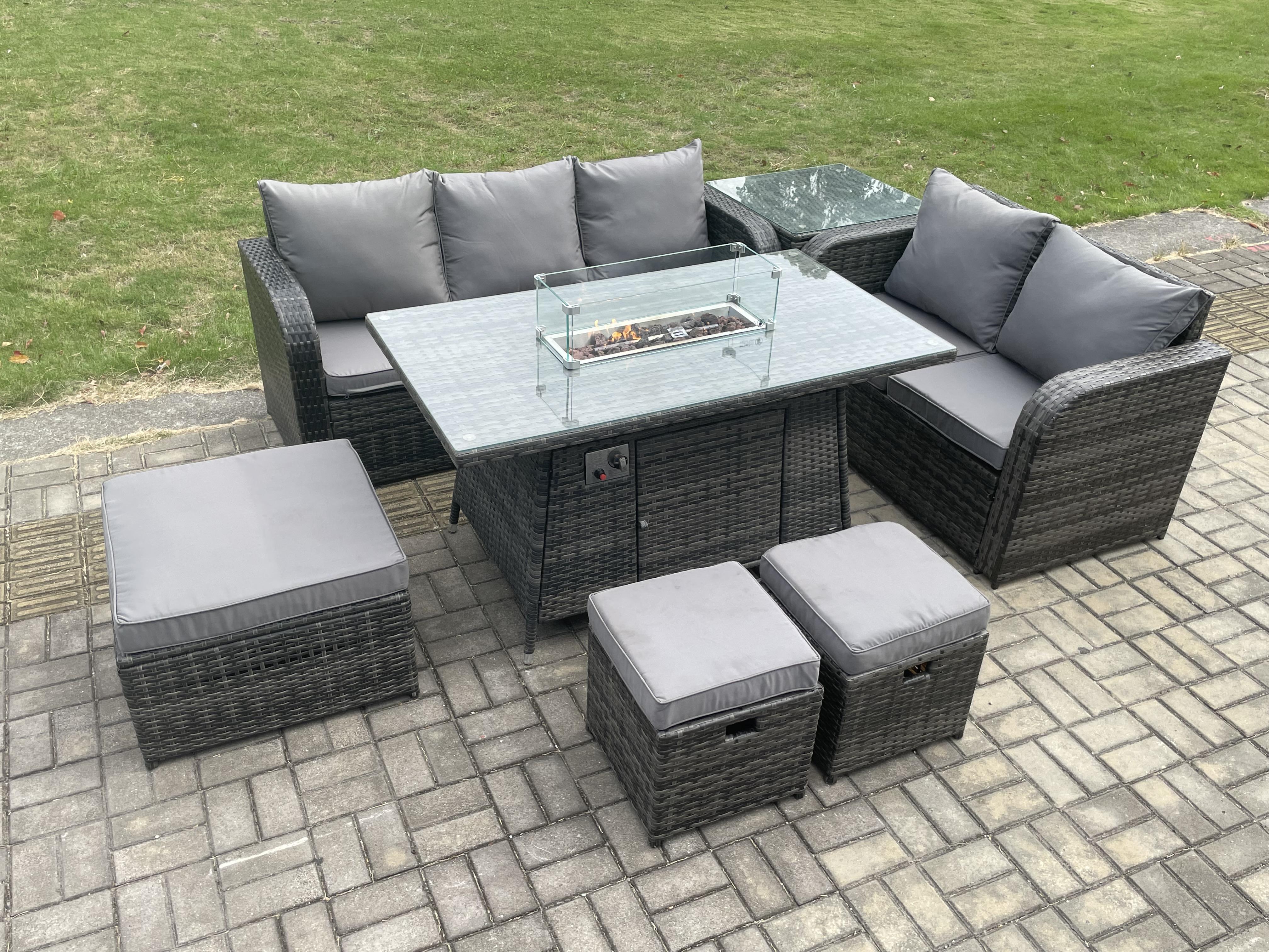 Polyrattan Gartenmöbel Set Garten Sofa im Freien Gasfeuerstelle Esstisch Set mit Beistelltisch 3 Hockern Dunkelgrau Gemischt
