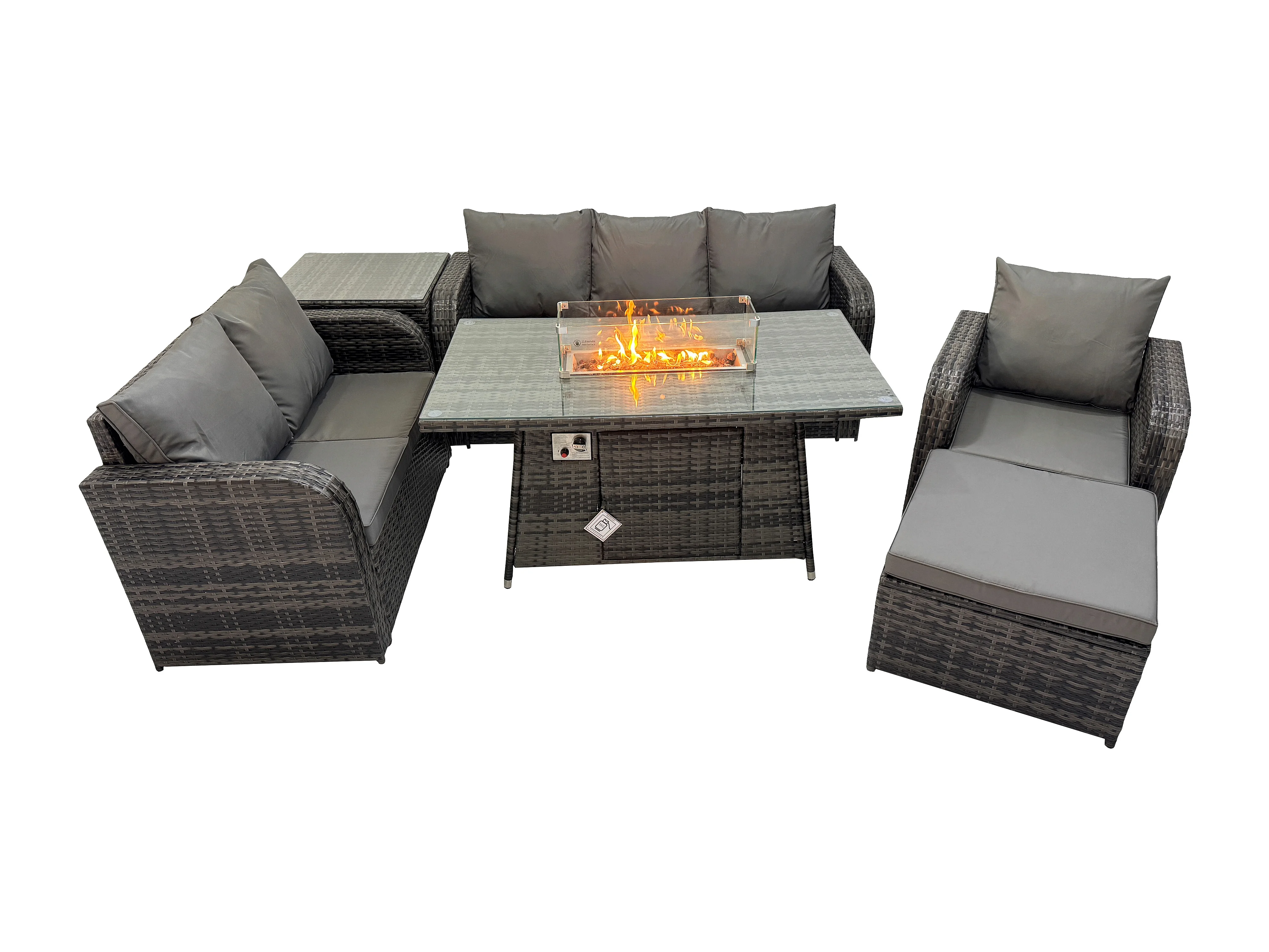 Polyrattan Gartenmöbel Set Garten Sofa im Freien Gasfeuerstelle Esstisch und Sofa Sessel set mit Beistelltisch 2 Großer Hockern