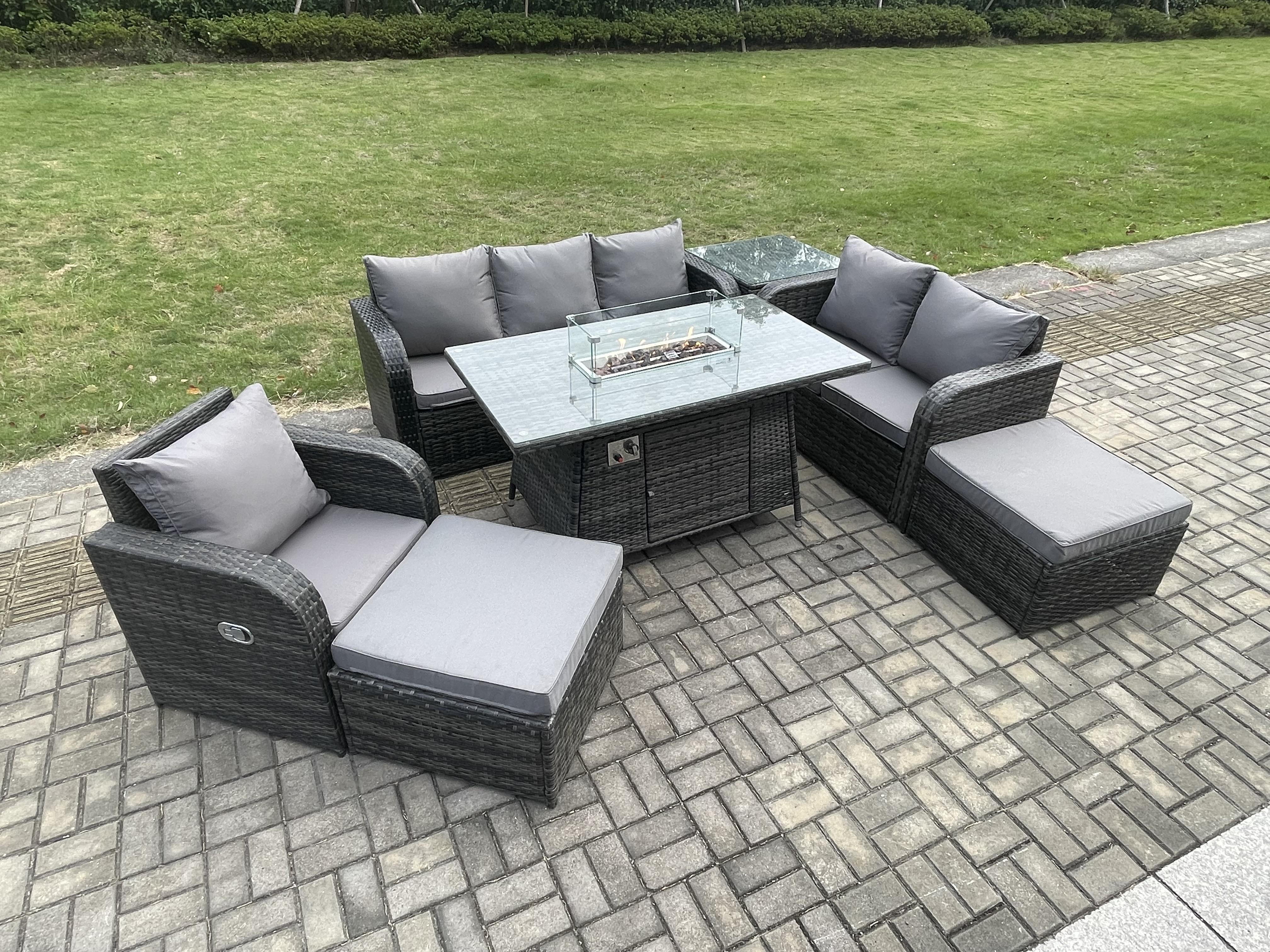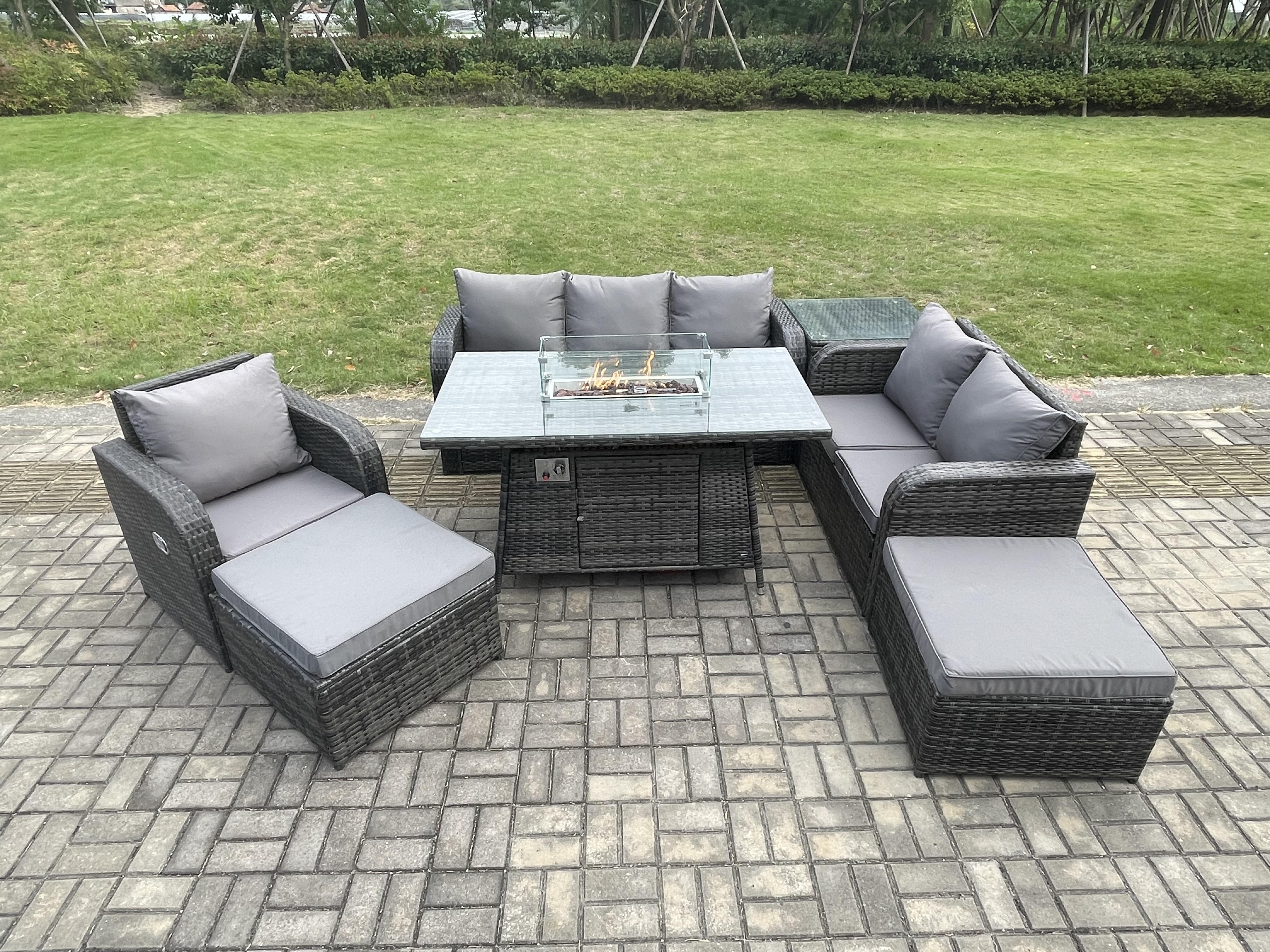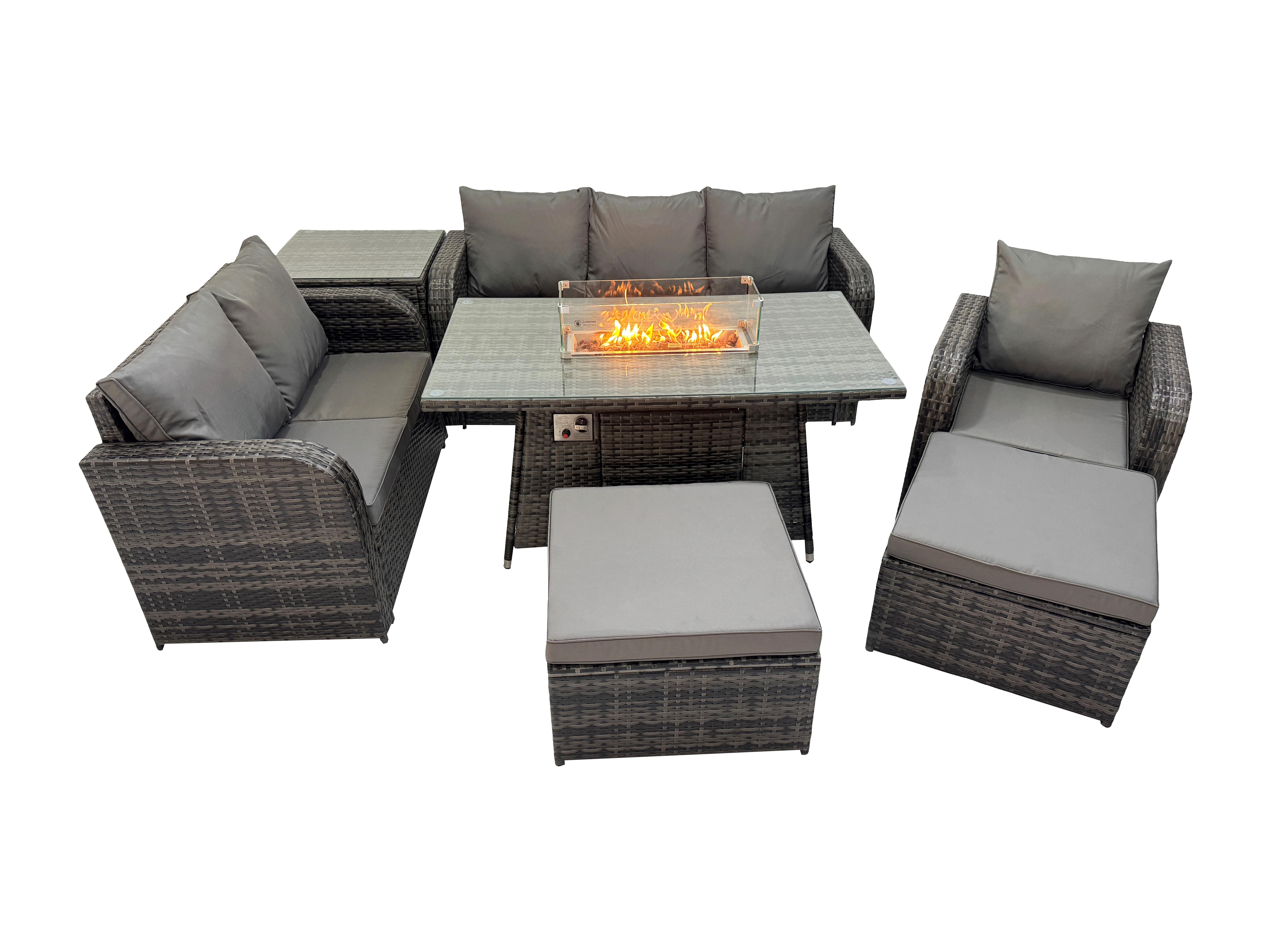 Polyrattan Gartenmöbel Set Garten Sofa im Freien Gasfeuerstelle Esstisch und Sofa Sessel set mit Beistelltischen 2 hohen Hockern
