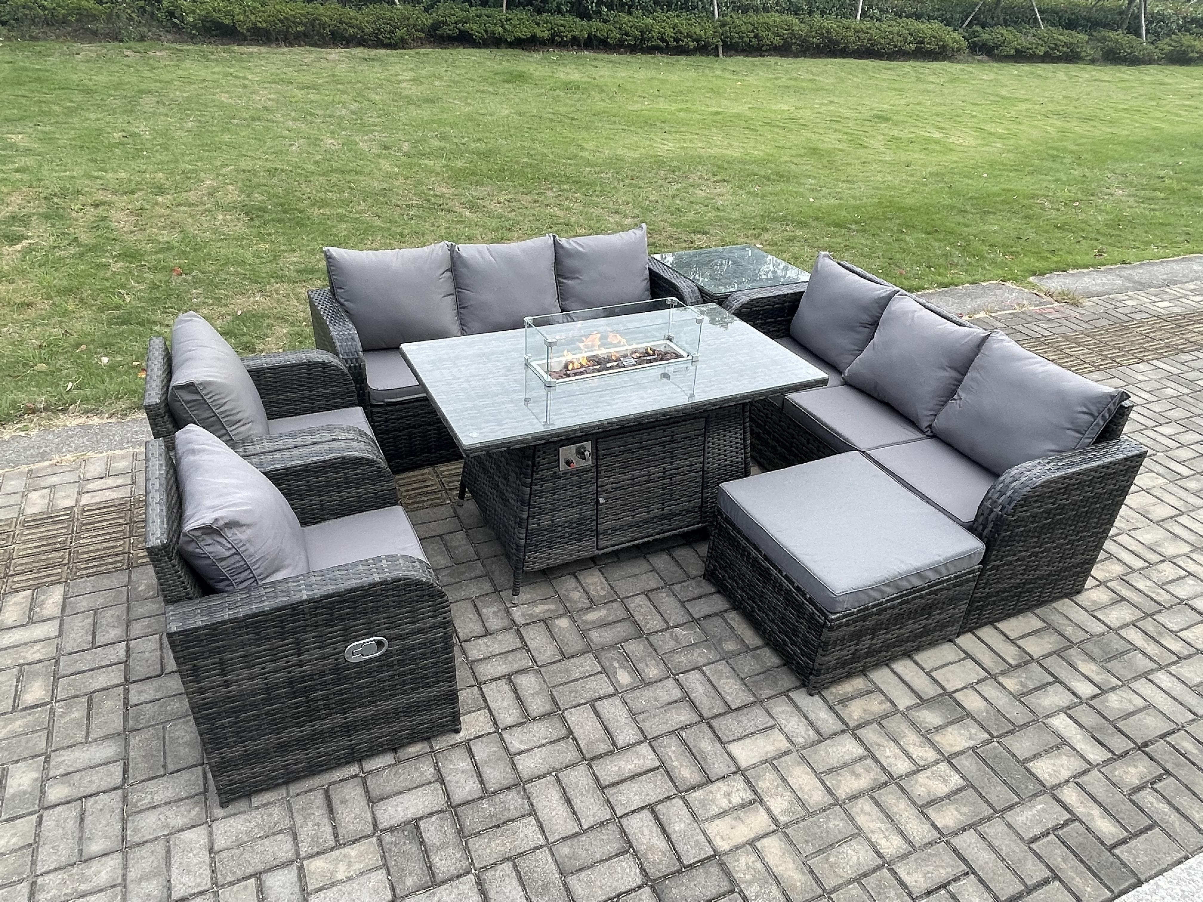 Polyrattan Gartenmöbel Set Garten Sofa im Freien Gasfeuerstelle Esstisch und Sofa set mit Sessel Beistelltisch 2 Großer Hockern