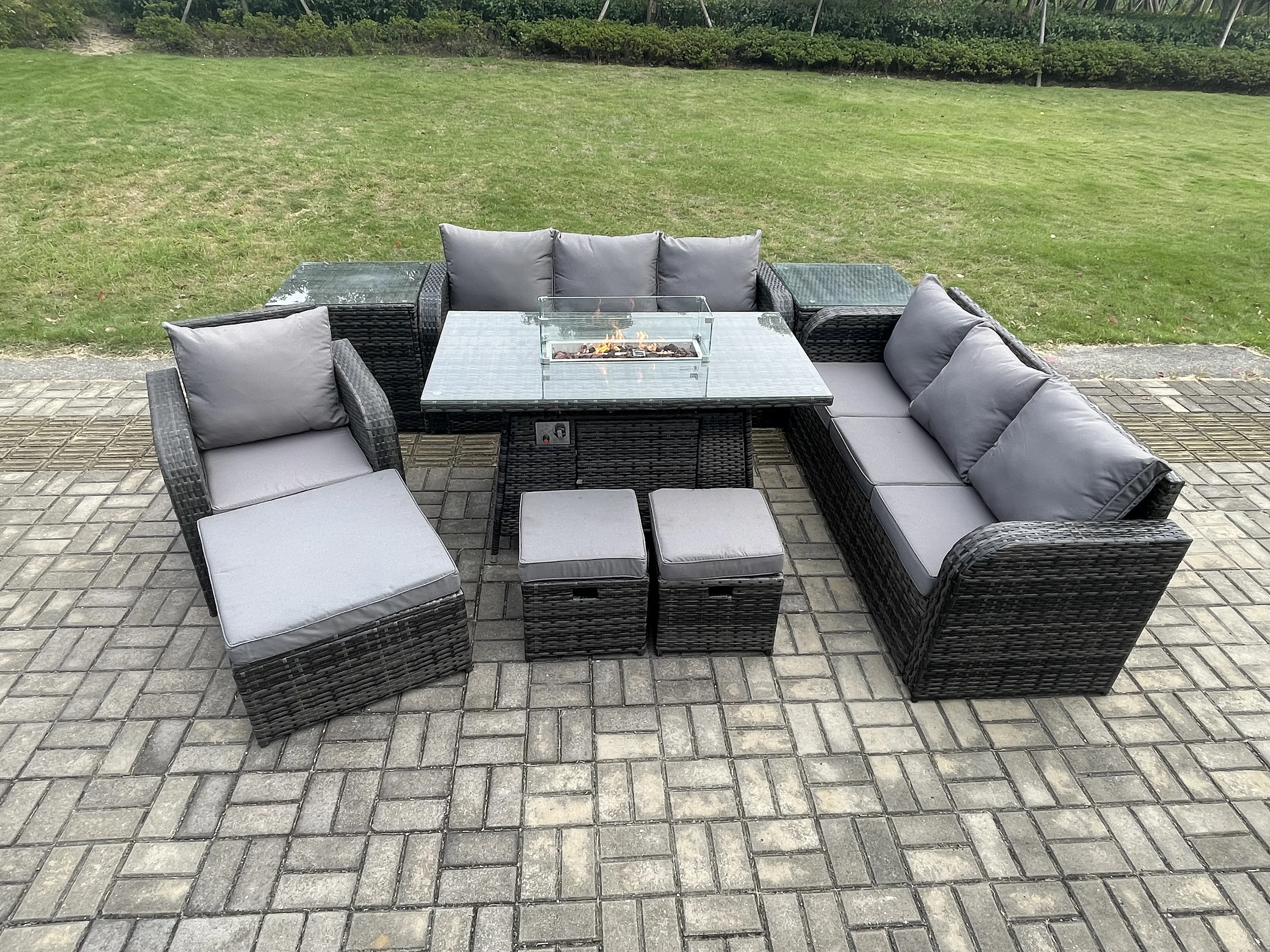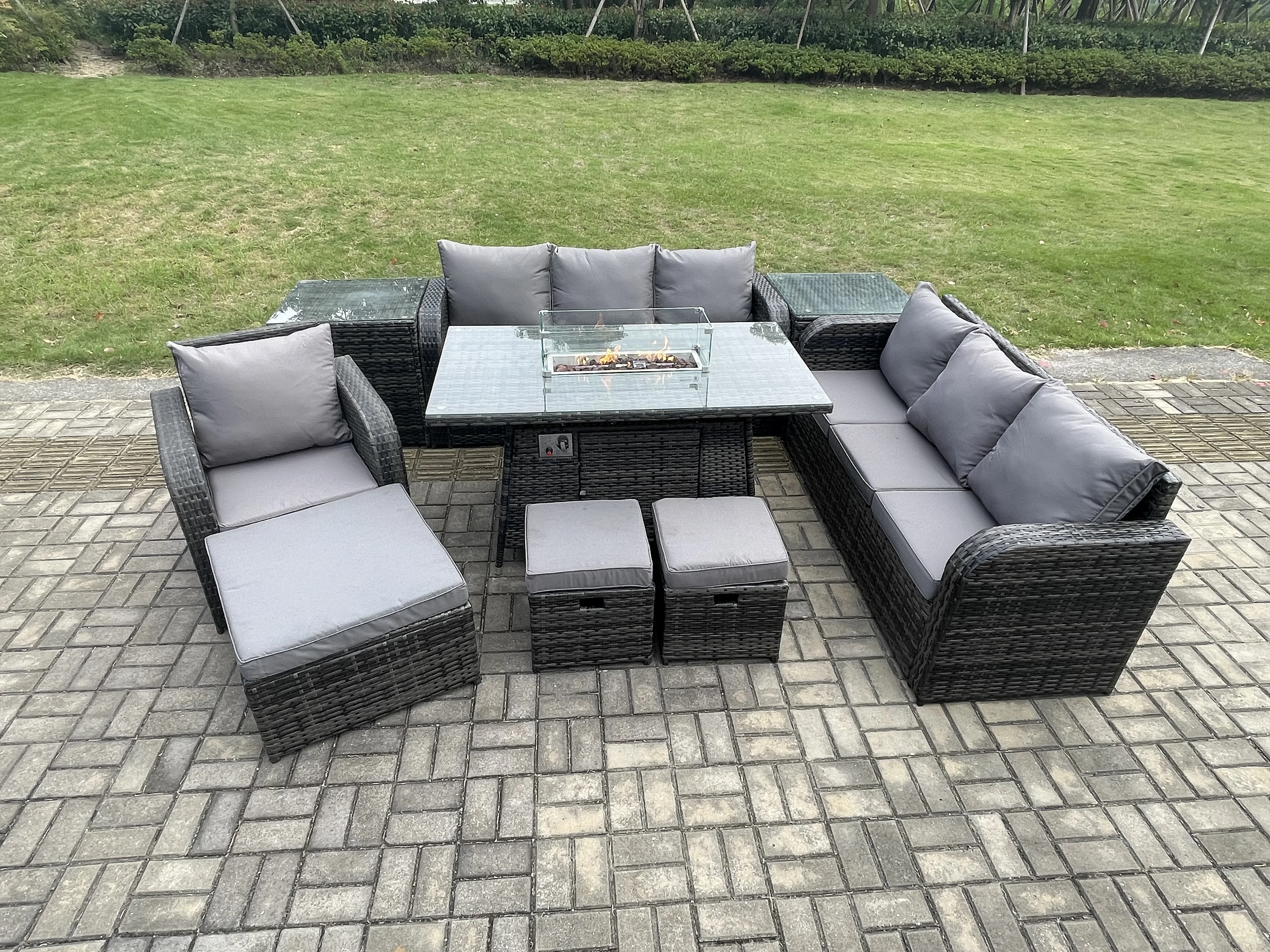 Polyrattan Gartenmöbel Set Gas Feuerstelle Esstisch Liegestühle 3-Sitzer Sofa Set mit 2 Beistelltischen 3 Hockern 10-Sitzer