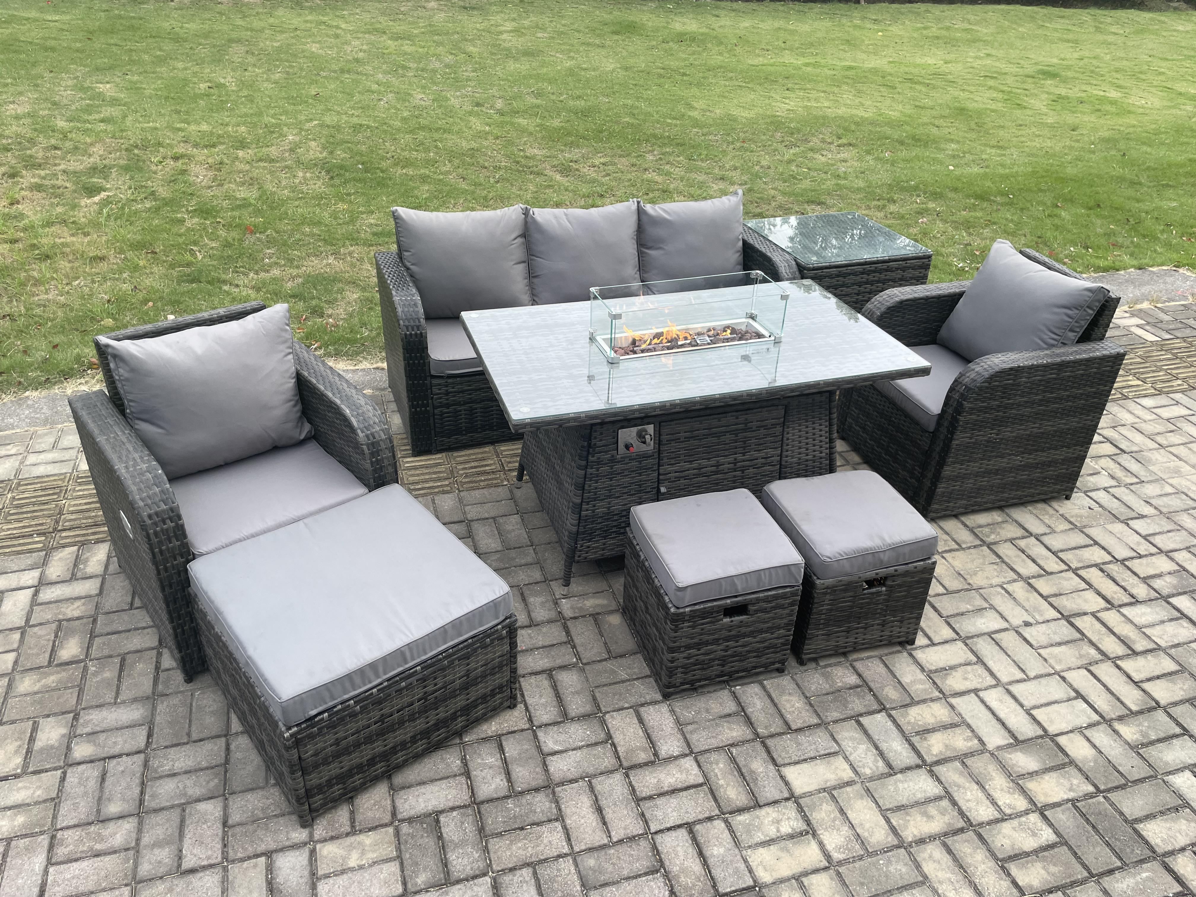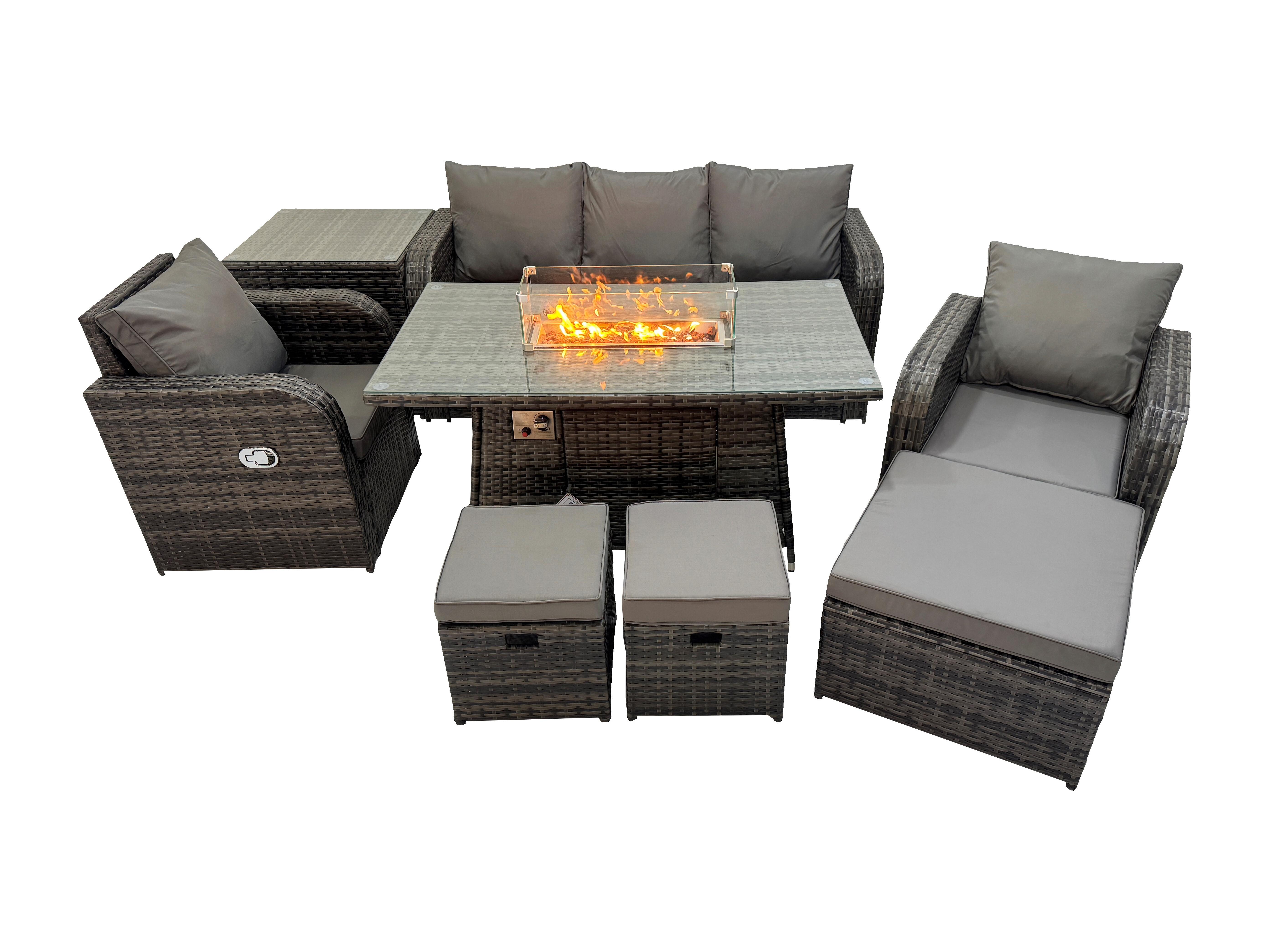 Polyrattan Gartenmöbel set Gas Feuerstelle Esstisch mit Beistelltisch Sessel 3 Hockern