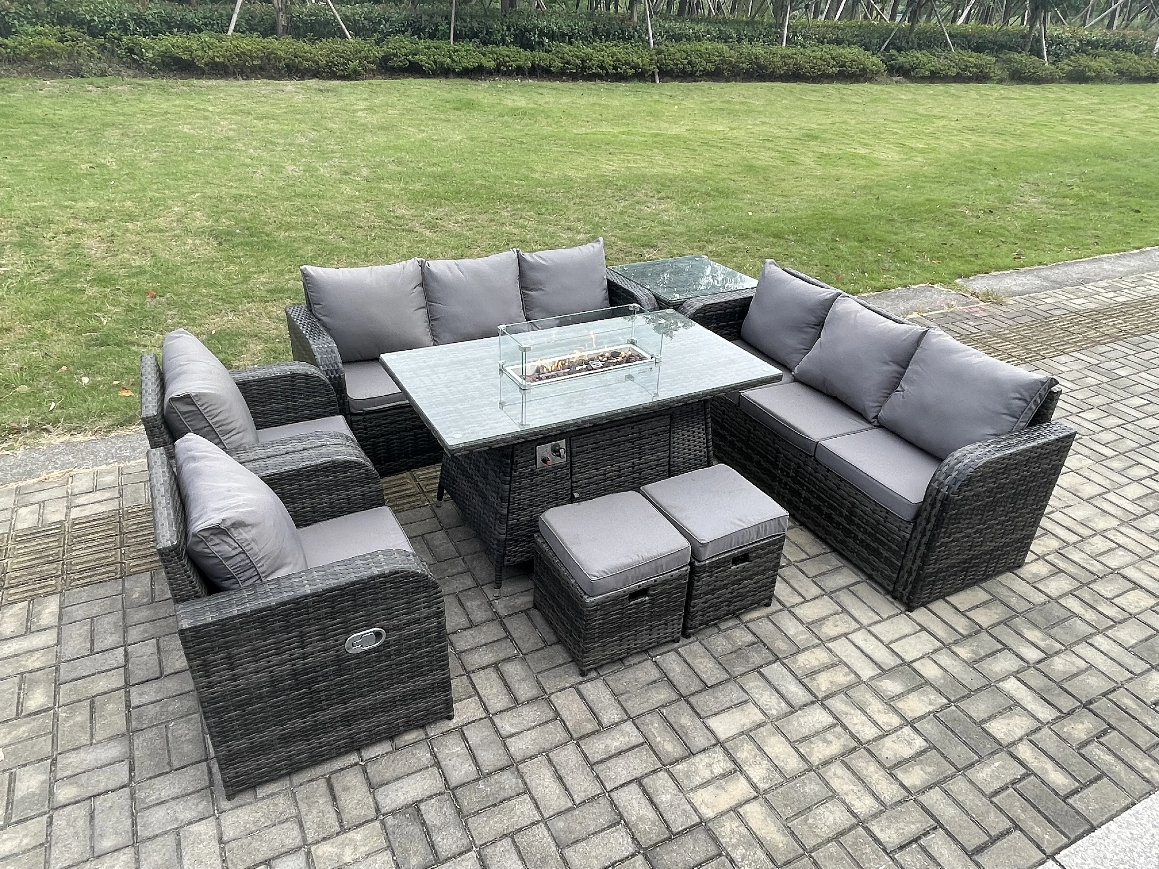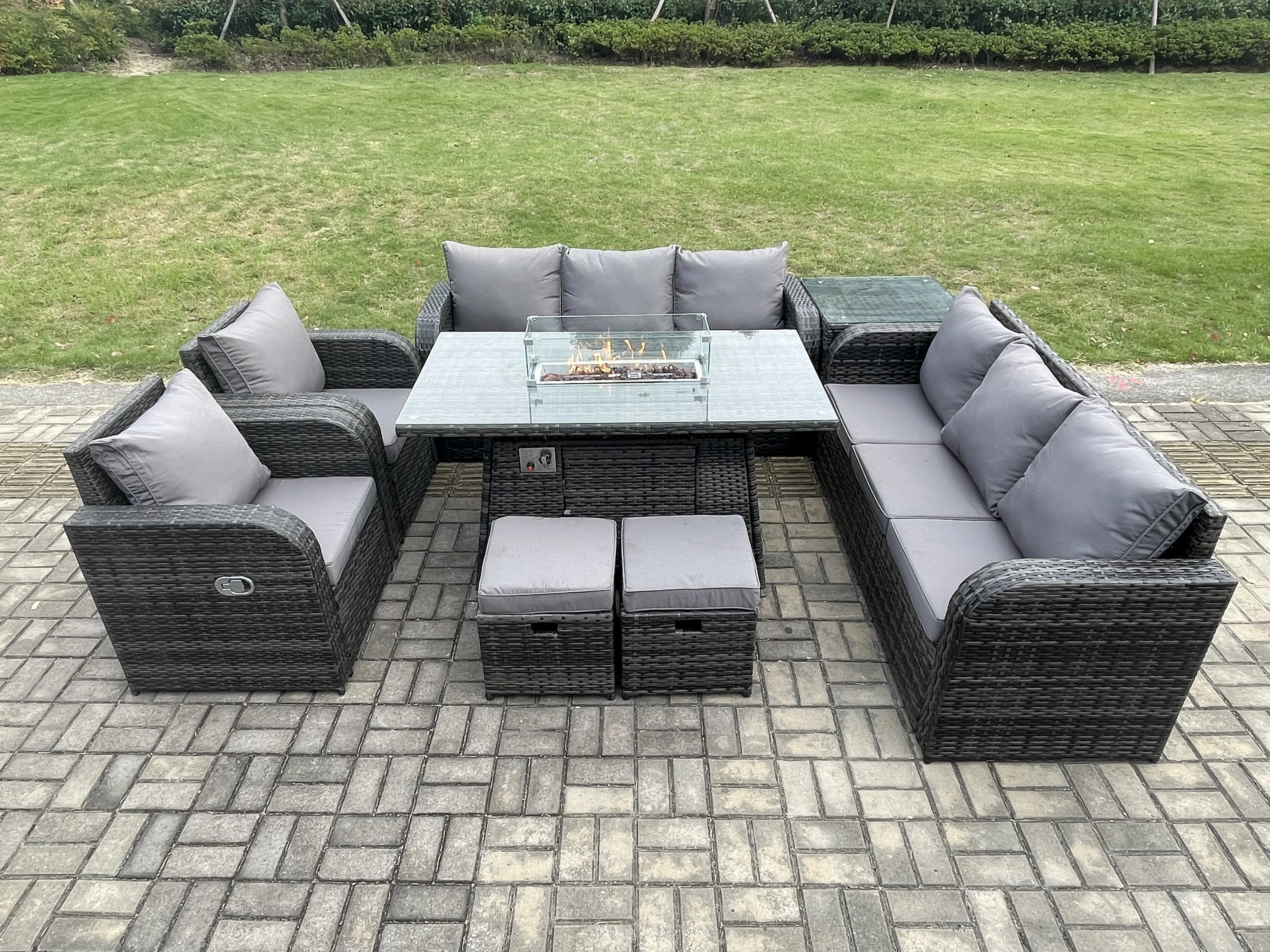 Polyrattan Gartenmöbel Set Gas Feuerstelle Esstisch mit Beistelltisch Sessel Loveseat Sofa 2 Hockern