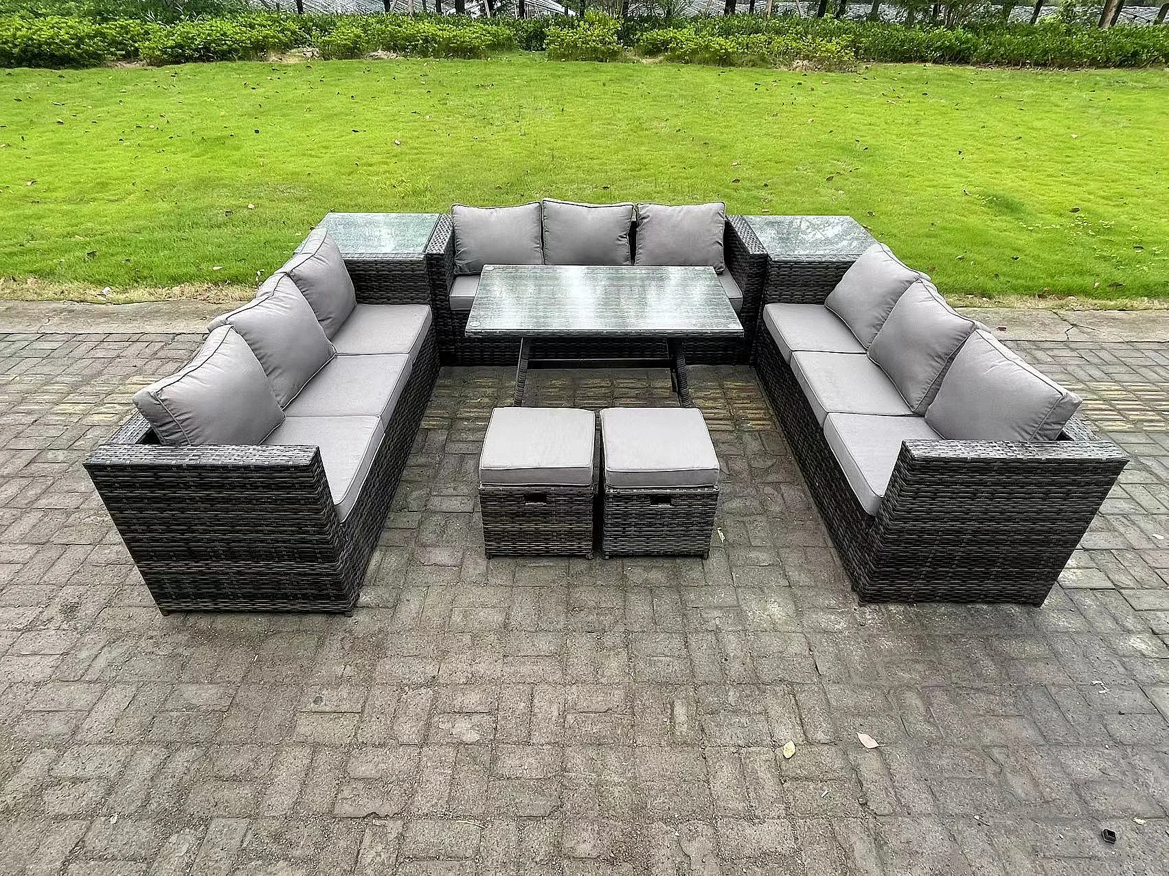 Polyrattan Gartenmöbel Set im Balkon Lounge Sofa Garten Esstisch Set mit 2 Beistelltischen 2 kleine Fußhockern Dunkelgrau Gemischt