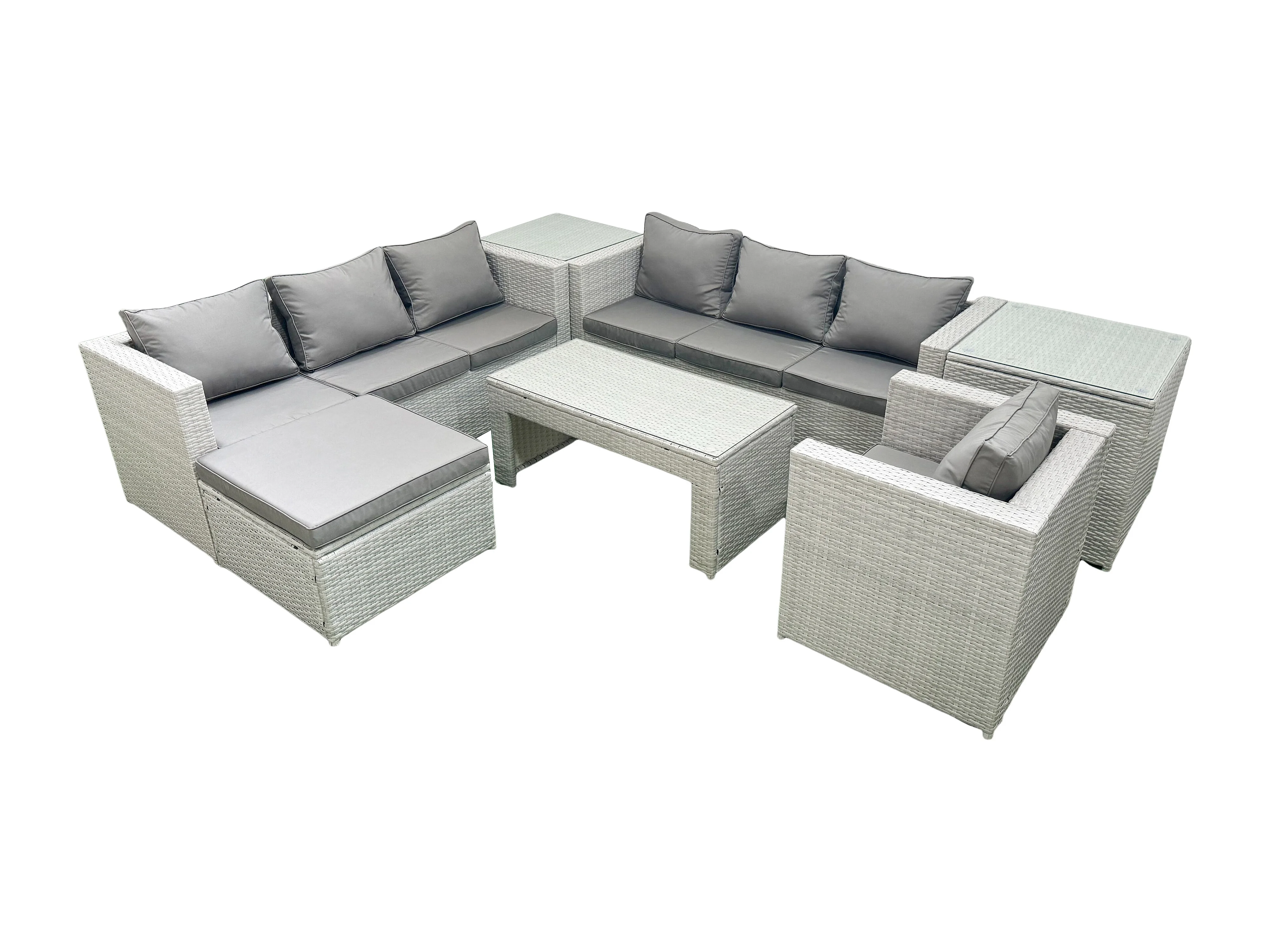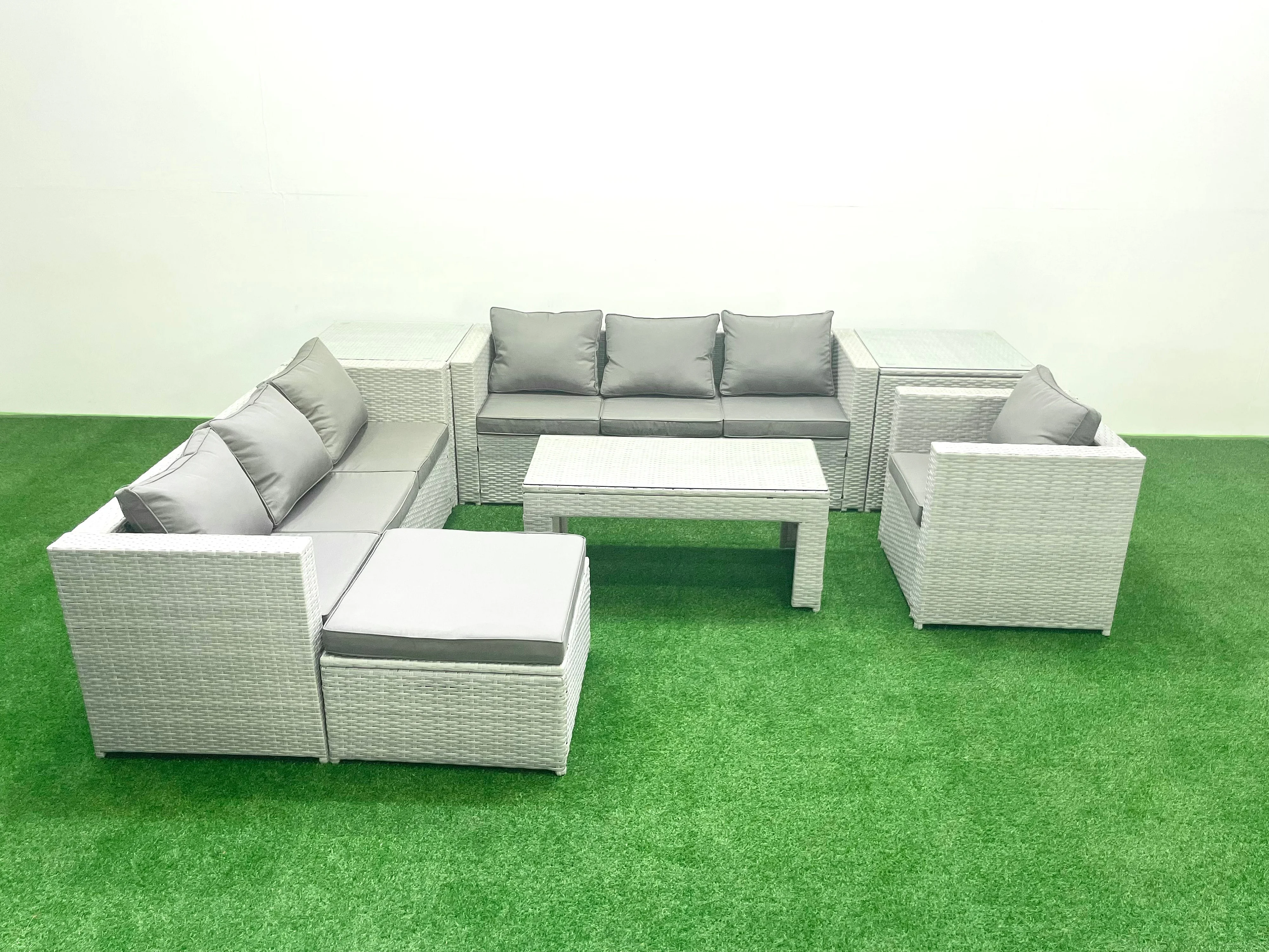 Polyrattan Gartenmöbel-Set im Freien mit Rechteckiger Couchtisch Sessel 2 Großer Hockern 2 Beistelltischen Hellgrau gemischt