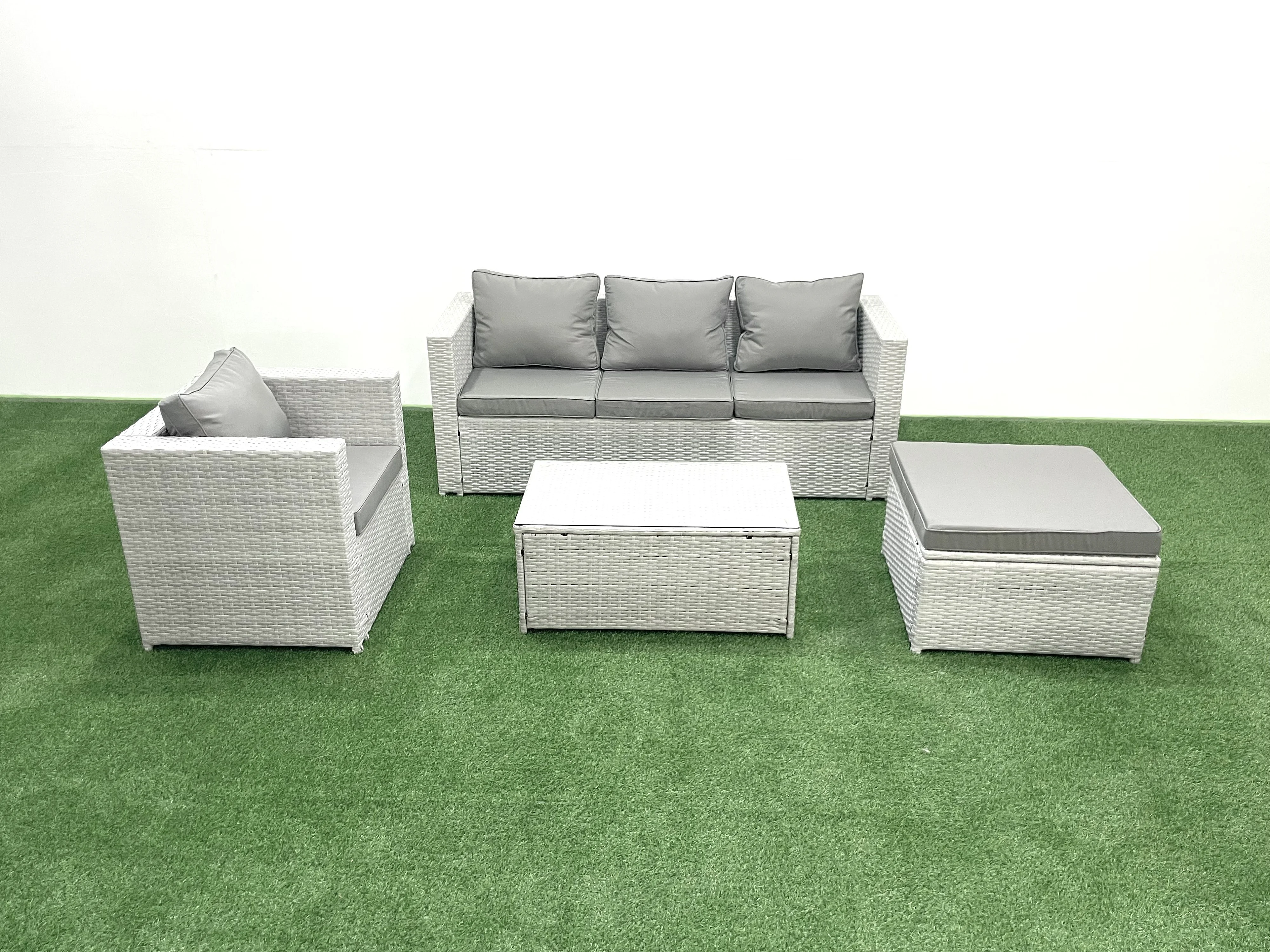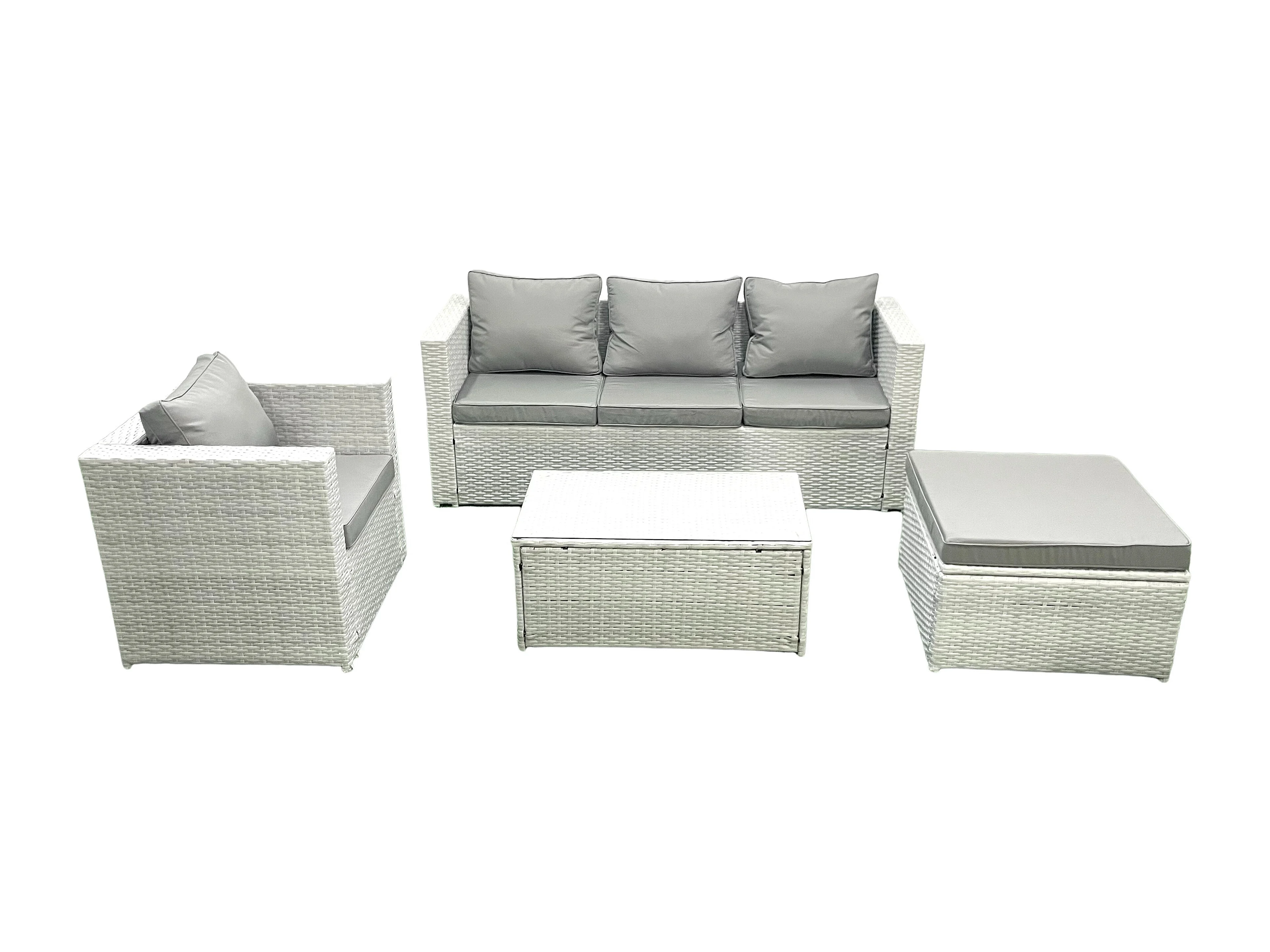 Polyrattan Gartenmöbel Set mit 3-Sitzer Sofa Sessel Rechteckiger Couchtisch 2 Großer Hockern Hellgrau gemischt 5-Sitzer