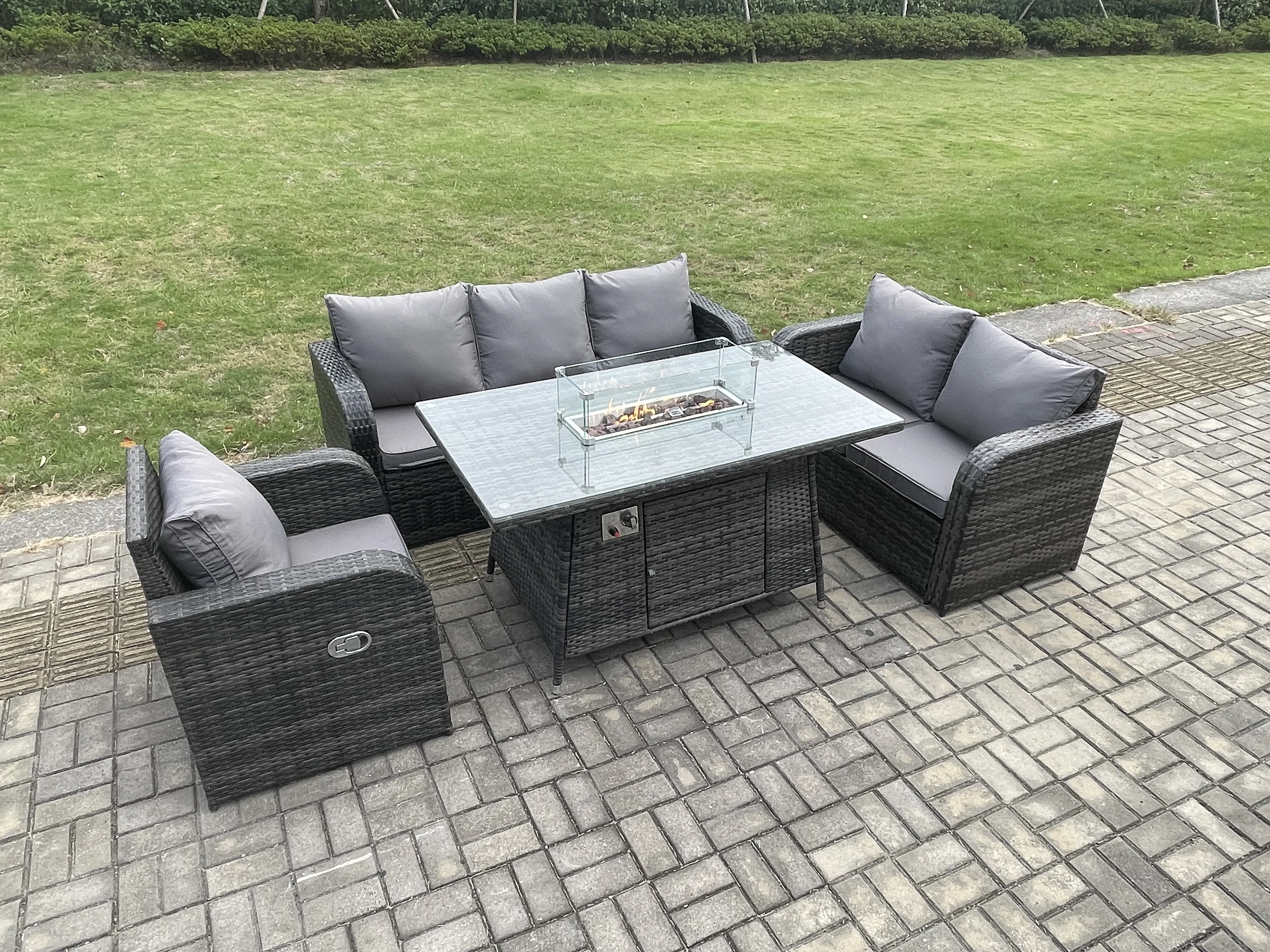 Polyrattan Gartenmöbel Set mit Gasfeuerstelle Esstisch 6-Sitzer Garten Sofa im Freien Set Dunkelgrau Gemischt