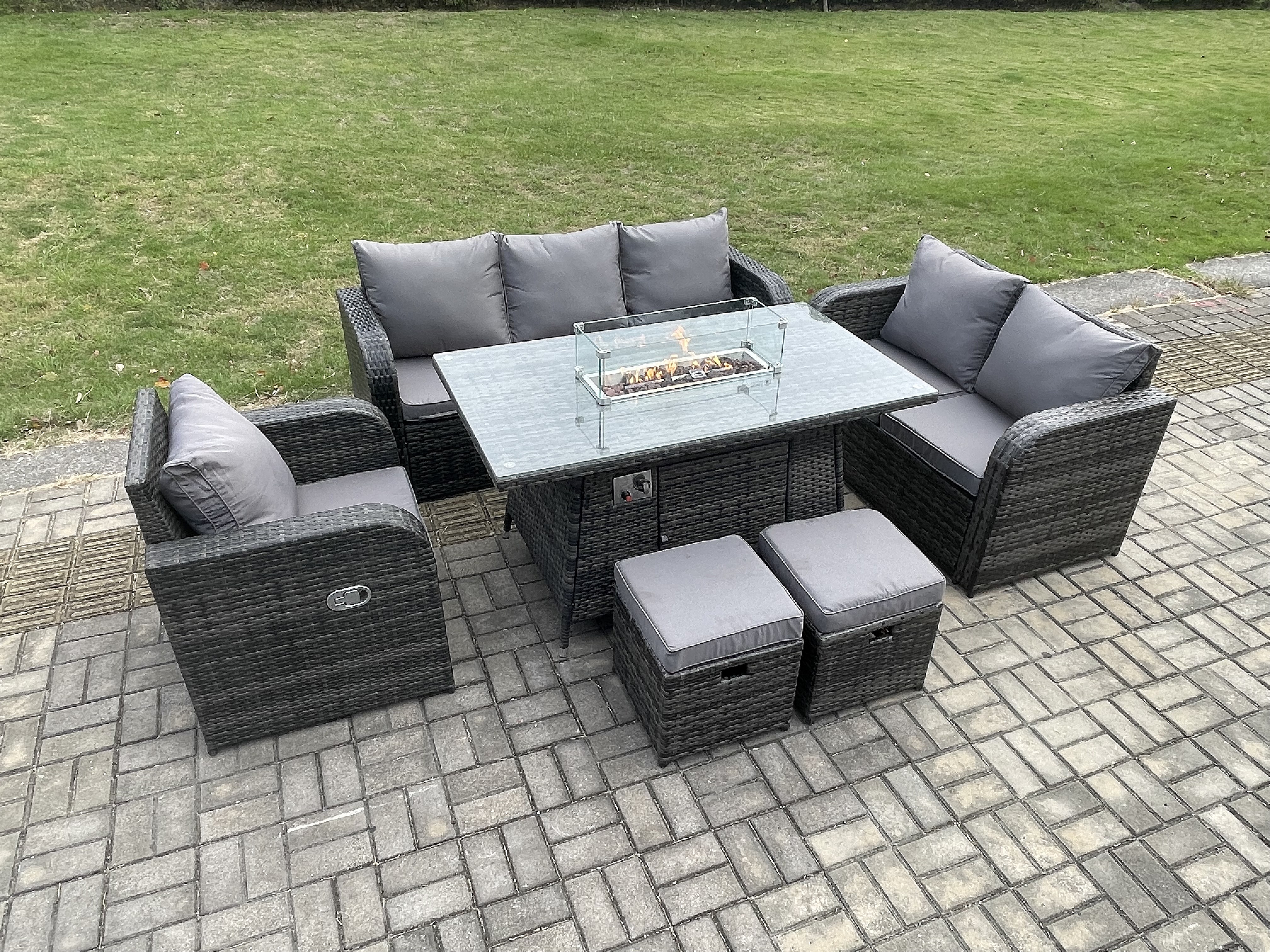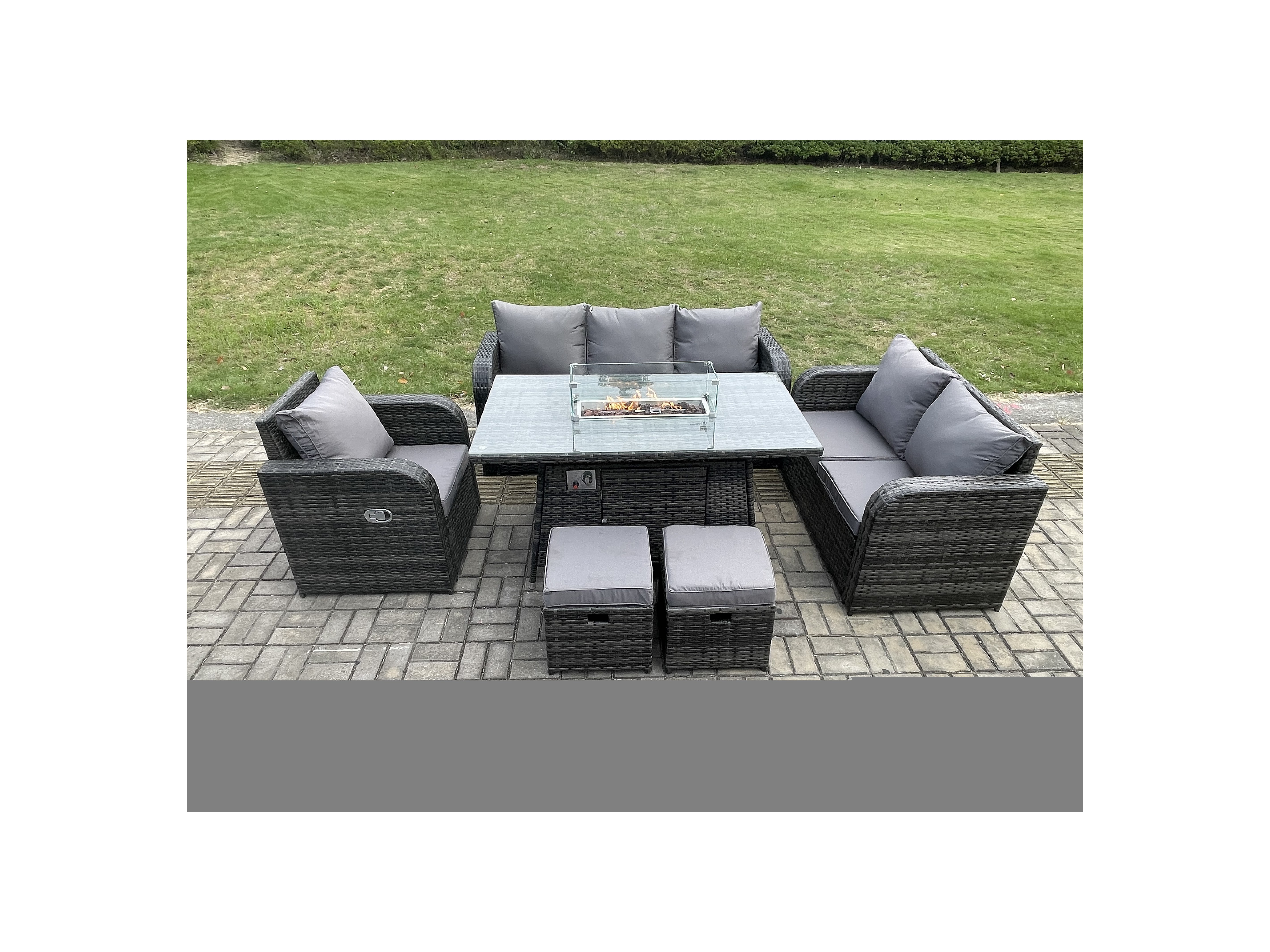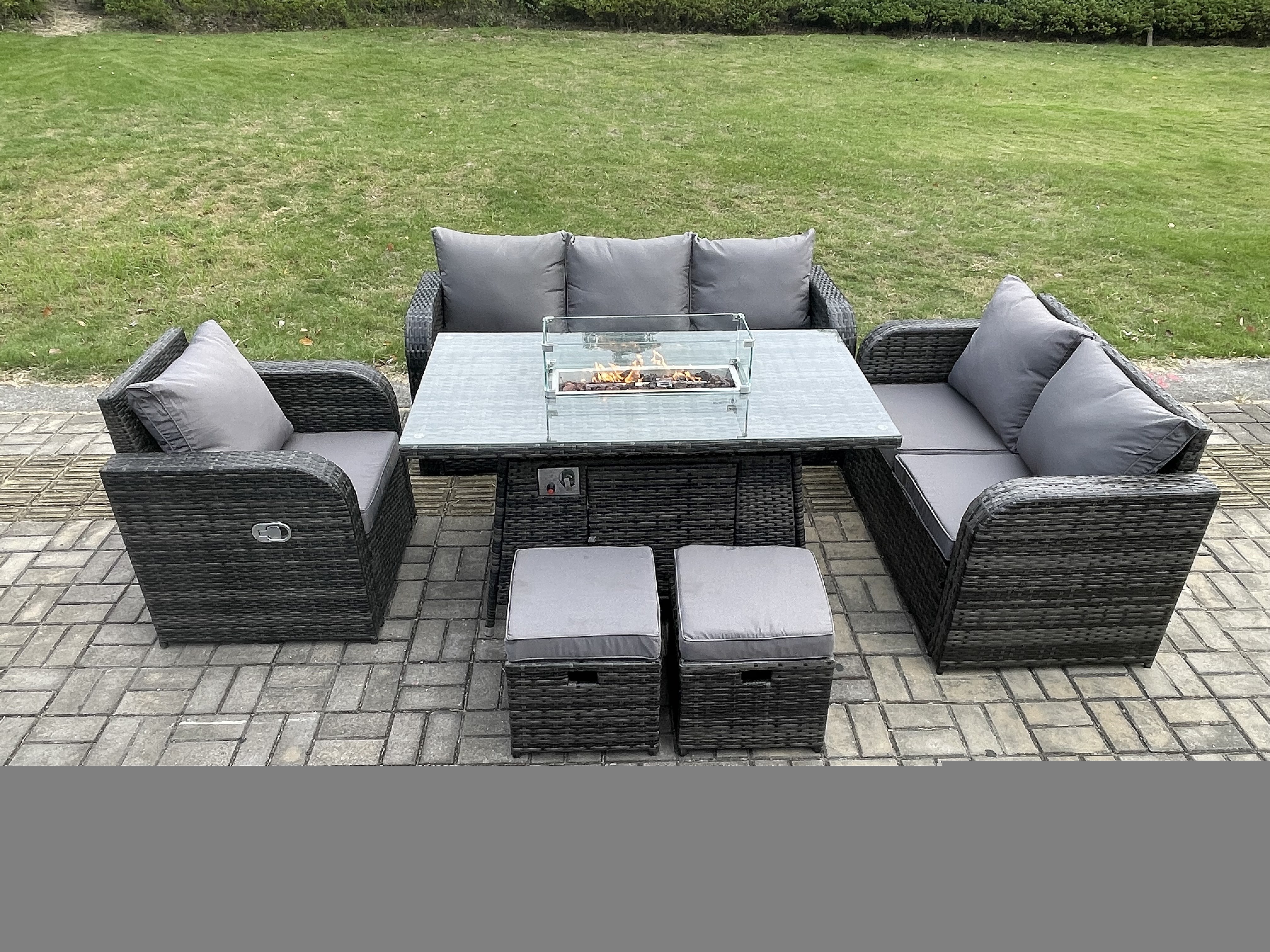 Polyrattan Gartenmöbel Set mit Gasfeuerstelle Esstisch 8-Sitzer Garten Sofa im Freien Set Dunkelgrau Gemischt