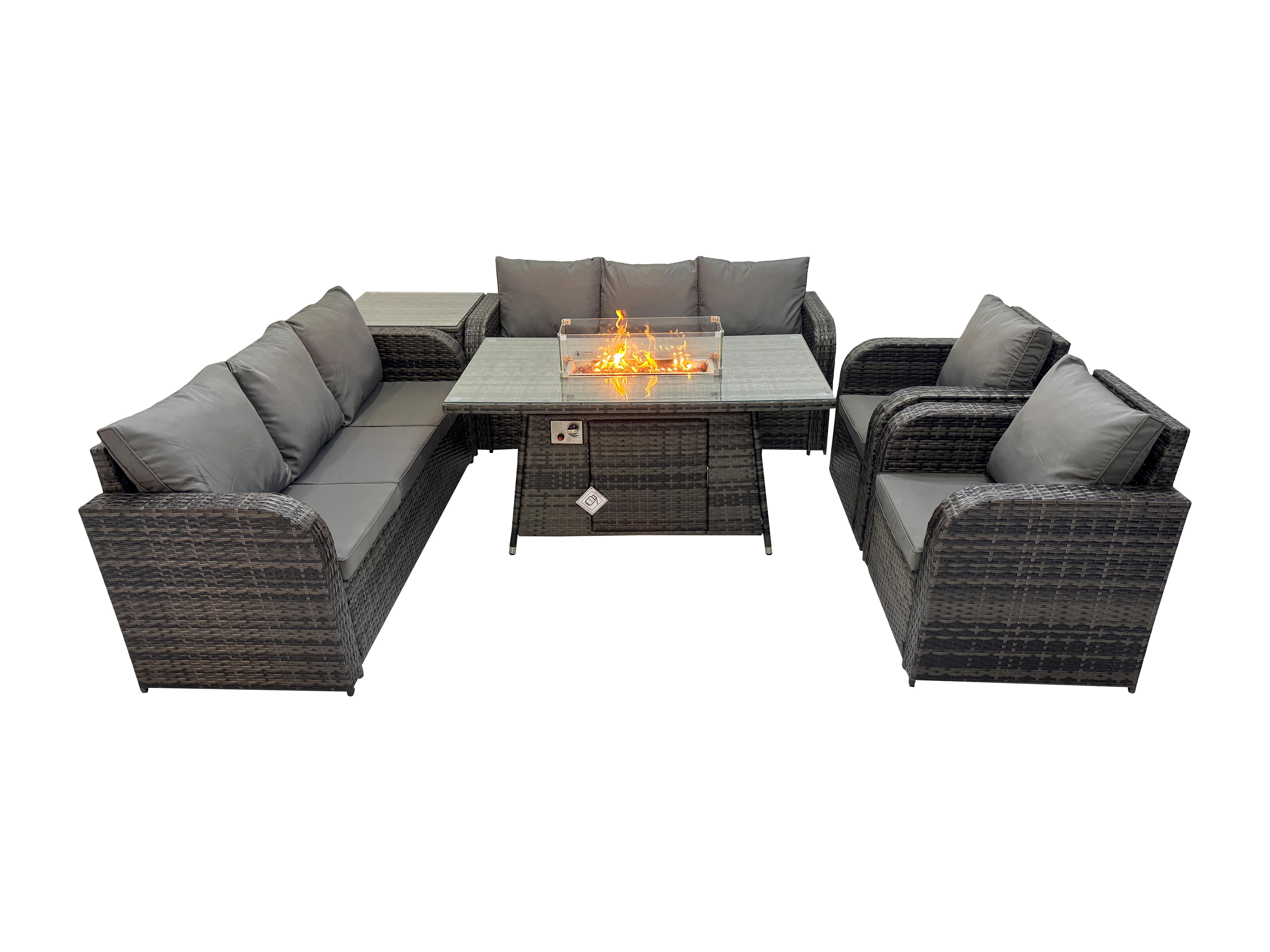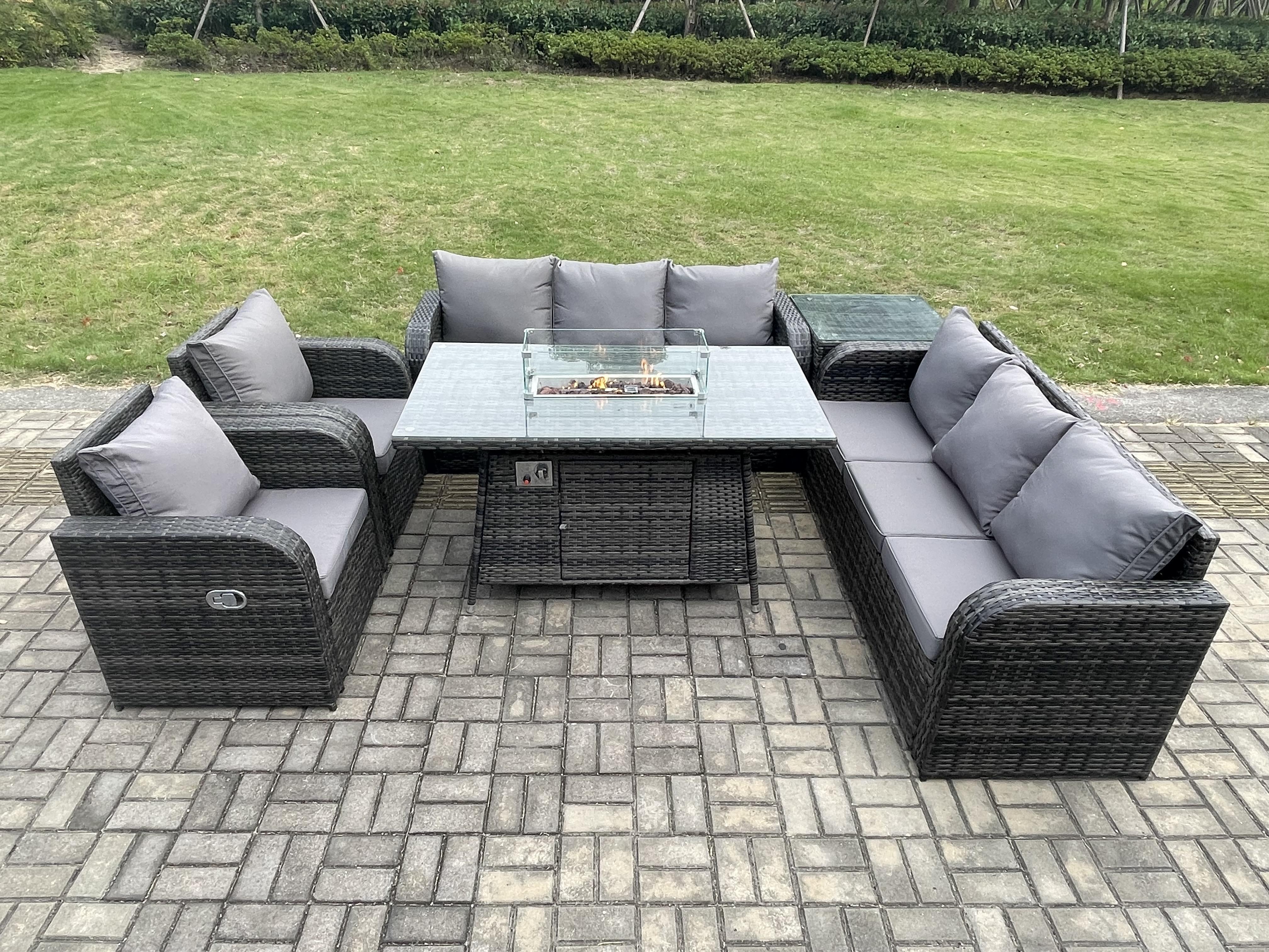 Polyrattan Gartenmöbel Set mit Gasfeuerstelle Esstisch,Sessel und Beistelltisch 8-Sitzer Outdoor Garten Lounge Set Dunkelgrau Gemischt