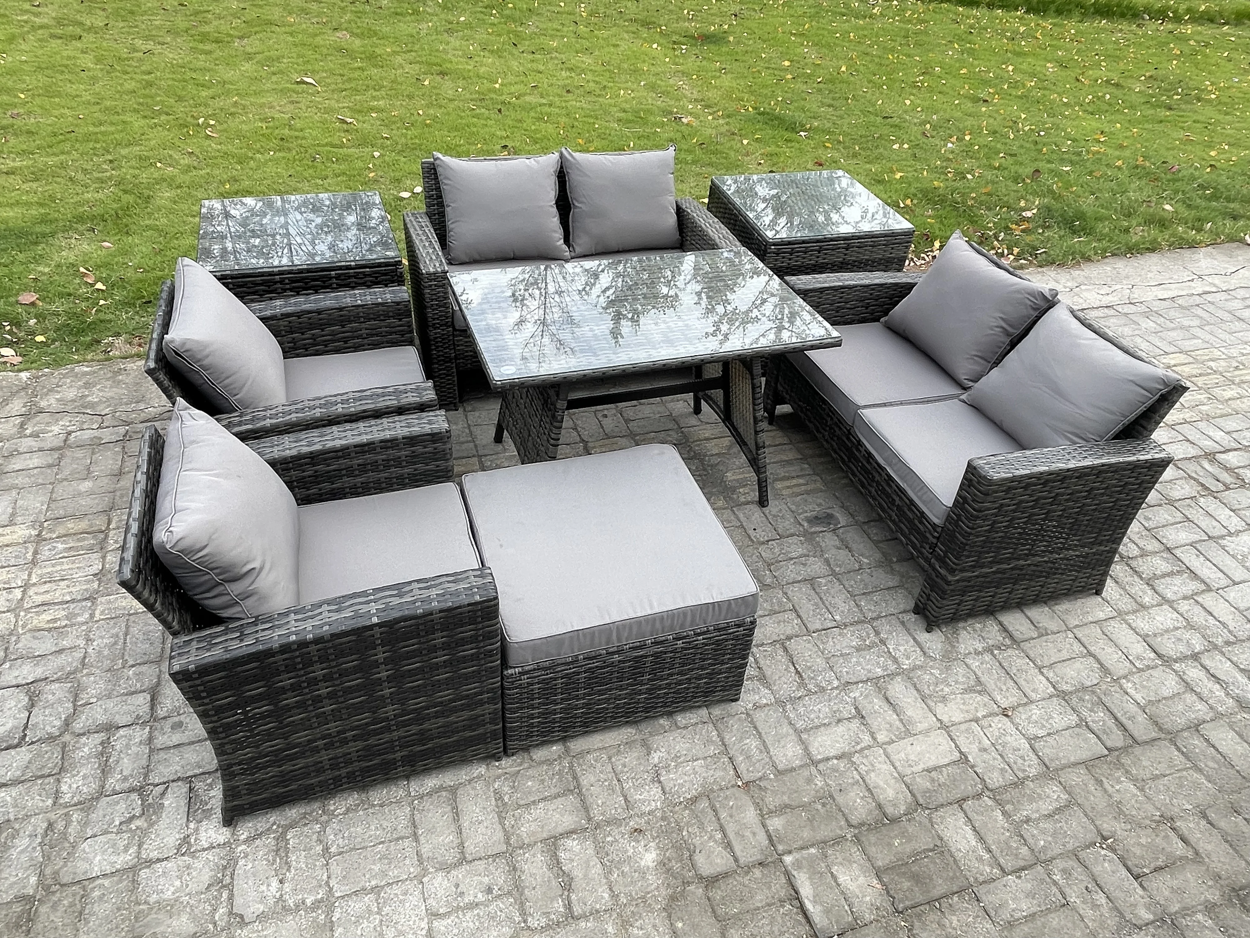 Polyrattan Gartenmöbel Set Polyrattan Garten Sofa im Freien Set mit Rechteckiger Esstisch Doppelsitz Sofa 2 Beistelltischen 2 Großer Hockern Dunkelgrau Gemischt