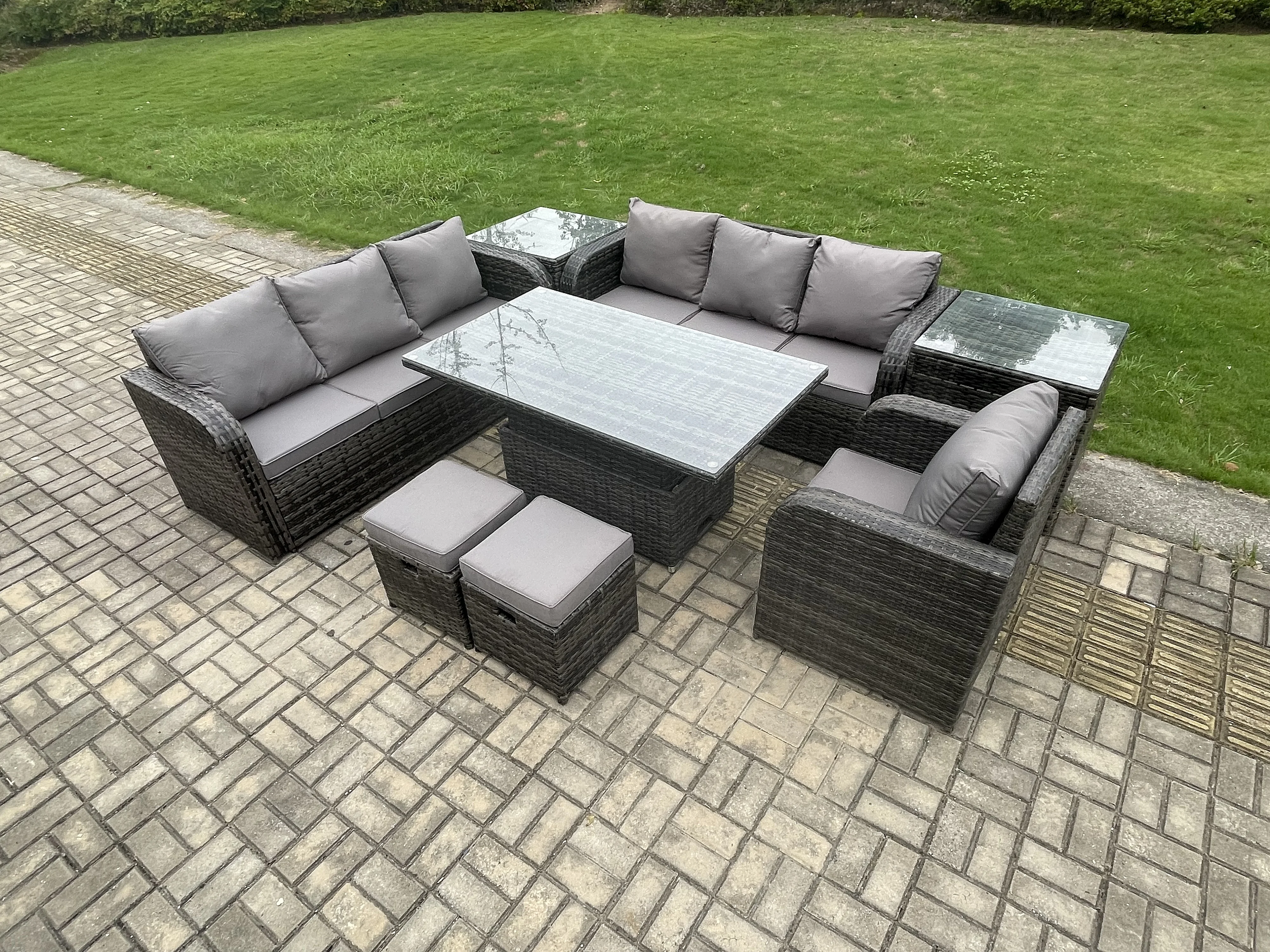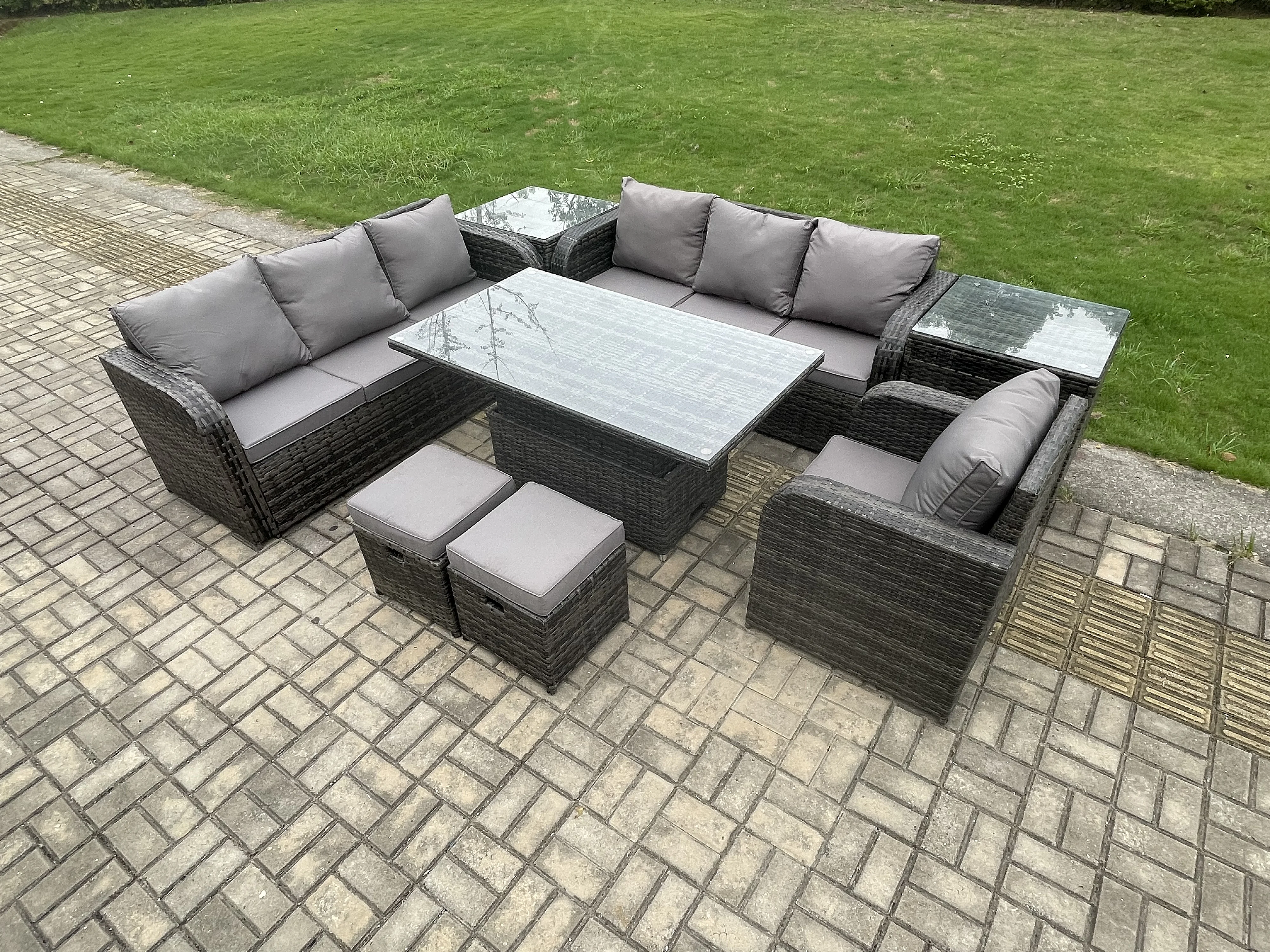 Polyrattan Gartenmöbel-Sets höhenverstellbarer Tisch Sofa Set mit 2 Beistelltischen Liegestühle 2 kleine Fußhockern