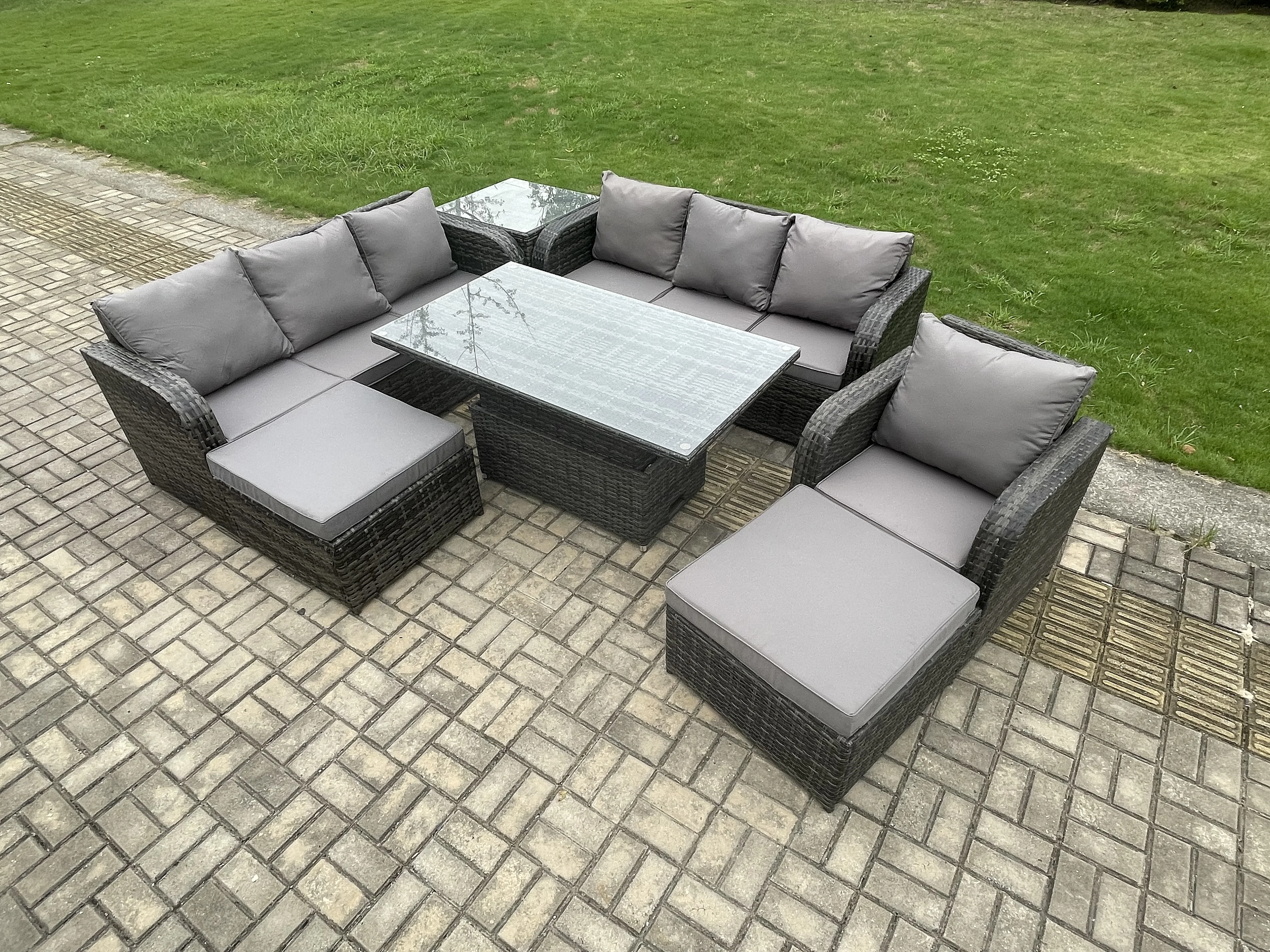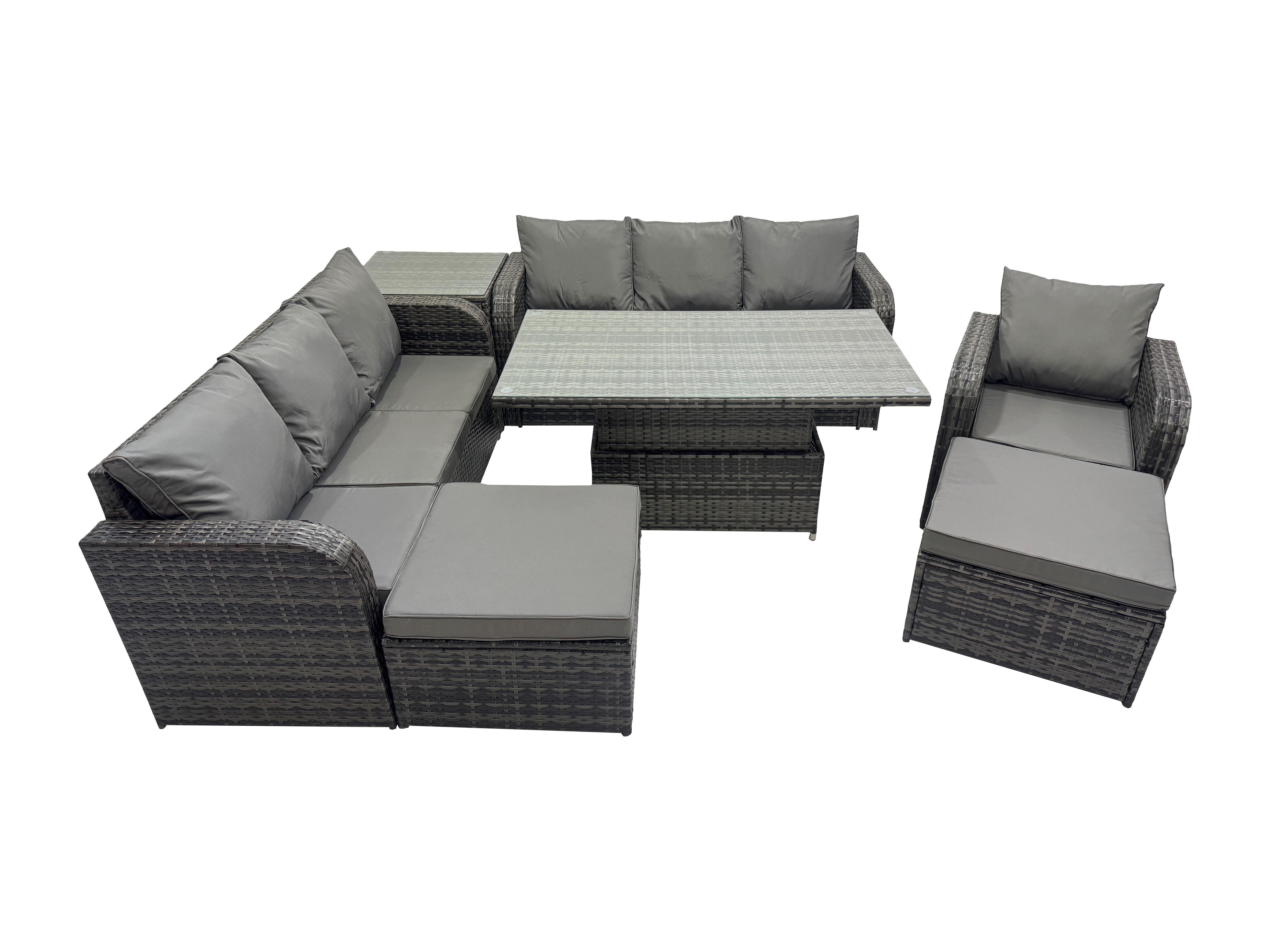 Polyrattan Gartenmöbel-Sets höhenverstellbarer Tisch Sofa Set mit Beistelltischen Liegestühle 2 hohen Hockern
