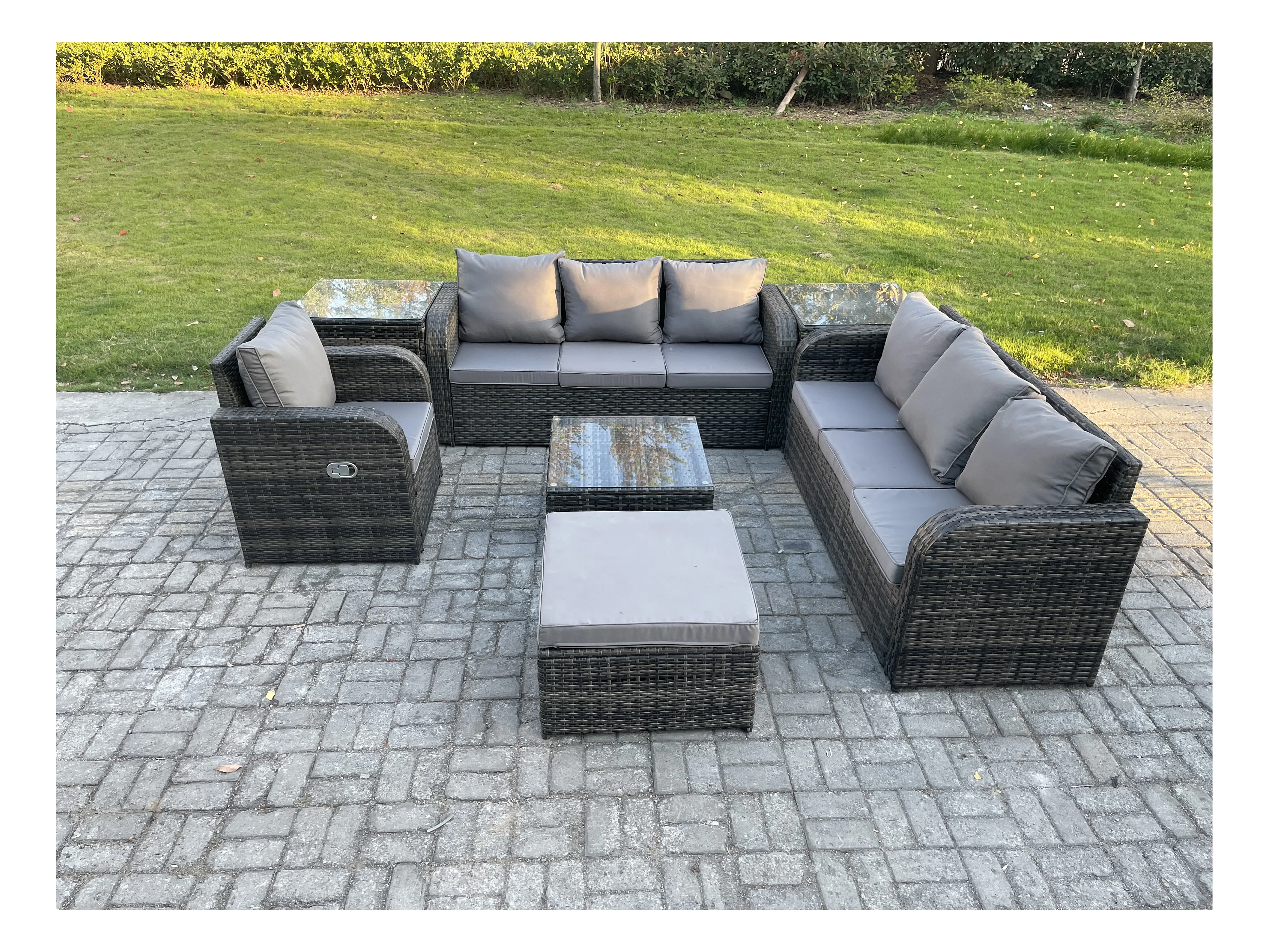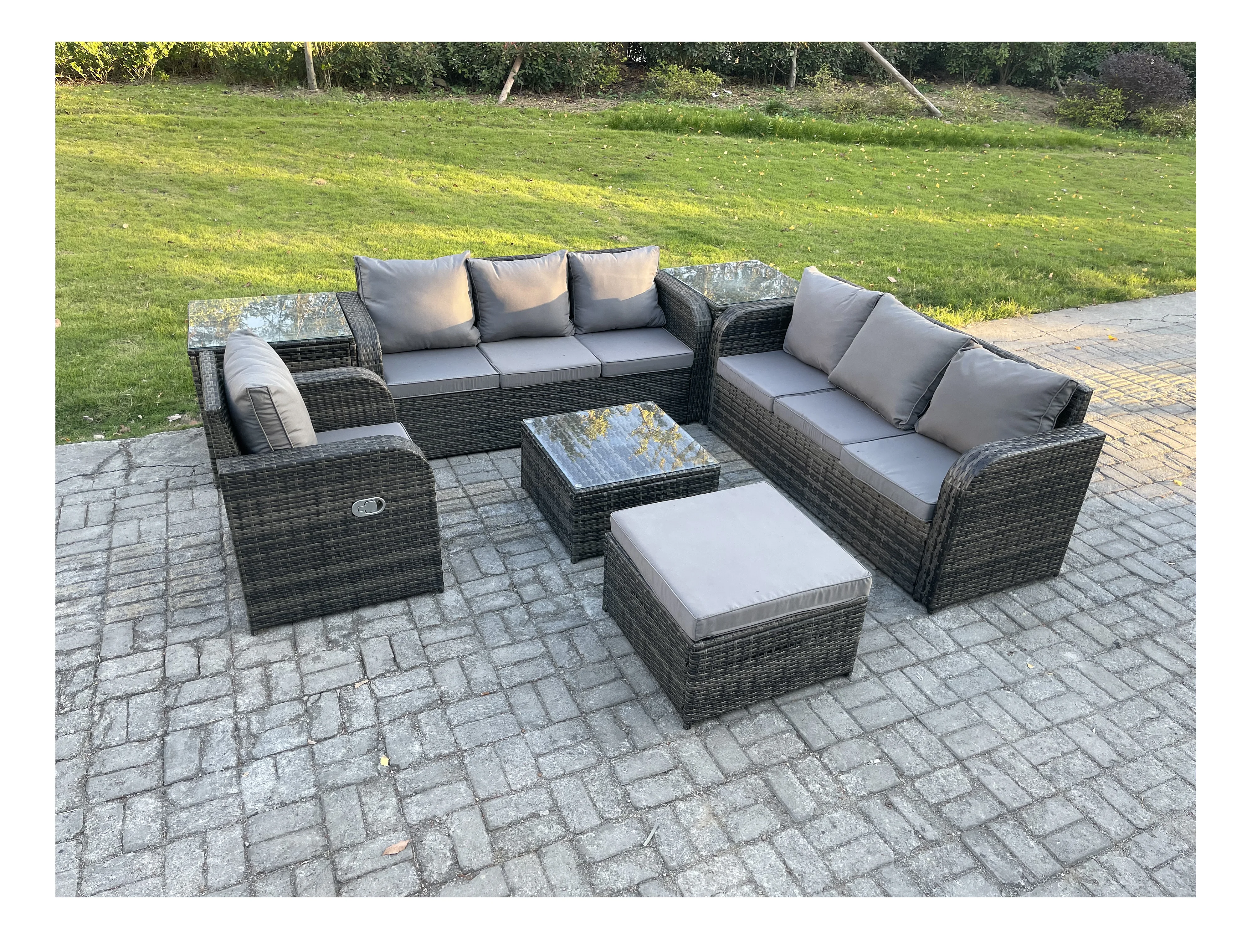 Polyrattan Gartenmöbelset Garten Sofa Couchtisch Set mit Liegestühle 2 Beistelltischen 2 Großer Hockern Dunkelgrau Gemischt