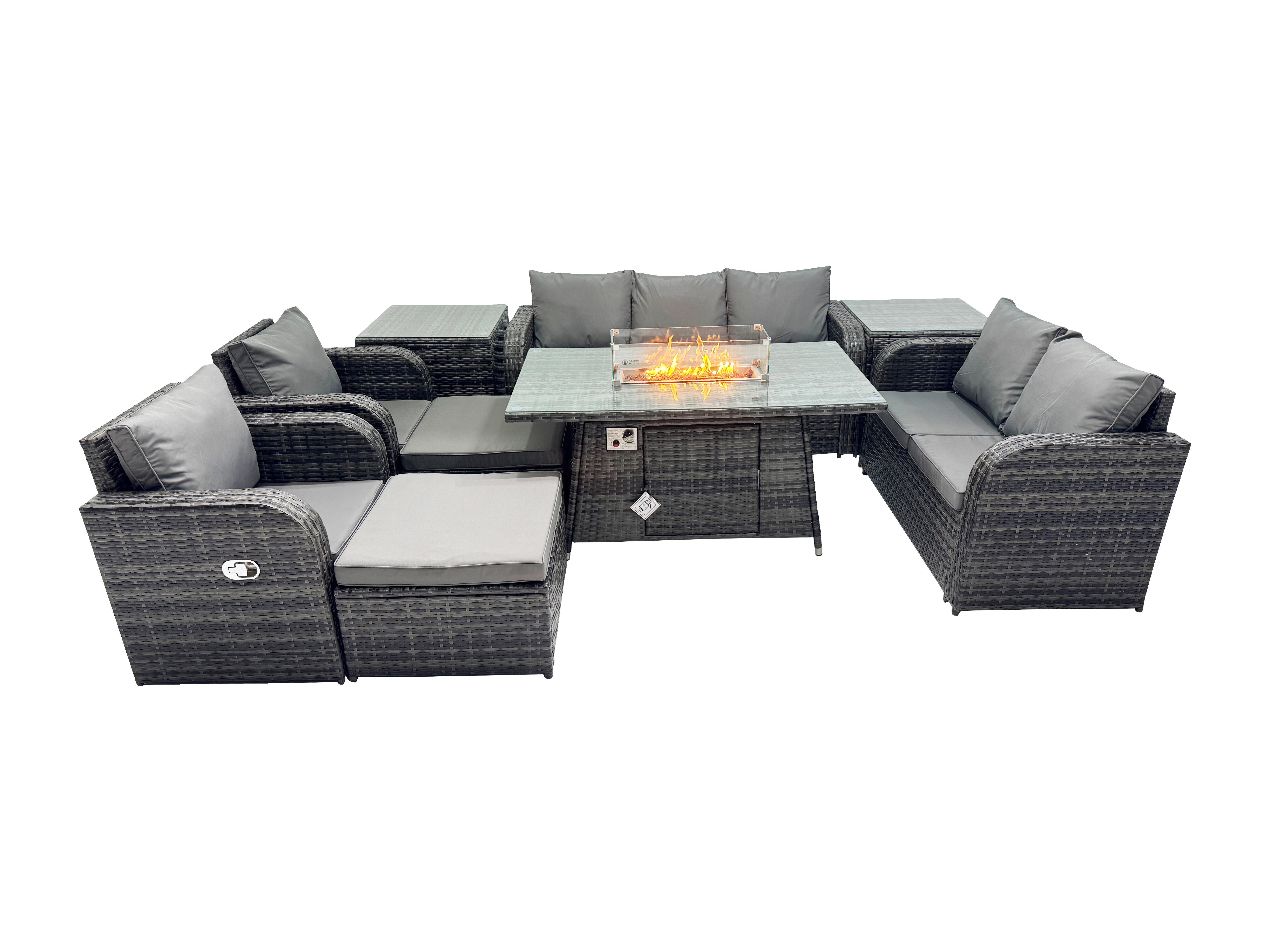 Polyrattan Gartenmöbelset Gasfeuerstelle Esstisch und Sofa Sessel set mit 2 Beistelltischen 2 hohen Hockern