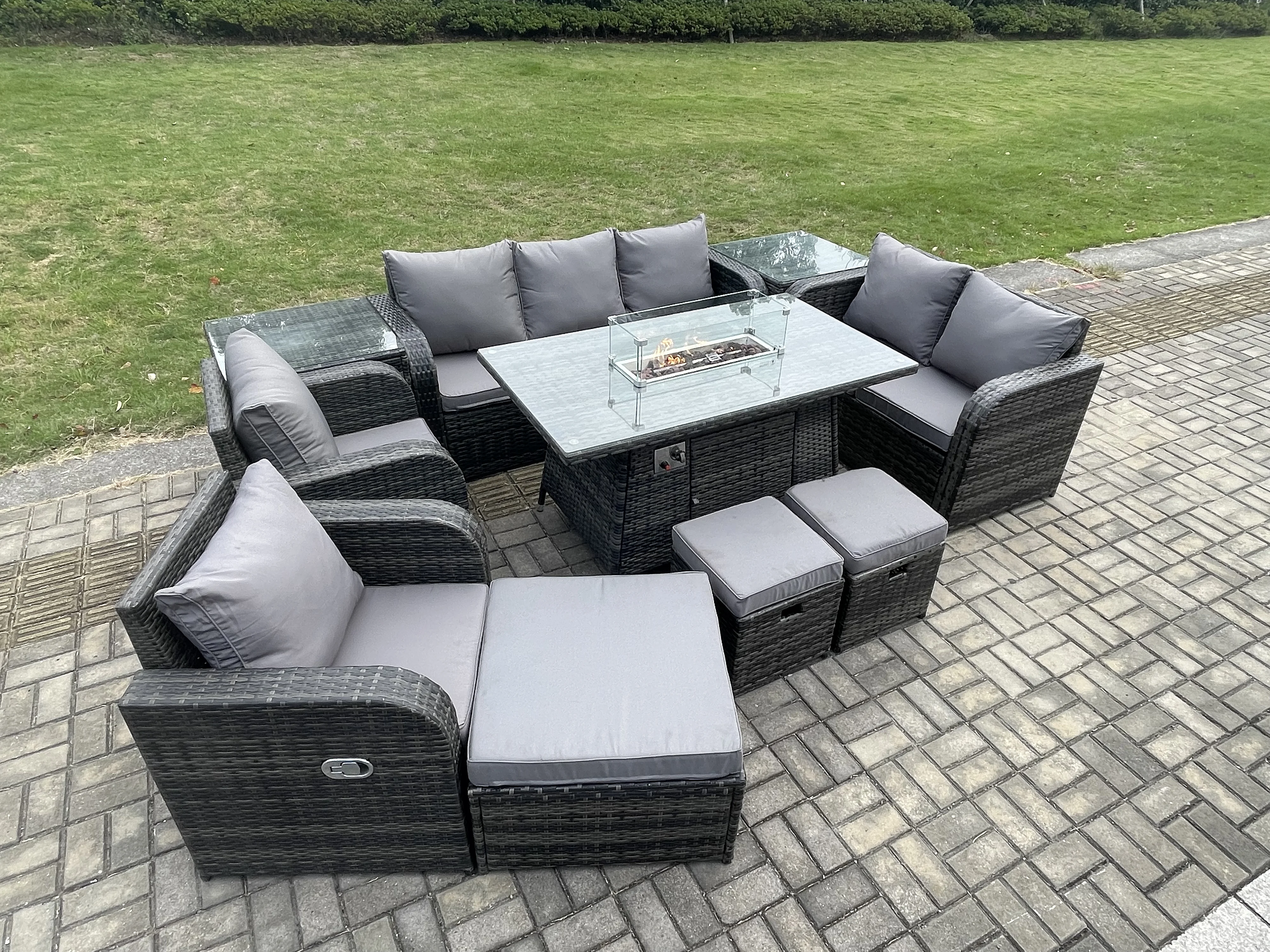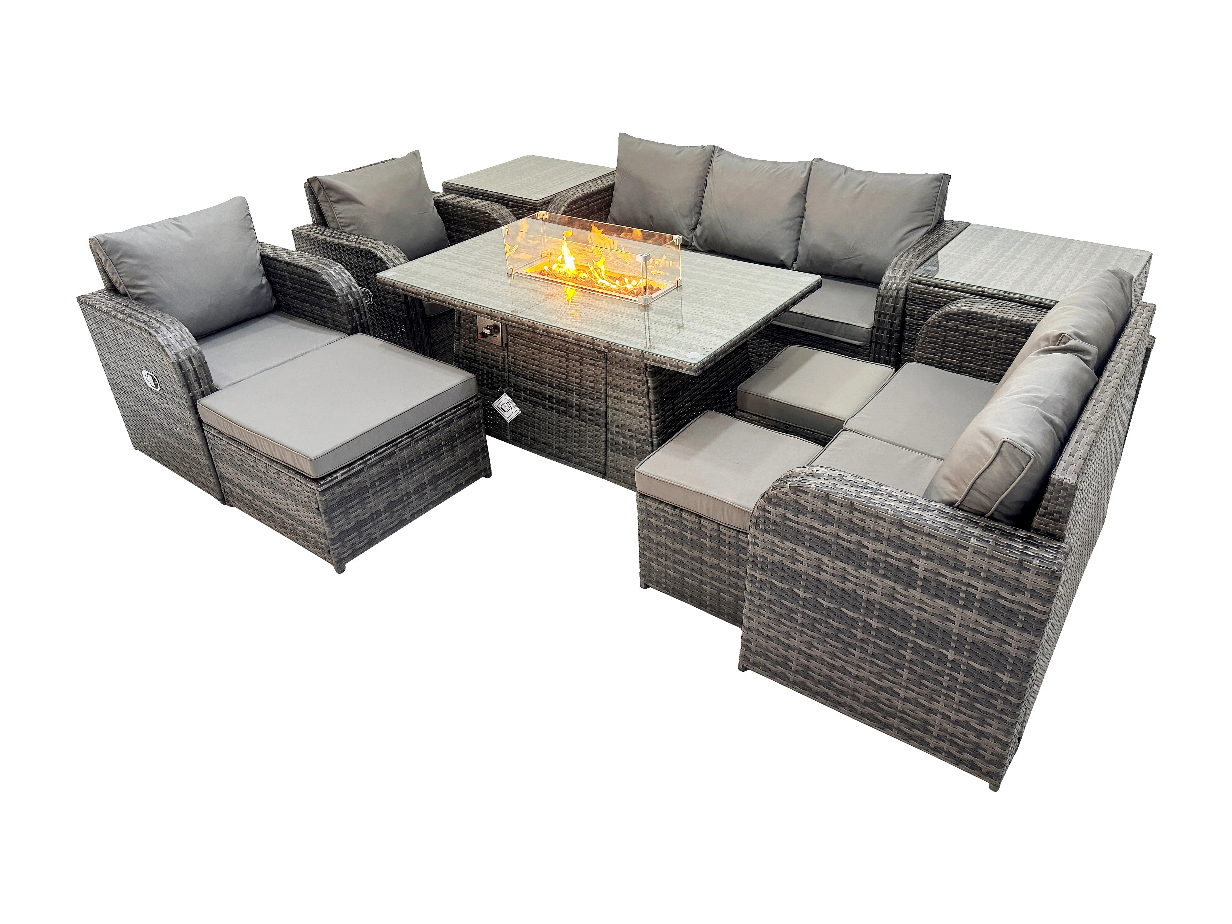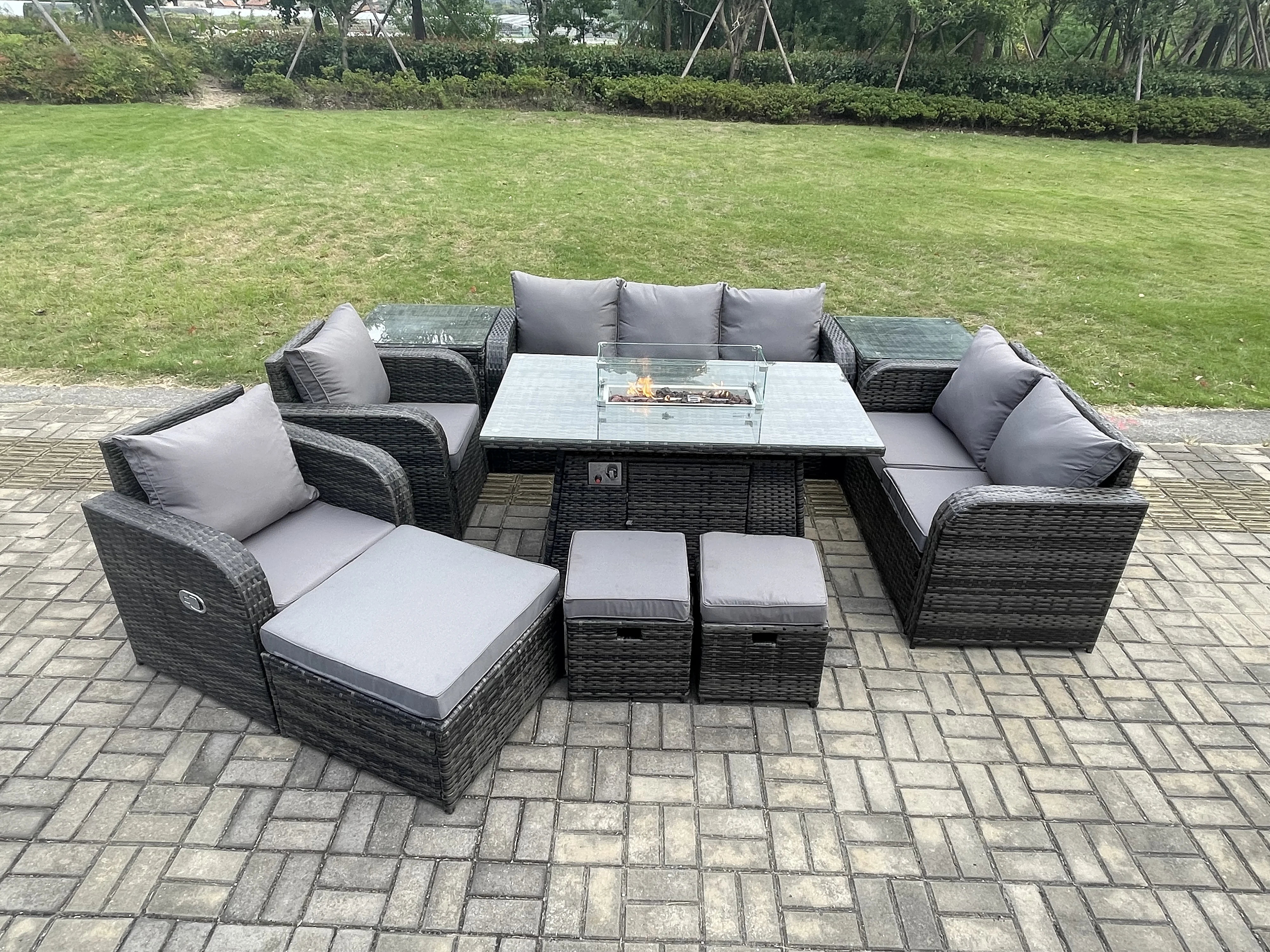 Polyrattan Gartenmöbelset Gasfeuerstelle Esstisch und Sofa Sessel set mit 3 Hockern 2 Beistelltischen