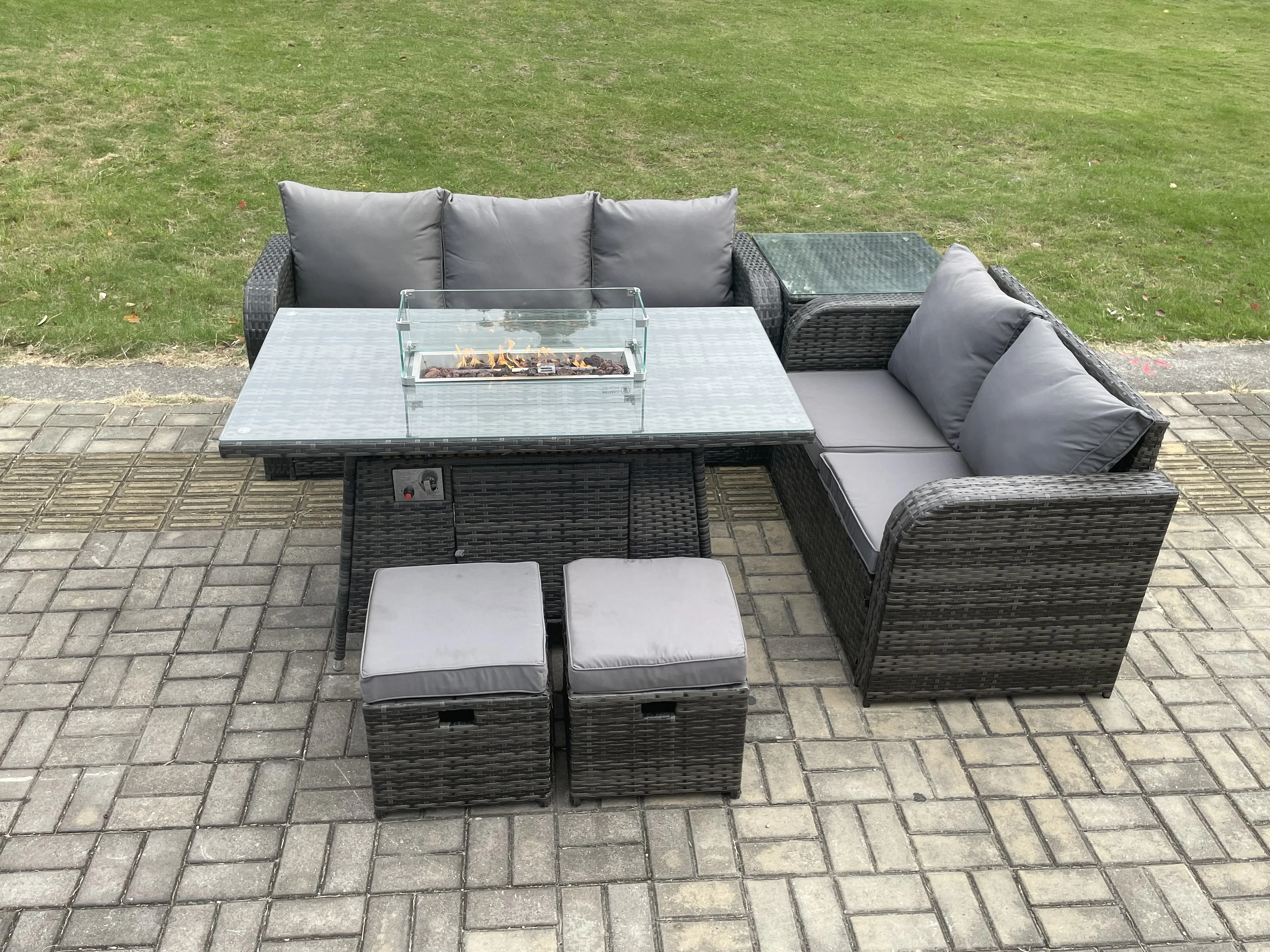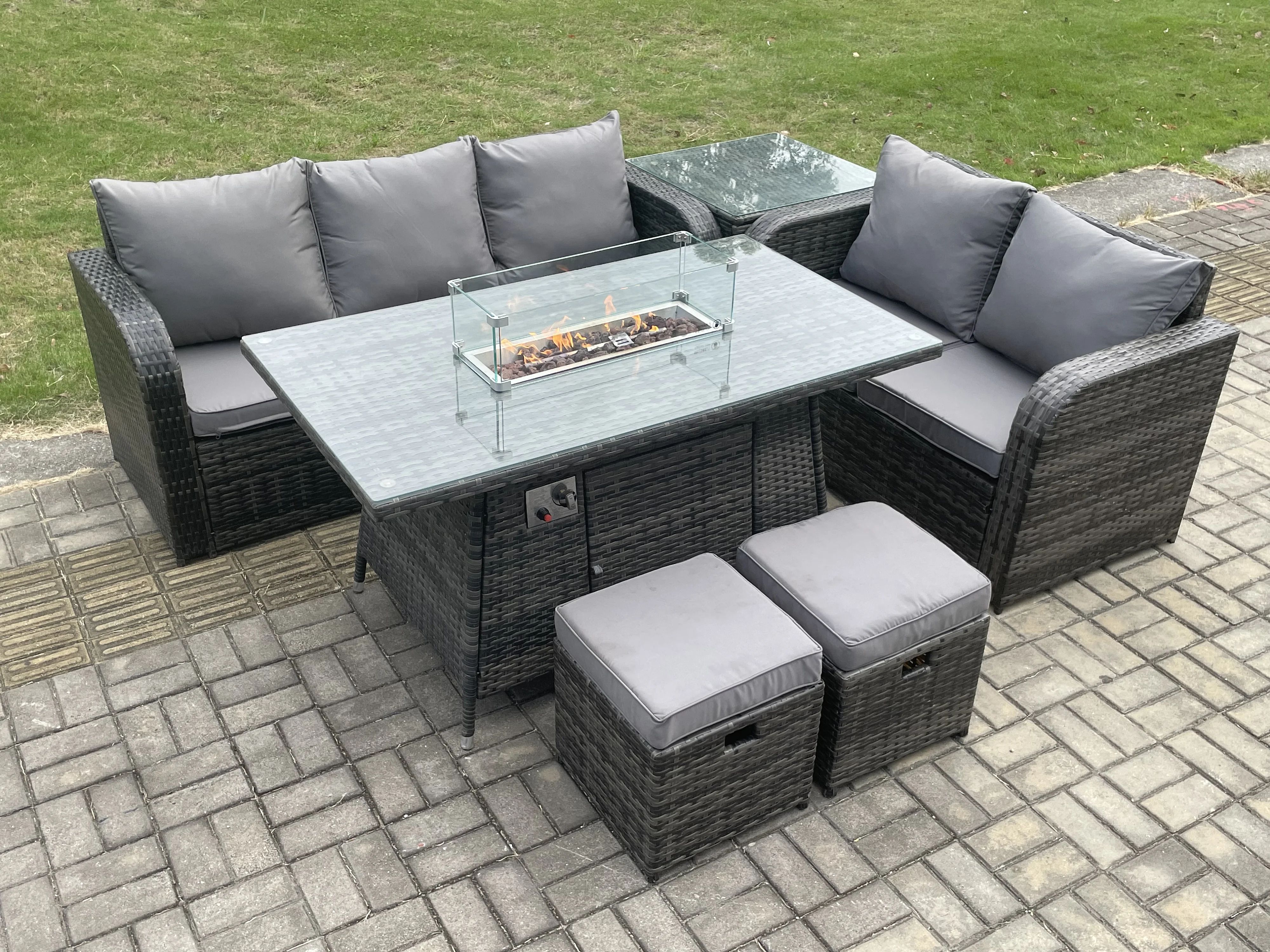 Polyrattan Gartenmöbelset Gasfeuerstelle Esstisch und Sofa set mit Beistelltisch 2 kleine Fußhockern