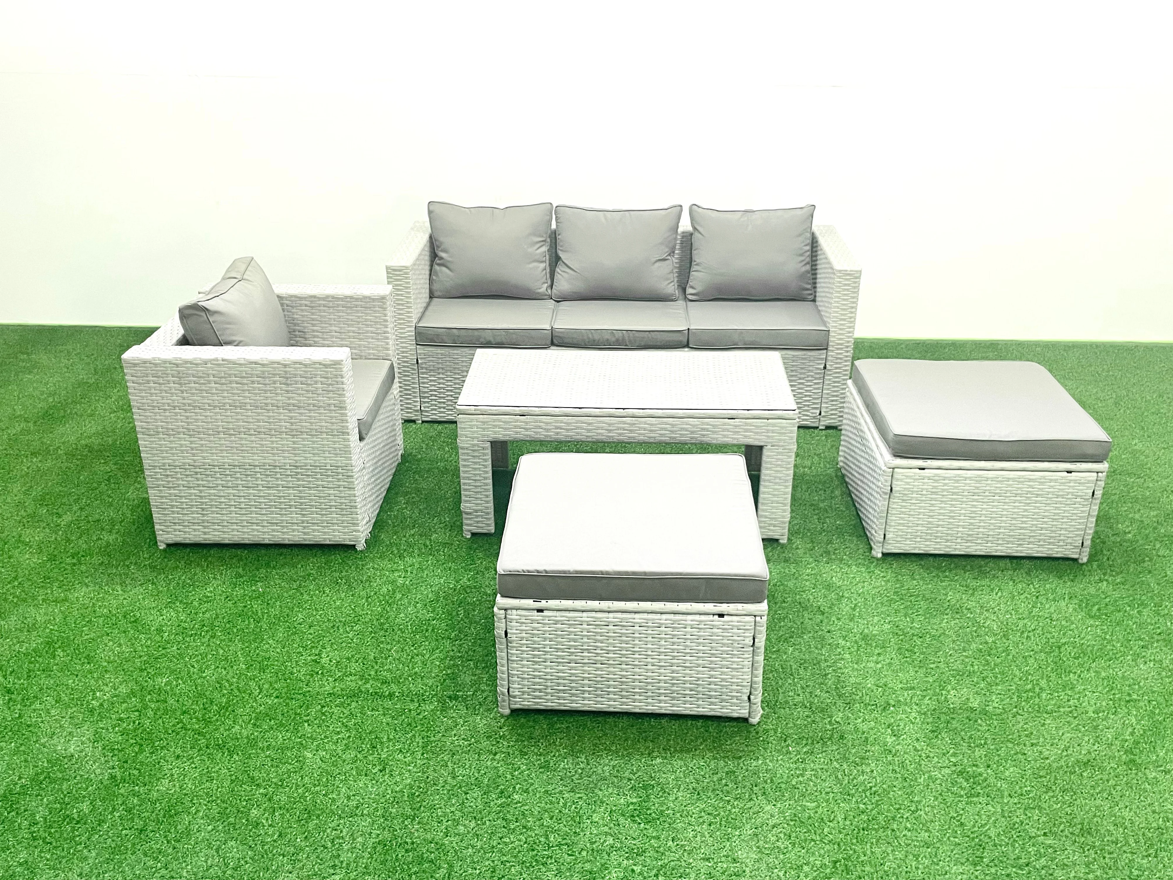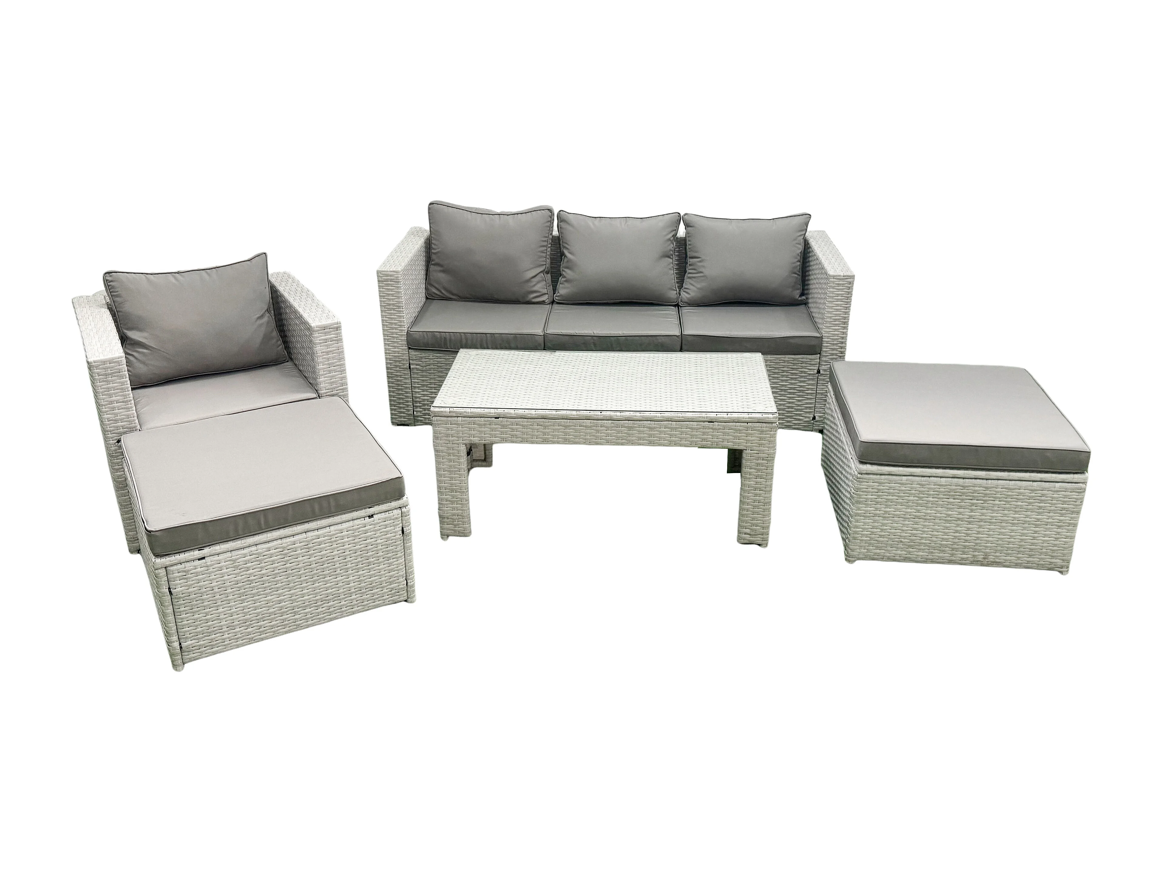 Polyrattan Gartenmöbelset mit Graue Kissen 6-Sitzer mit 2 hohen Hockern und Couchtisch