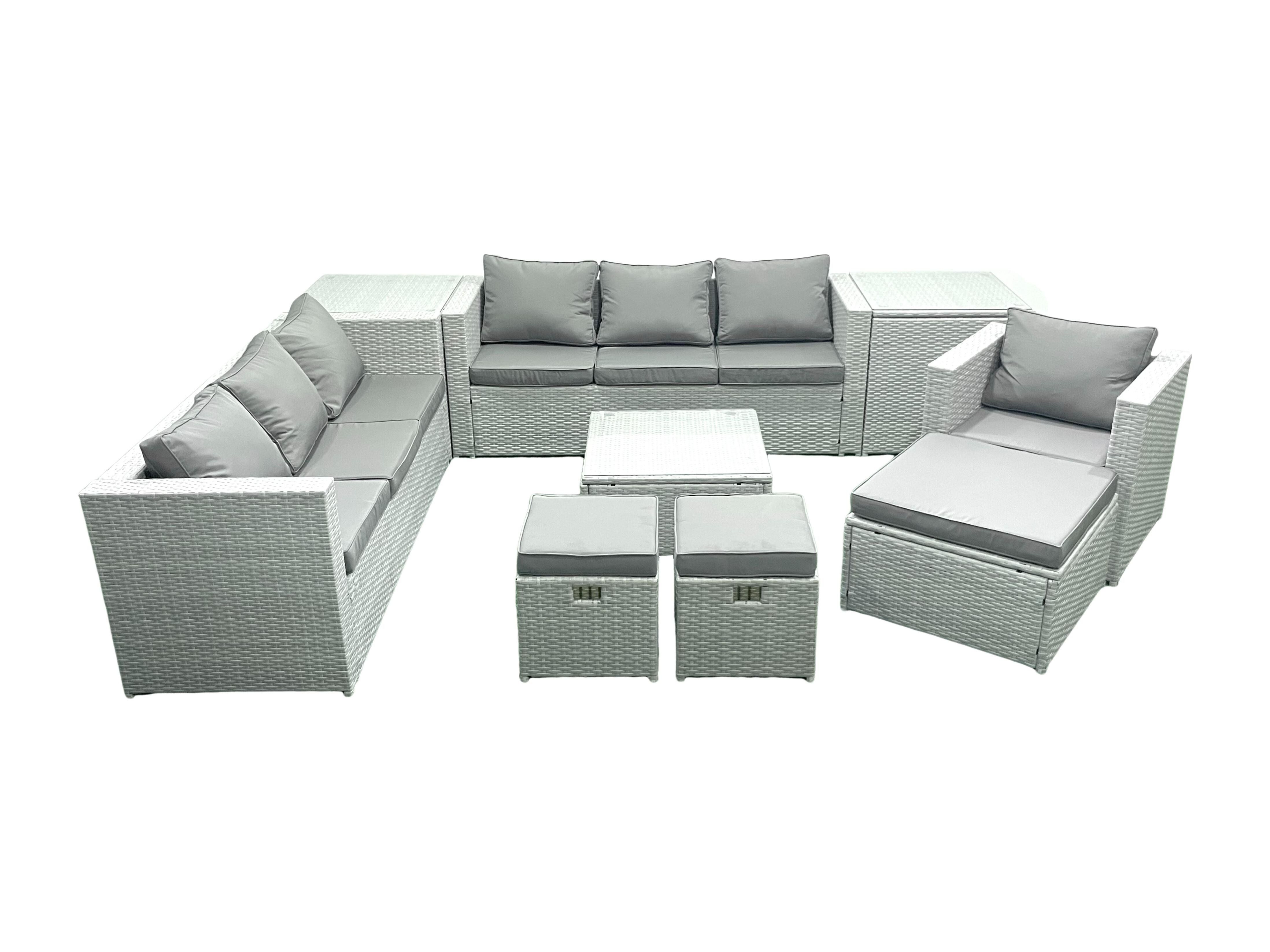 Polyrattan Sofa Gartenmöbel Set mit Sessel Quadratischer Couchtisch 3 Hockern 2 Beistelltischen Hellgrau gemischt