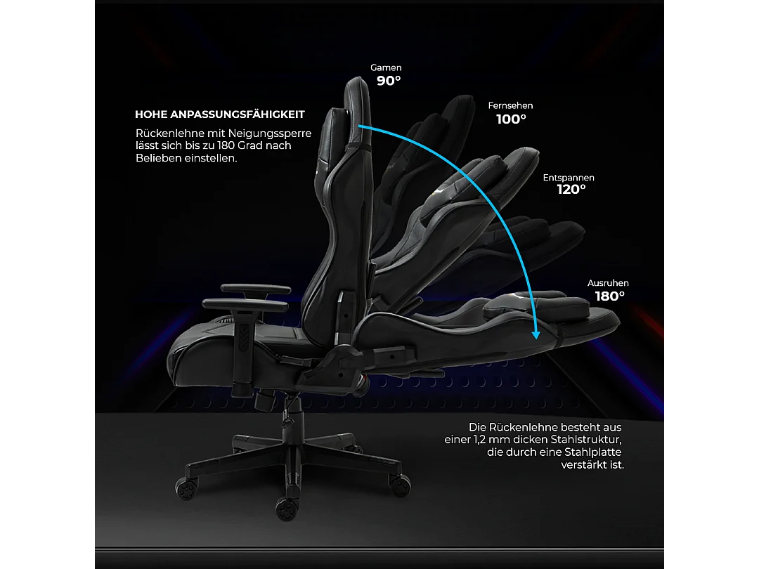 Premium Gaming-Stuhl – mit integriertem Massagesystem, extra breit, 3D-Armlehnen, bis 150 kg belastbar – MaxPodium Tactical SMI, Schwarz