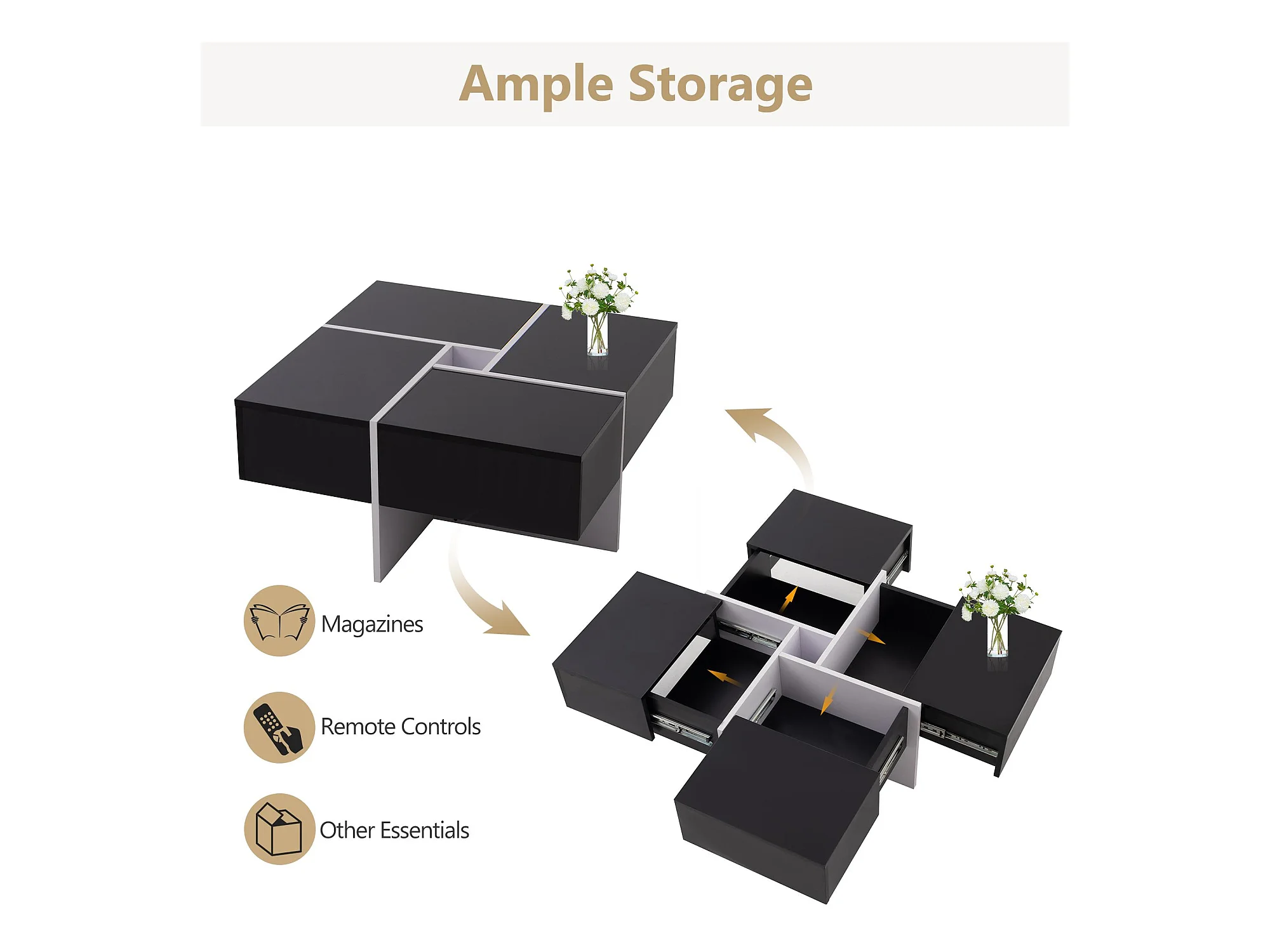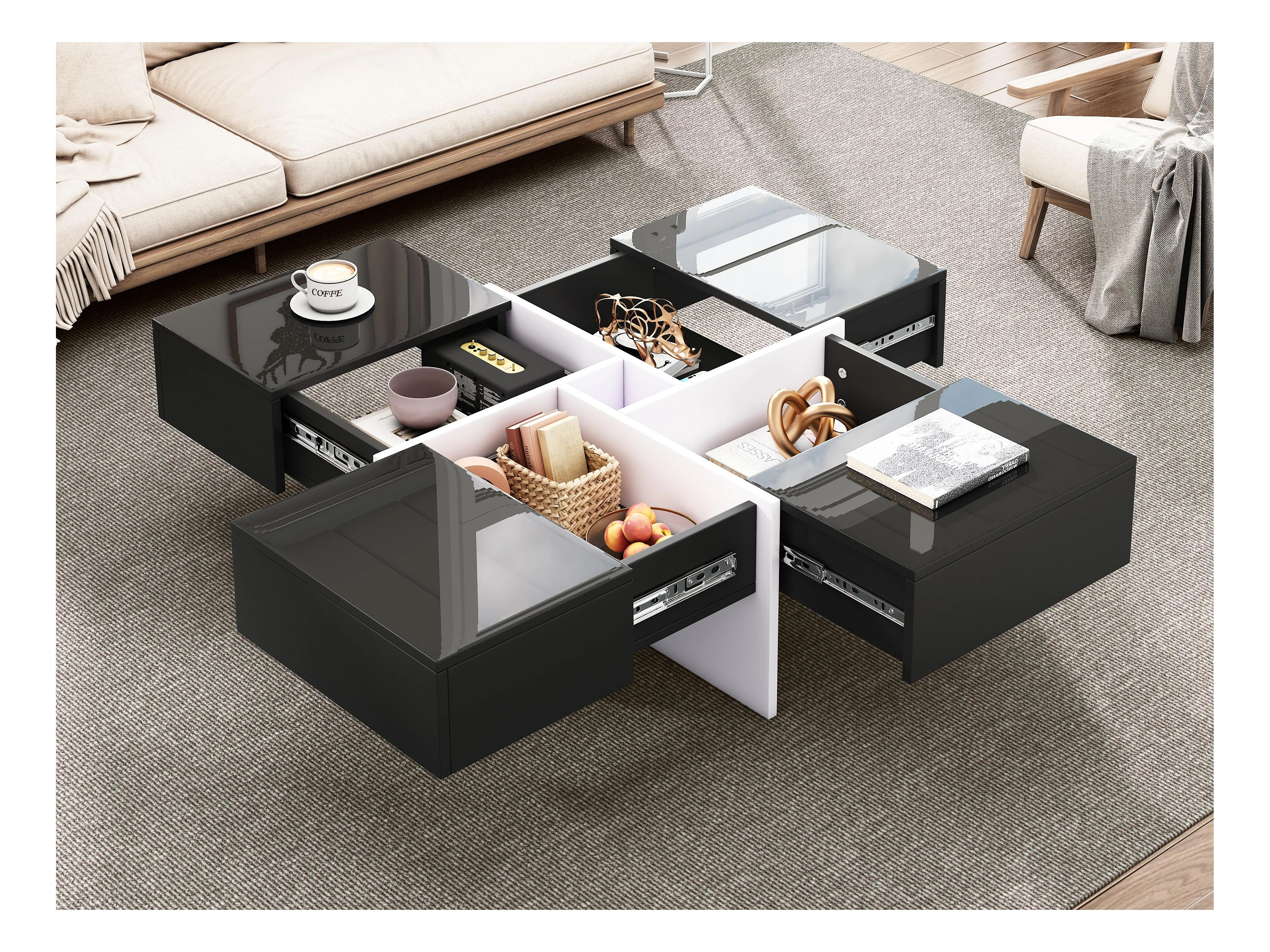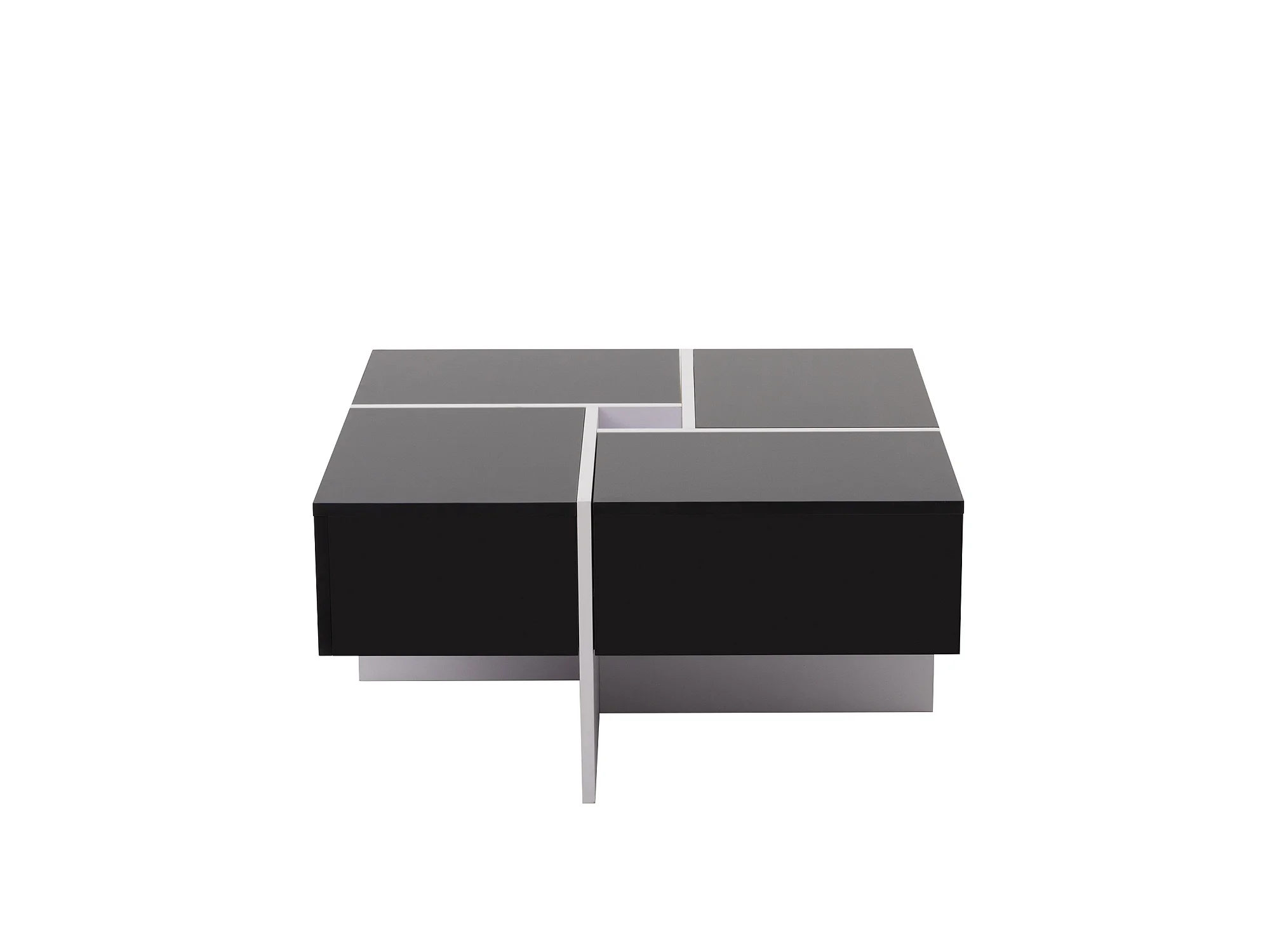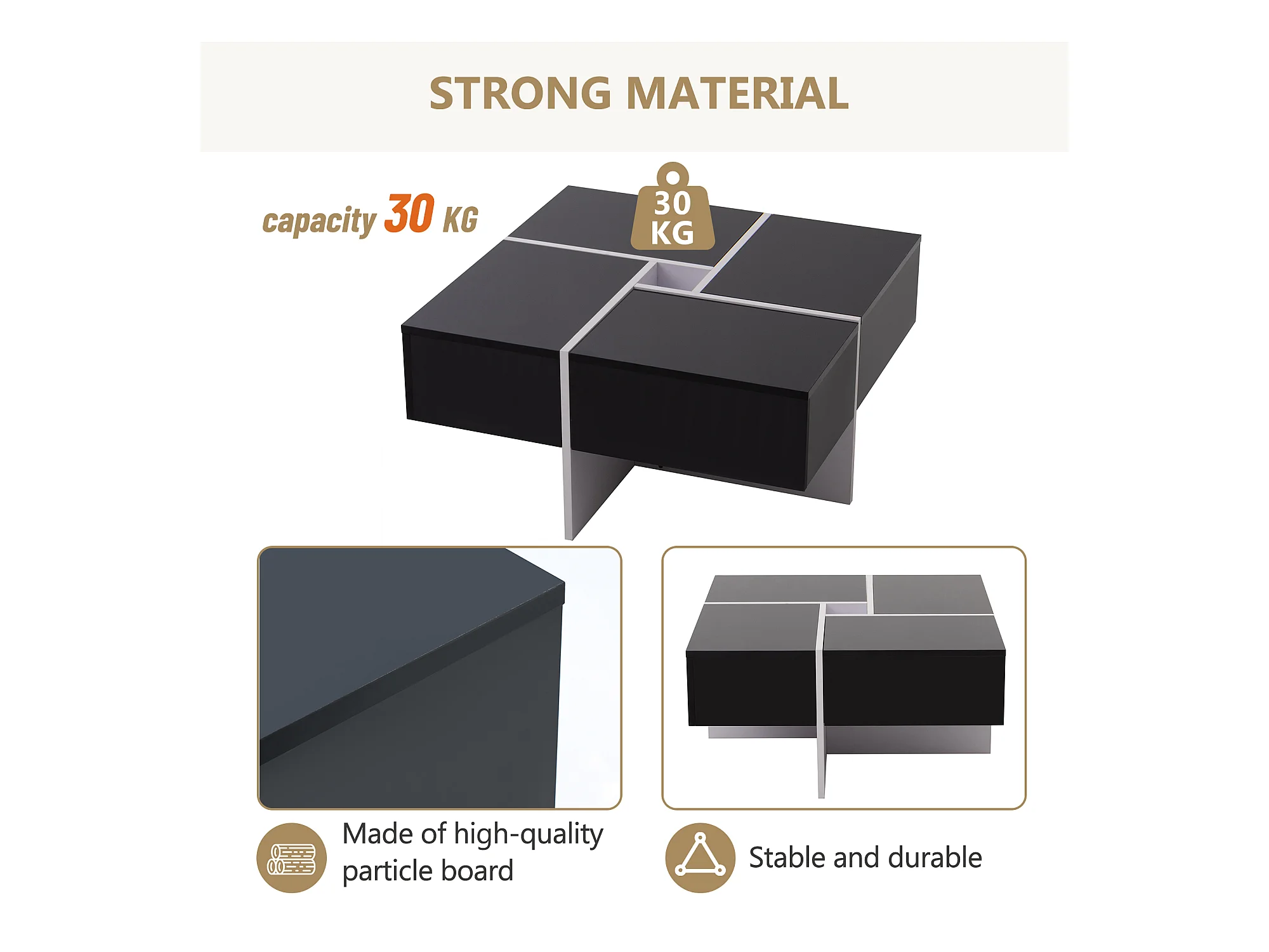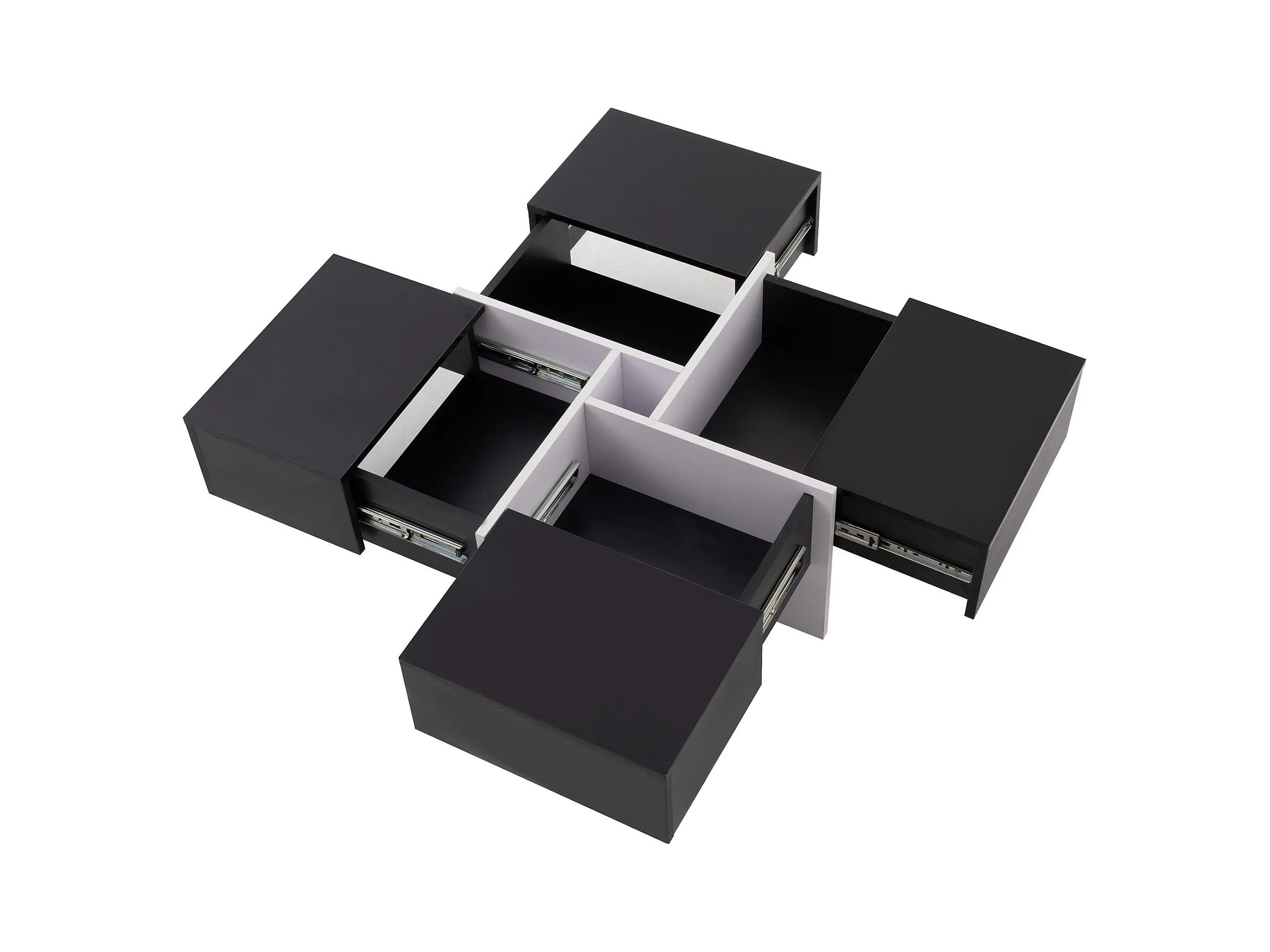 Quadratischer Couchtisch – 4 Schubladen – Spanplatte – Schwarz