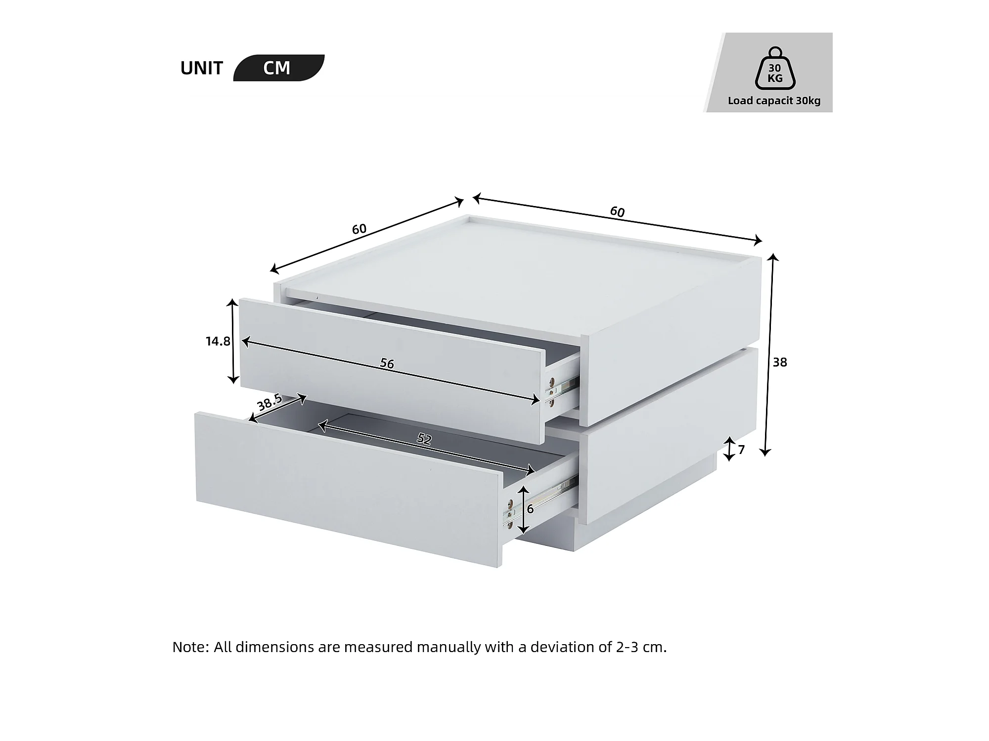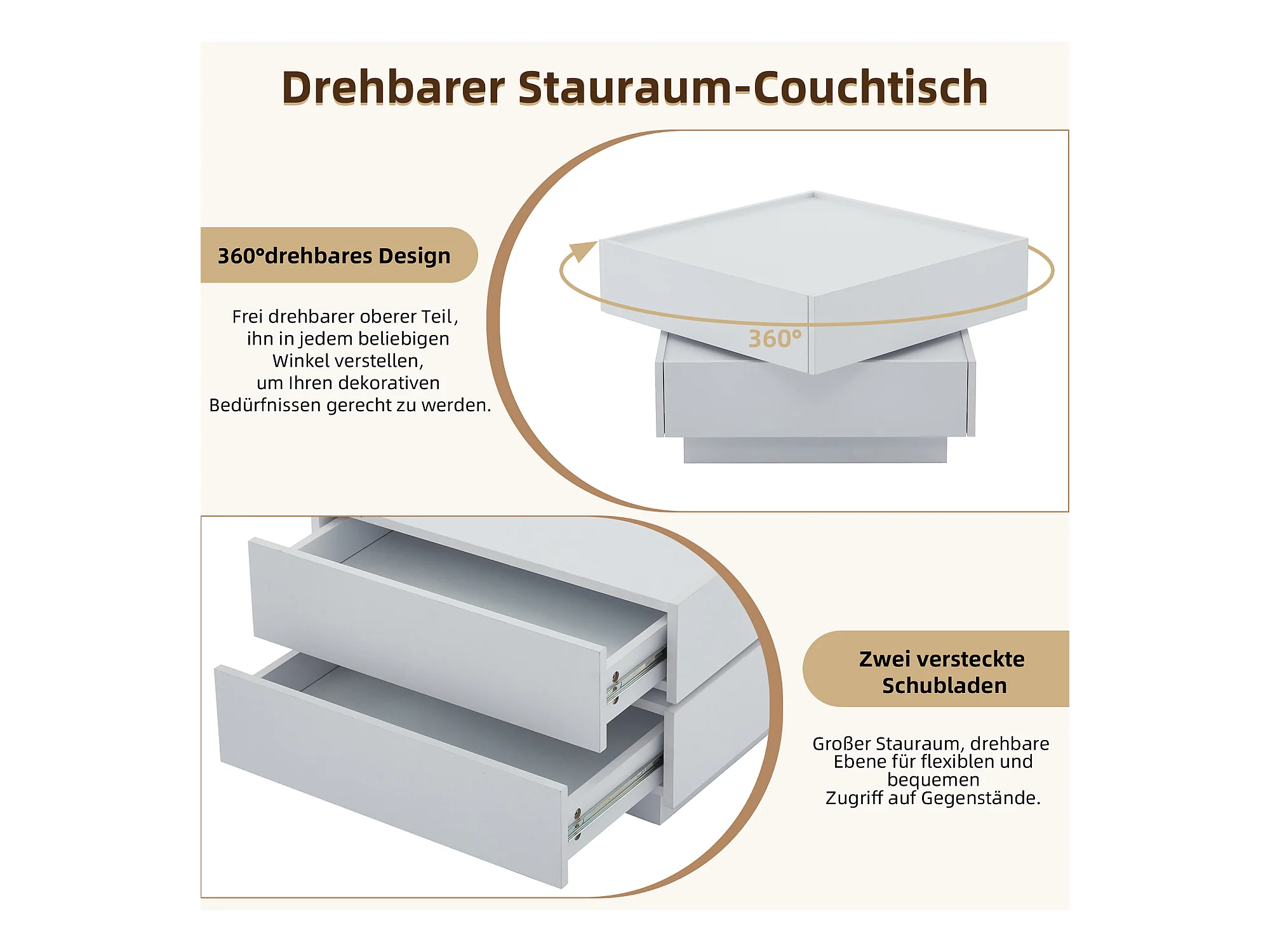 Quadratischer Couchtisch mit um 360° drehbarer Platte – 60 x 60 x 38 cm – Spanplatte – Weiß