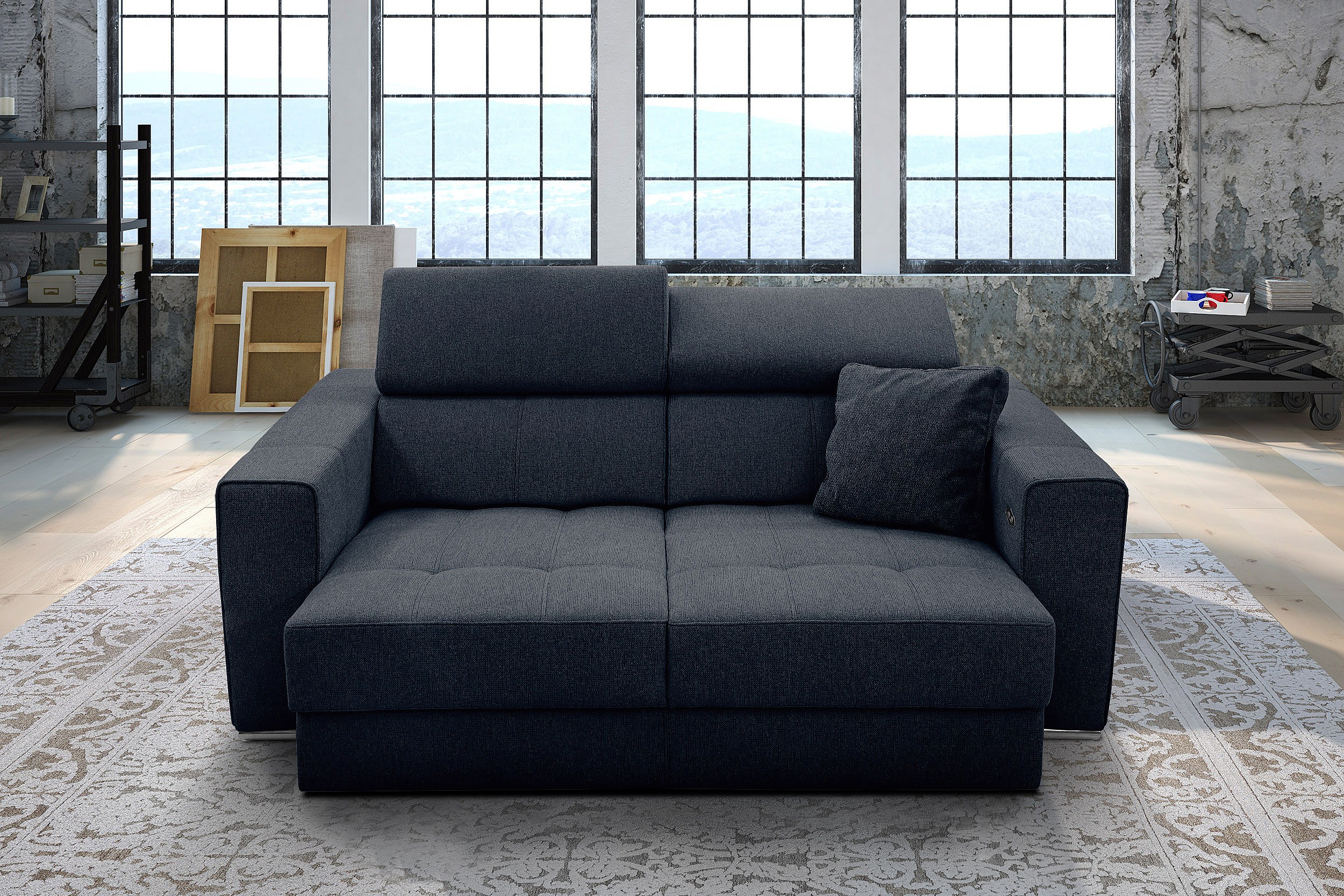 QUARTZ Sofa 3-Sitzer mit Ausziehsitz und verstellbare Kopfstützen, marineblau