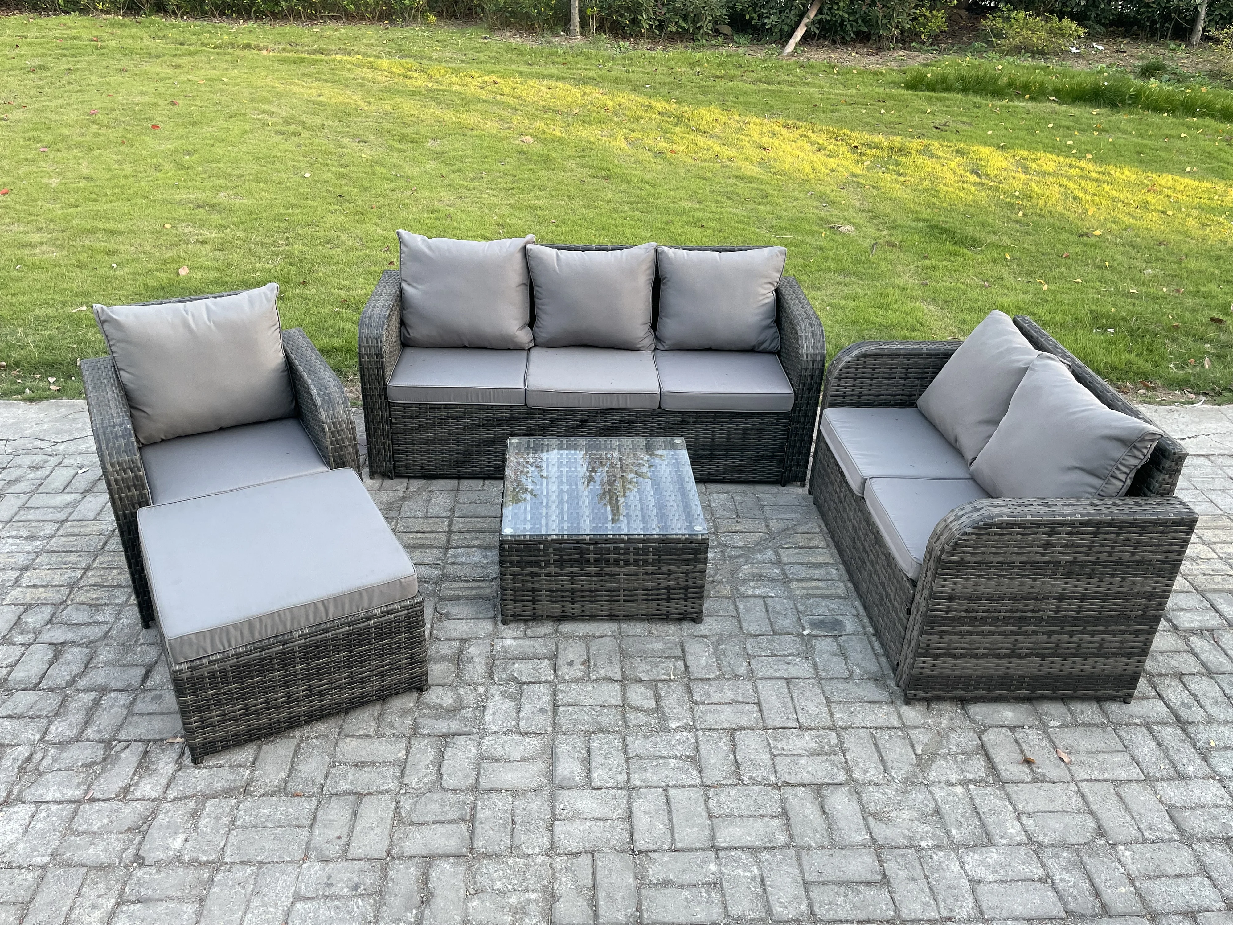 Rattan-Gartenmöbel 5 Stück Terrassenset mit Tisch und Sofa Quadratischer Couchtisch Liegestühle Loveseat sofa 2 Großer Hockern