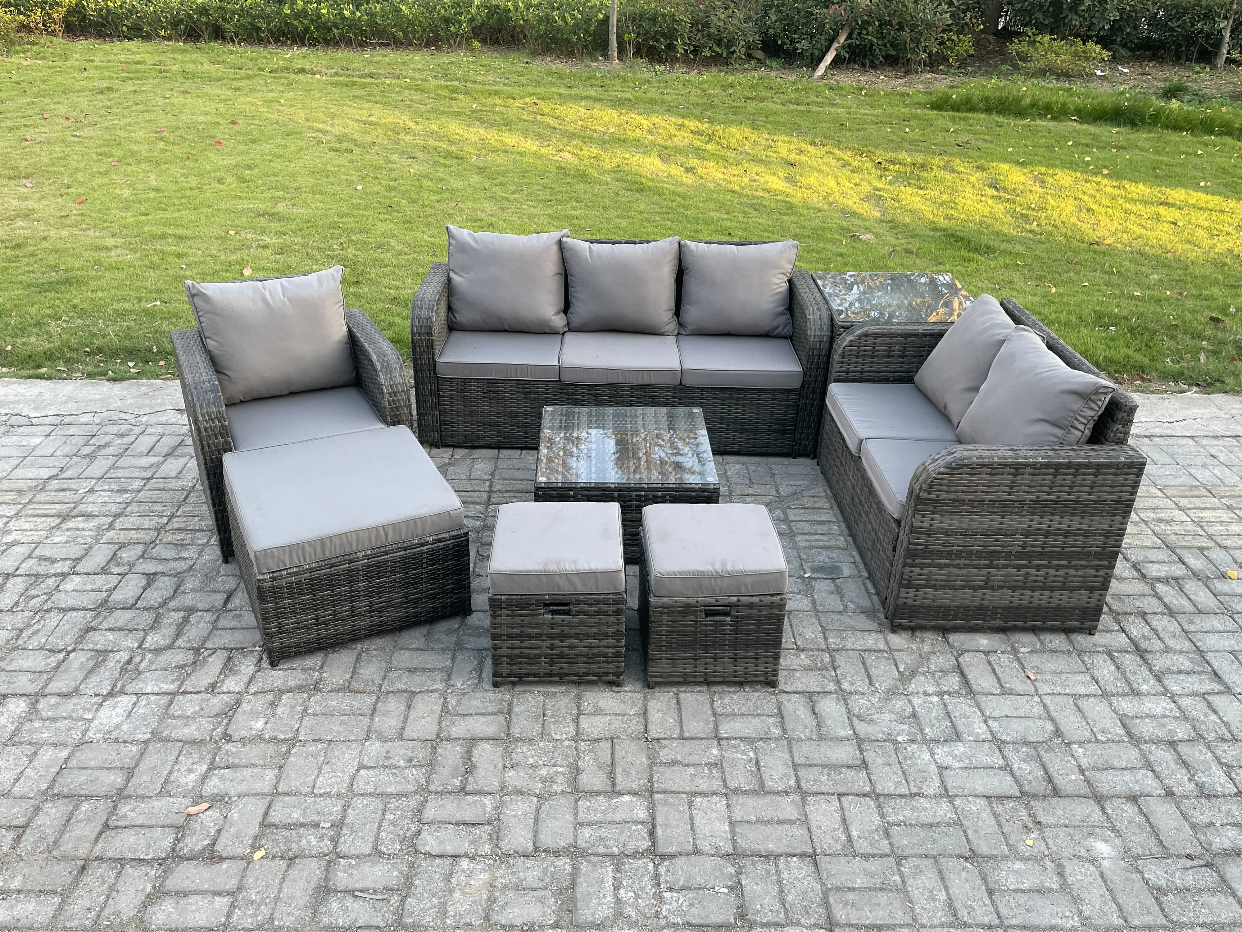 Rattan-Gartenmöbel 8 Stück Terrassenset mit Tisch und Sofa Quadratischer Couchtisch Liegestühle Loveseat Sofa 3-Sitzer Sofa 3 Hockern Beistelltisch