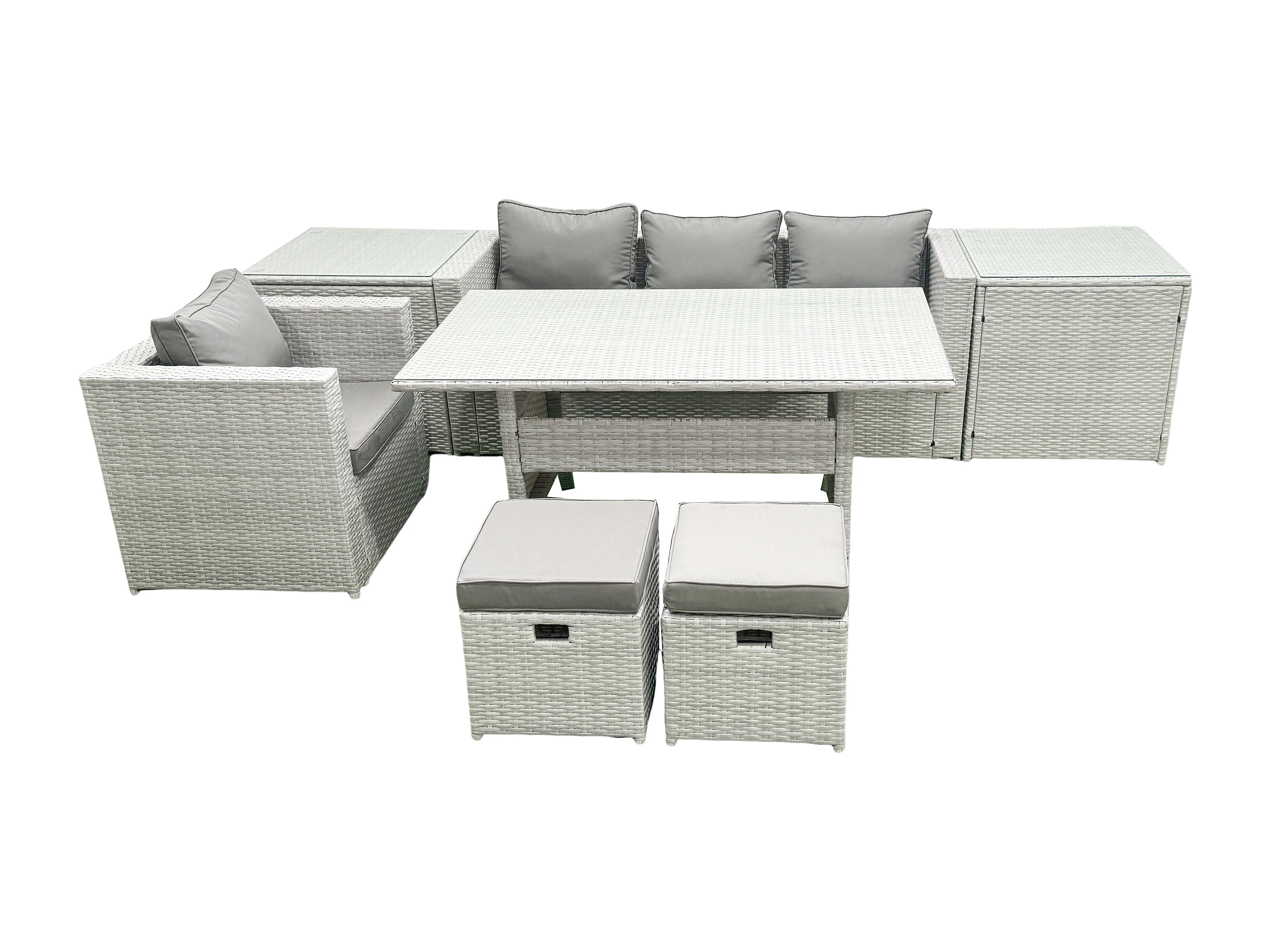 Rattan Gartenmöbel Essgarnitur 6 Sitzer Lounge Sofa Stuhl Esstisch Set mit 2 kleine Fußhockern 2 Beistelltischen Hellgrau gemischt