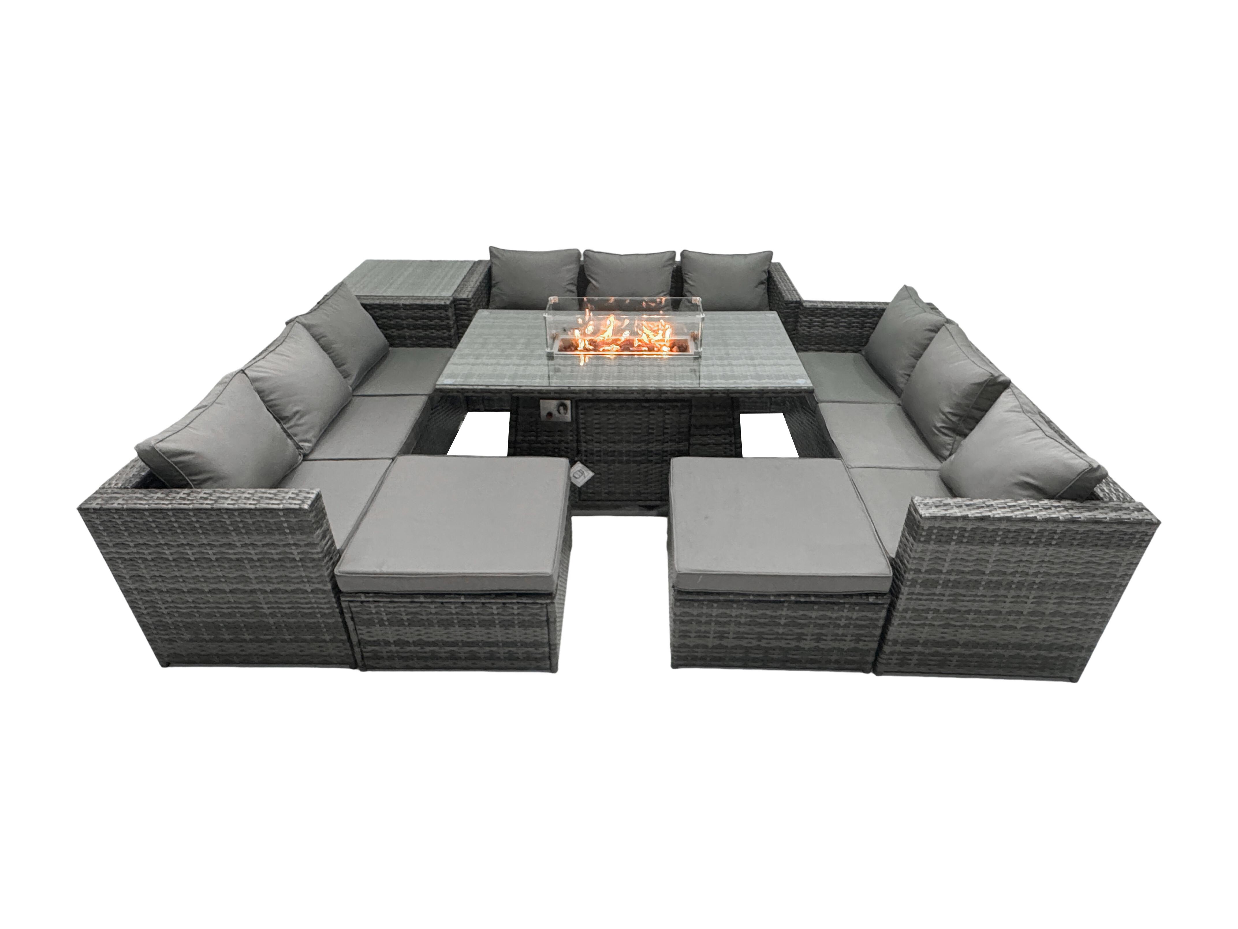 Rattan-Gartenmöbel Firepit Set Outdoor 10-Sitzer Esstisch Set mit Glasplatte Beistelltischen