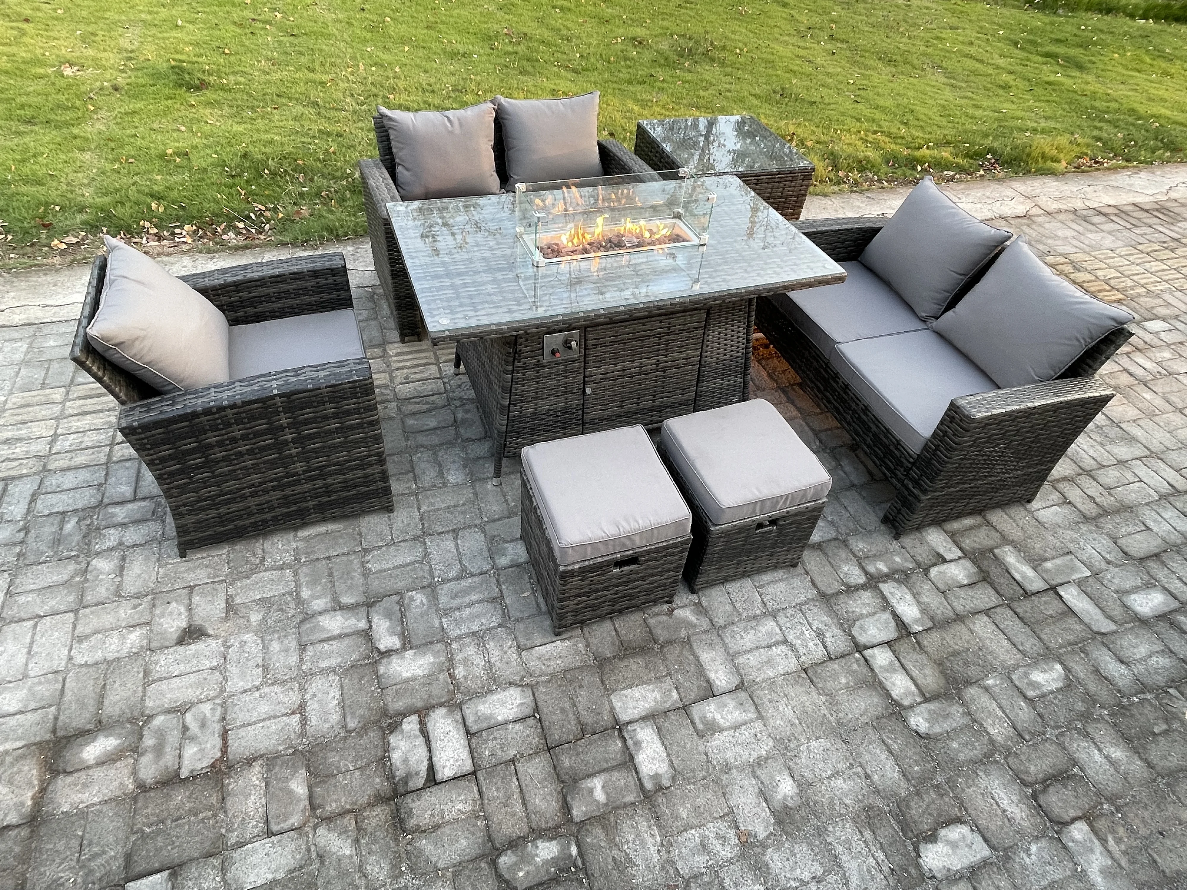 Rattan Gartenmöbel im Freien Gas Feuerstelle Tisch Sets Gasheizgerät mit Liebes-Sofa Stuhl Beistelltische 2 Kleiner Fußhocker 7-Sitzer Dunkelgrau Gemischt