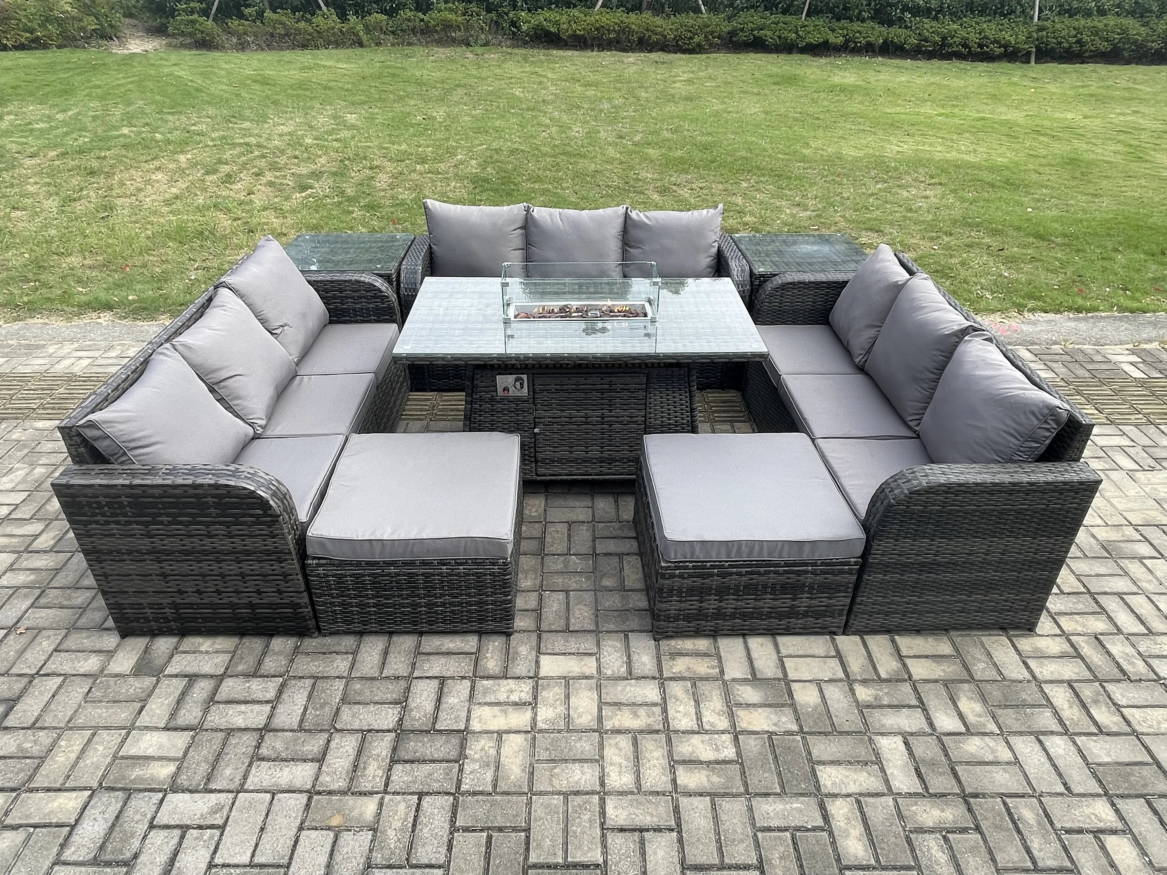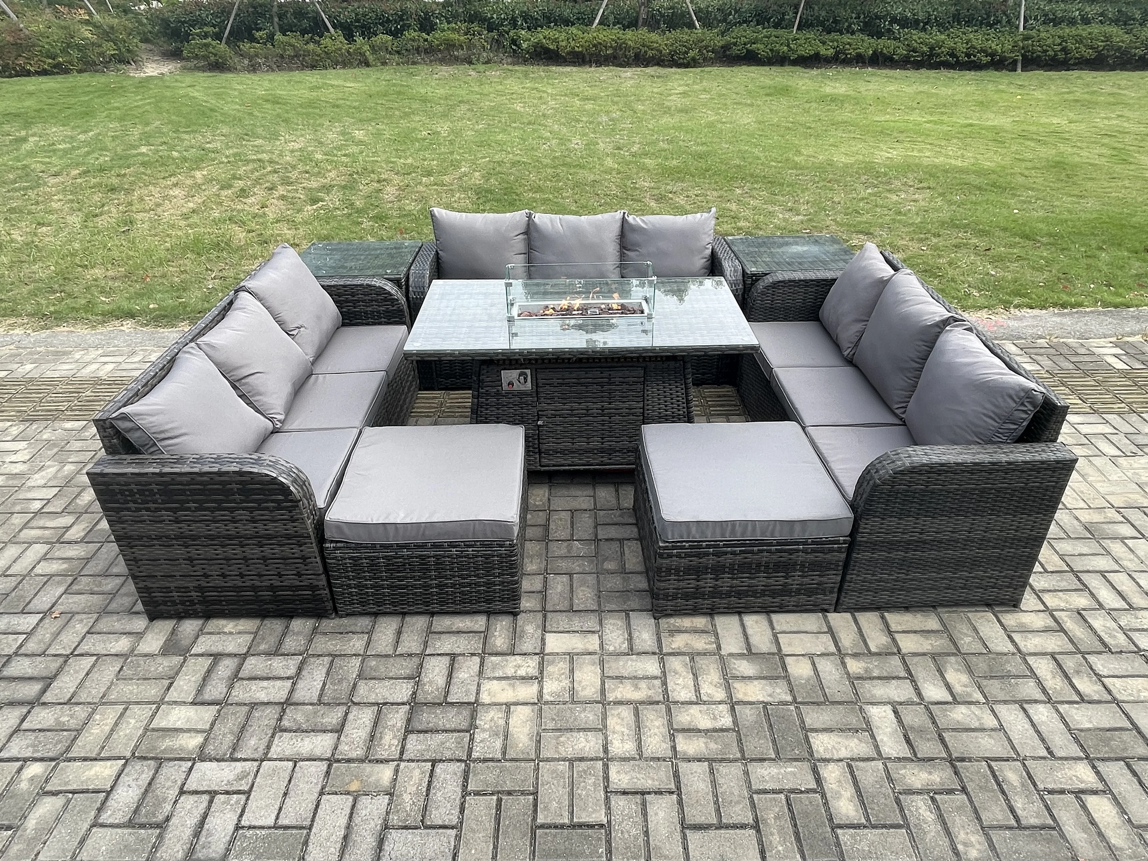 Rattan Gartenmöbel im Freien Gasfeuerstelle Esstisch Set mit 2 Beistelltischen Lounge Sofa 2 hohen Hockern