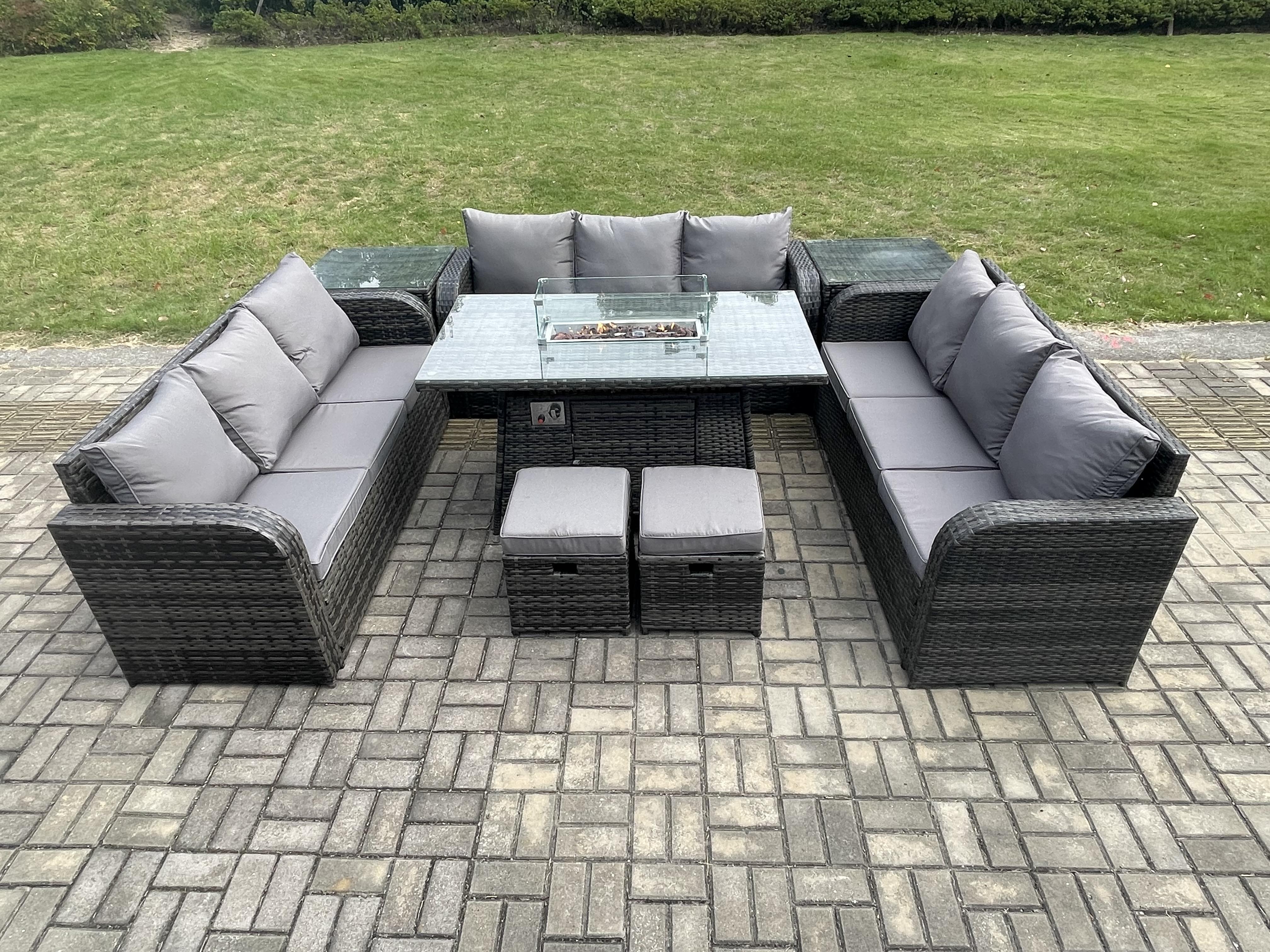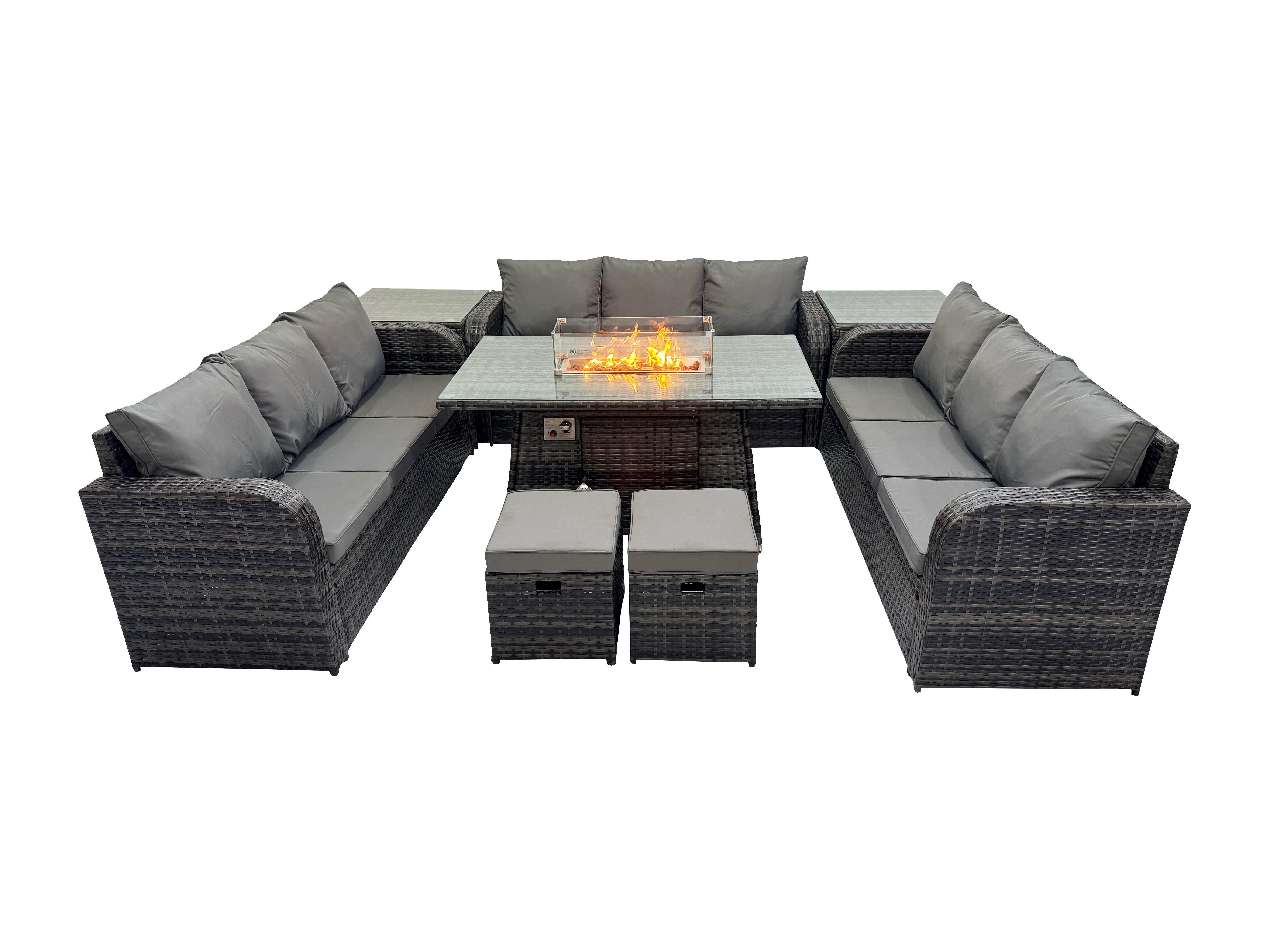 Rattan Gartenmöbel im Freien Gasfeuerstelle Esstisch Set mit 2 Beistelltischen Lounge Sofa 2 kleinen Hockern