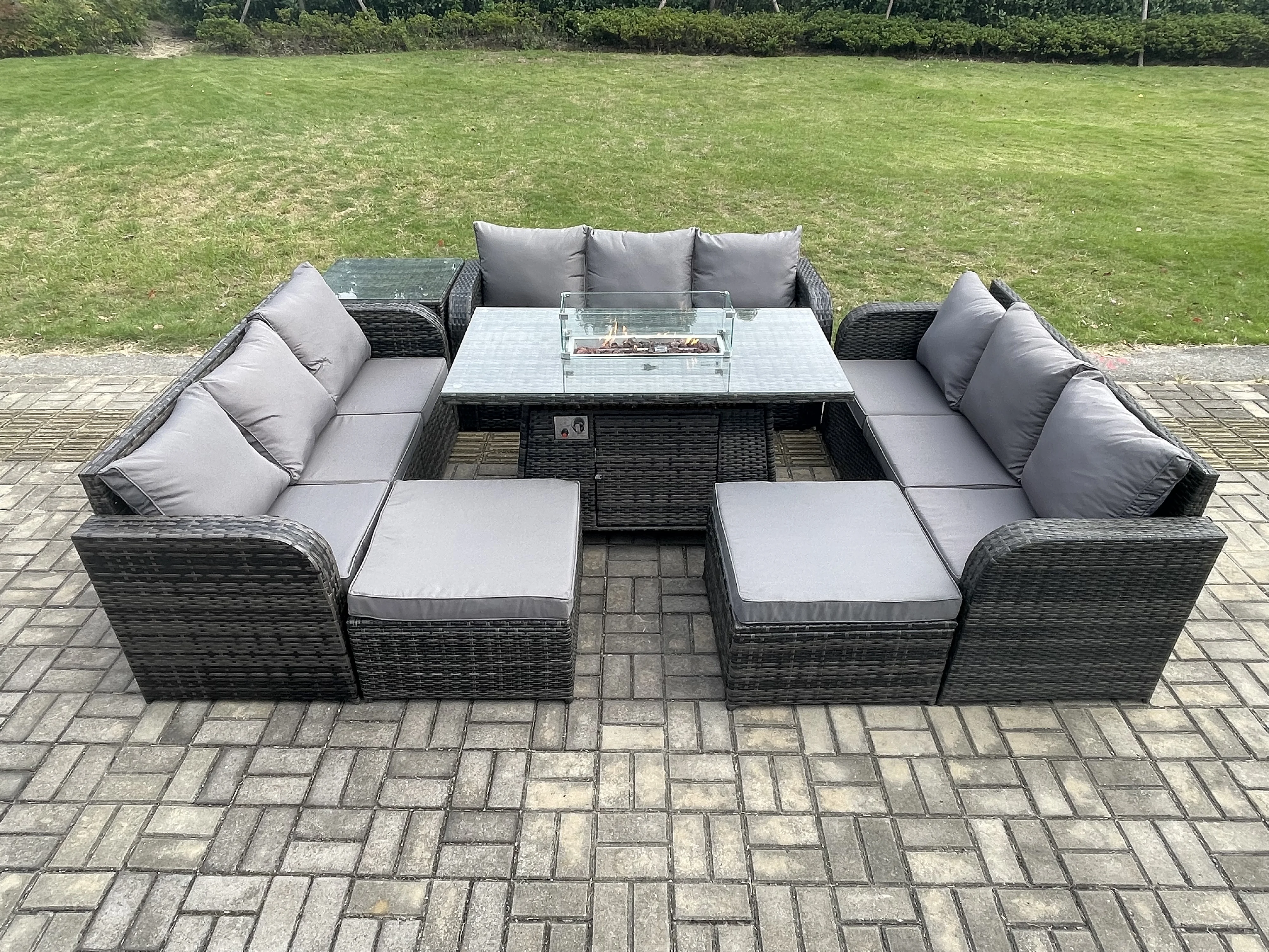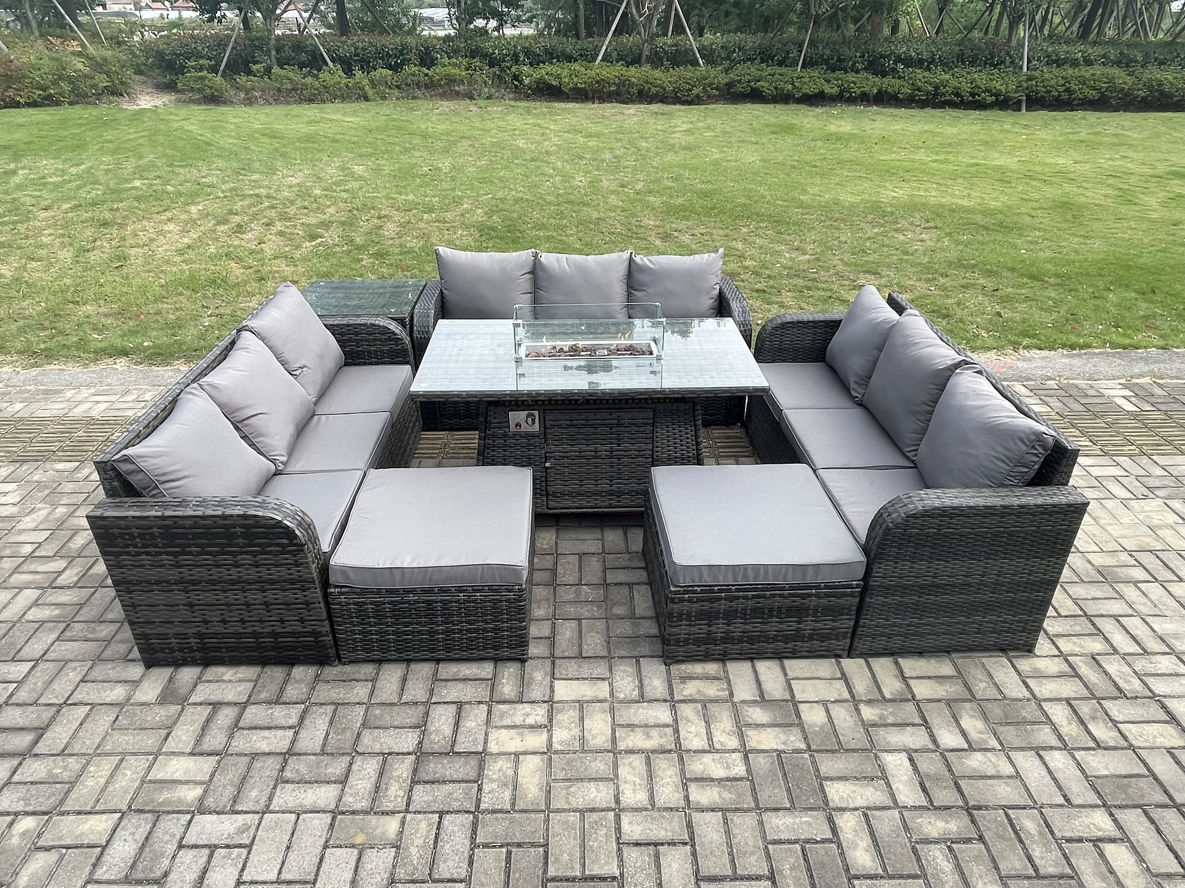 Rattan Gartenmöbel im Freien Gasfeuerstelle Esstisch Set mit Beistelltisch Lounge Sofa 2 hohen Hockern