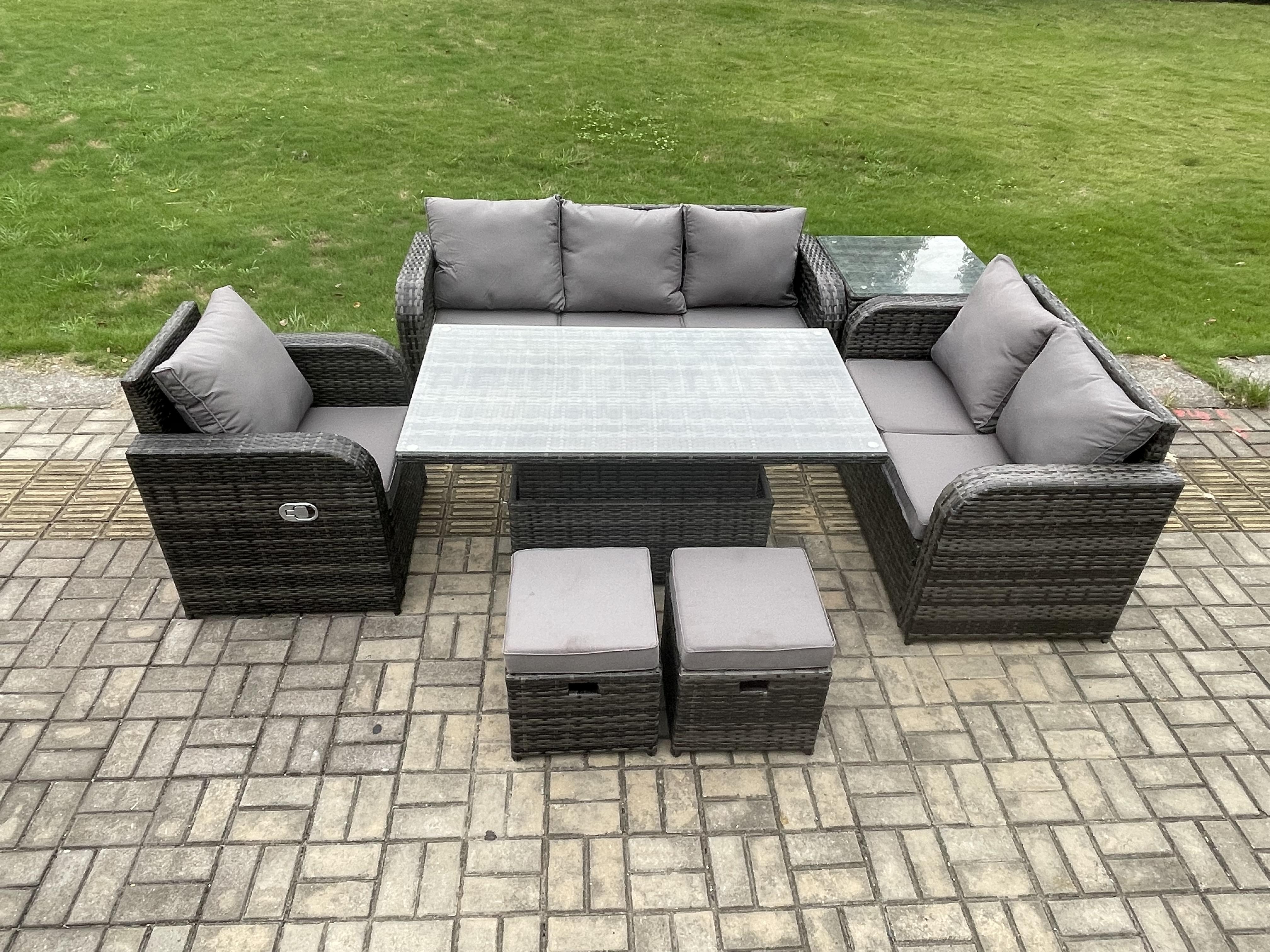 Rattan Gartenmöbel im Freien Patio höhenverstellbarer Tisch Liegestühle Sofa mit Beistelltisch 2 kleine Fußhockern Dunkelgrau Gemischt