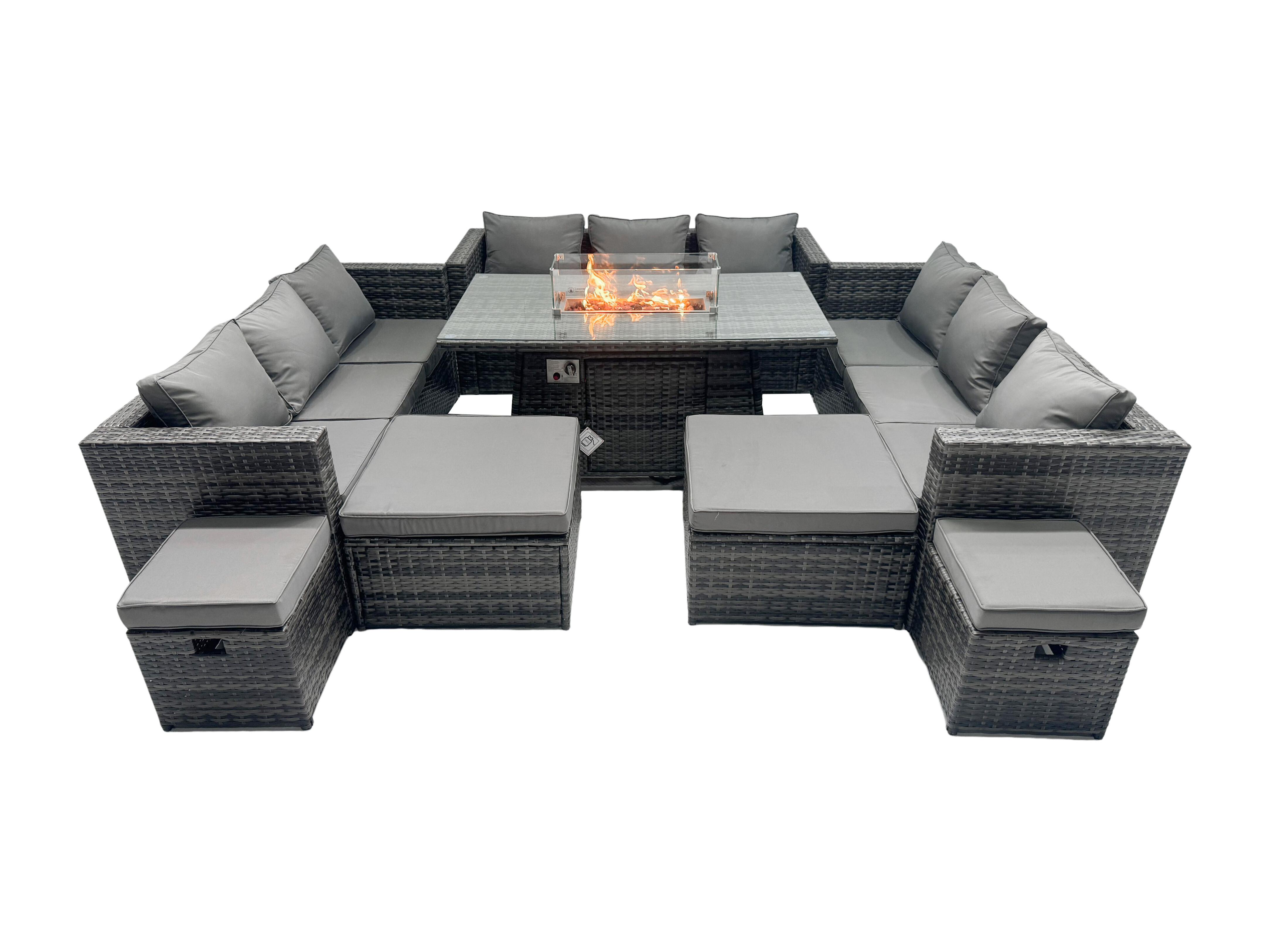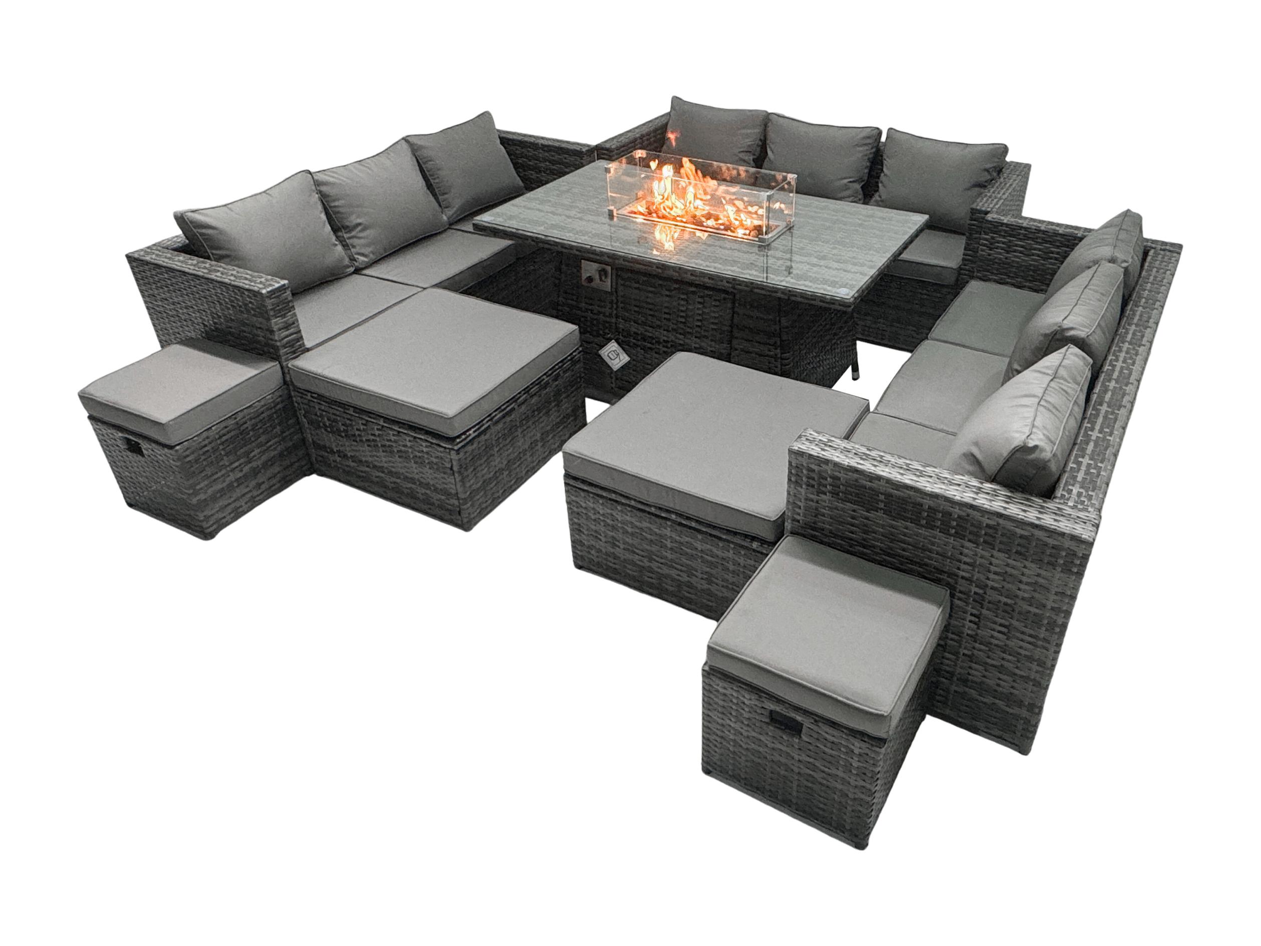 Rattan Gartenmöbel Set 13-Sitzer Garten Sofa Gas Feuertisch Set mit 4 Hockern