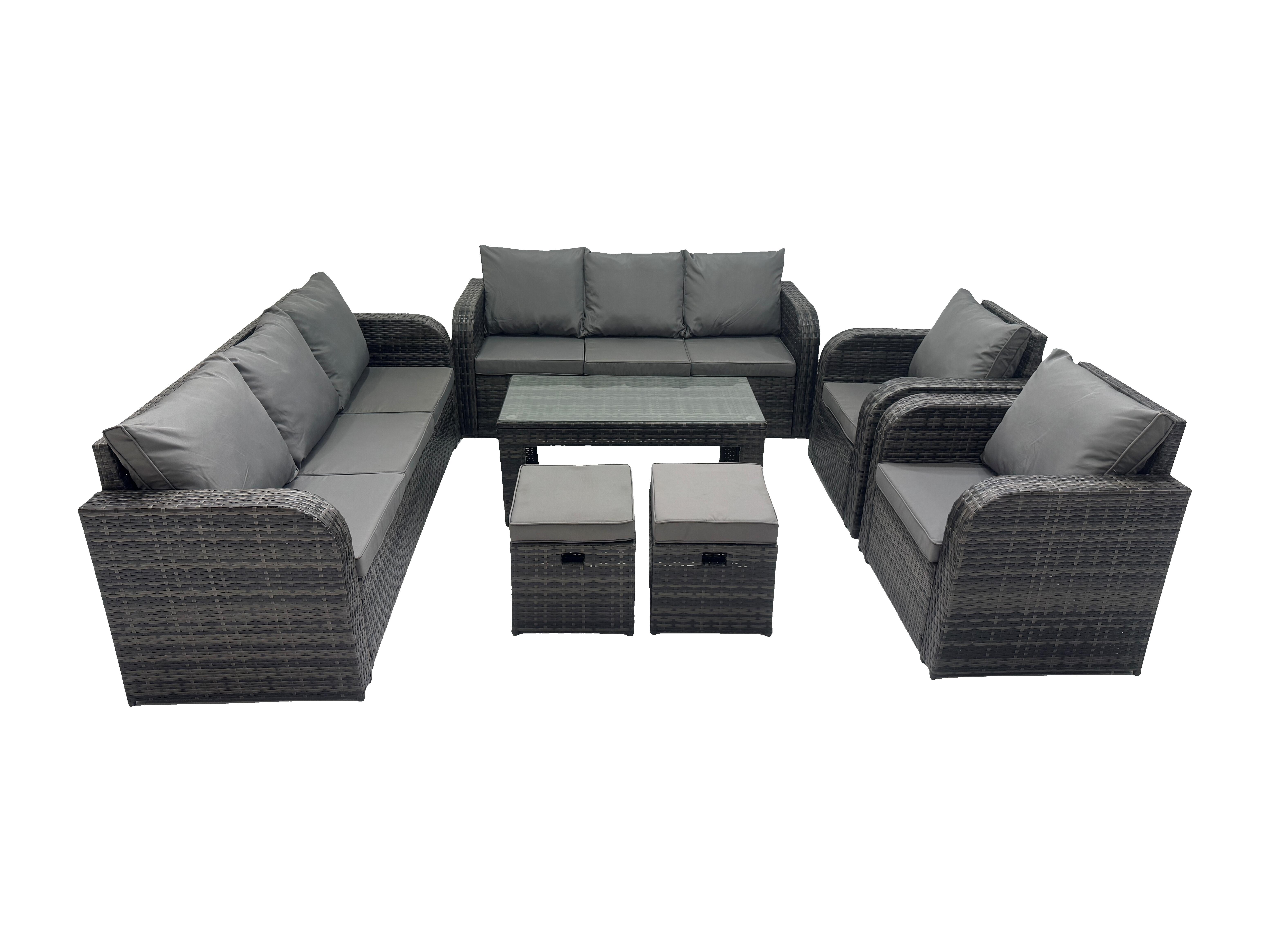 Rattan Gartenmöbel Set im Balkon 10-Sitzer Garten Sofa Set mit Rechteckiger Couchtisch Liegestühle 2 kleine Fußhockern