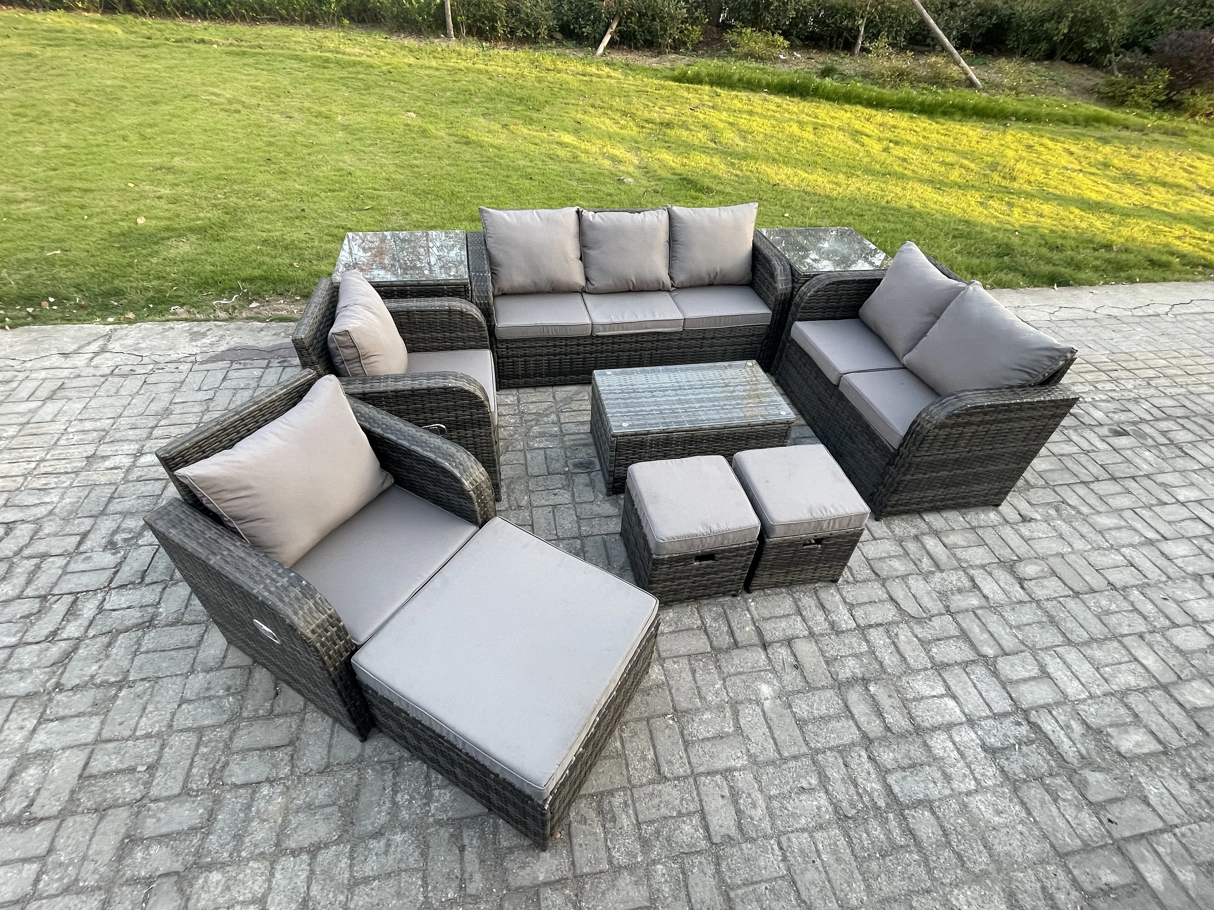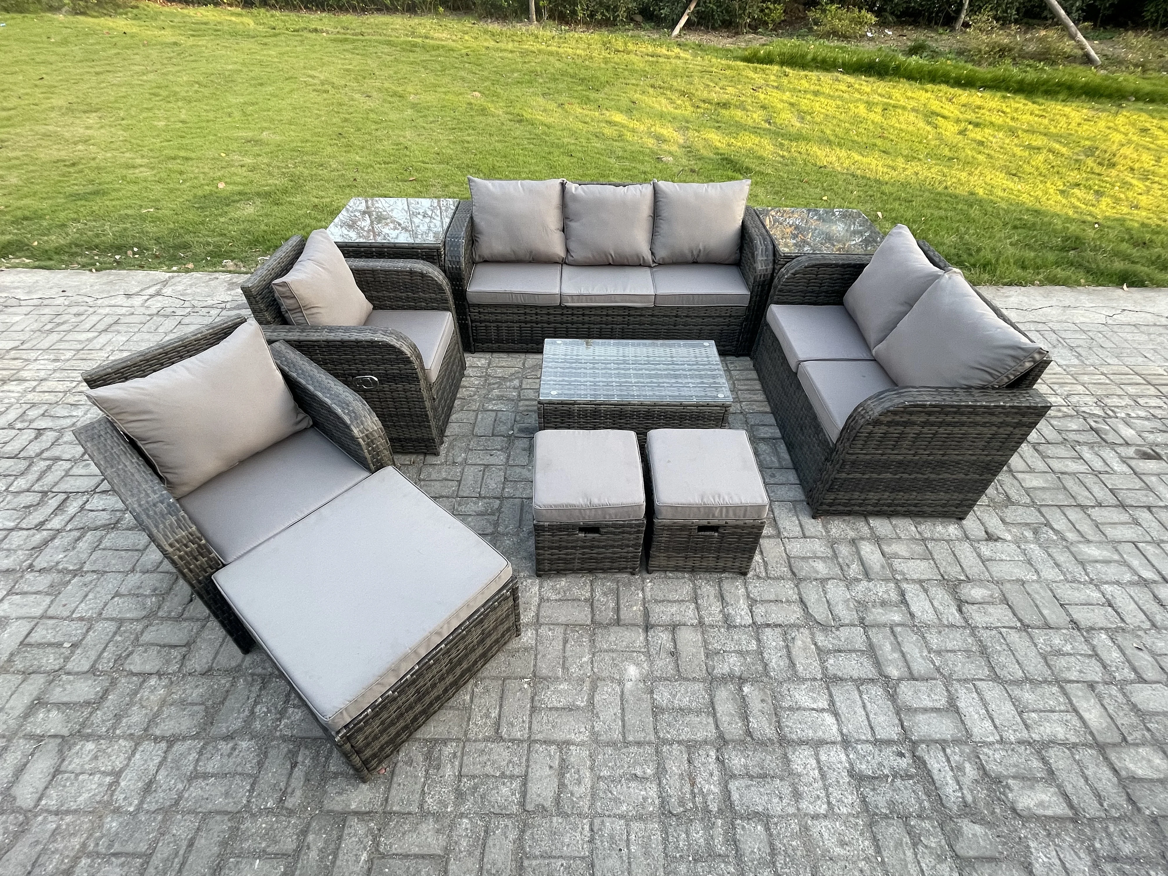 Rattan Gartenmöbel Set im Balkon 10-Sitzer Garten Sofa Set mit Rechteckiger Couchtisch Liegestühle Loveseat Sofa 2 Beistelltischen 3 Hockern