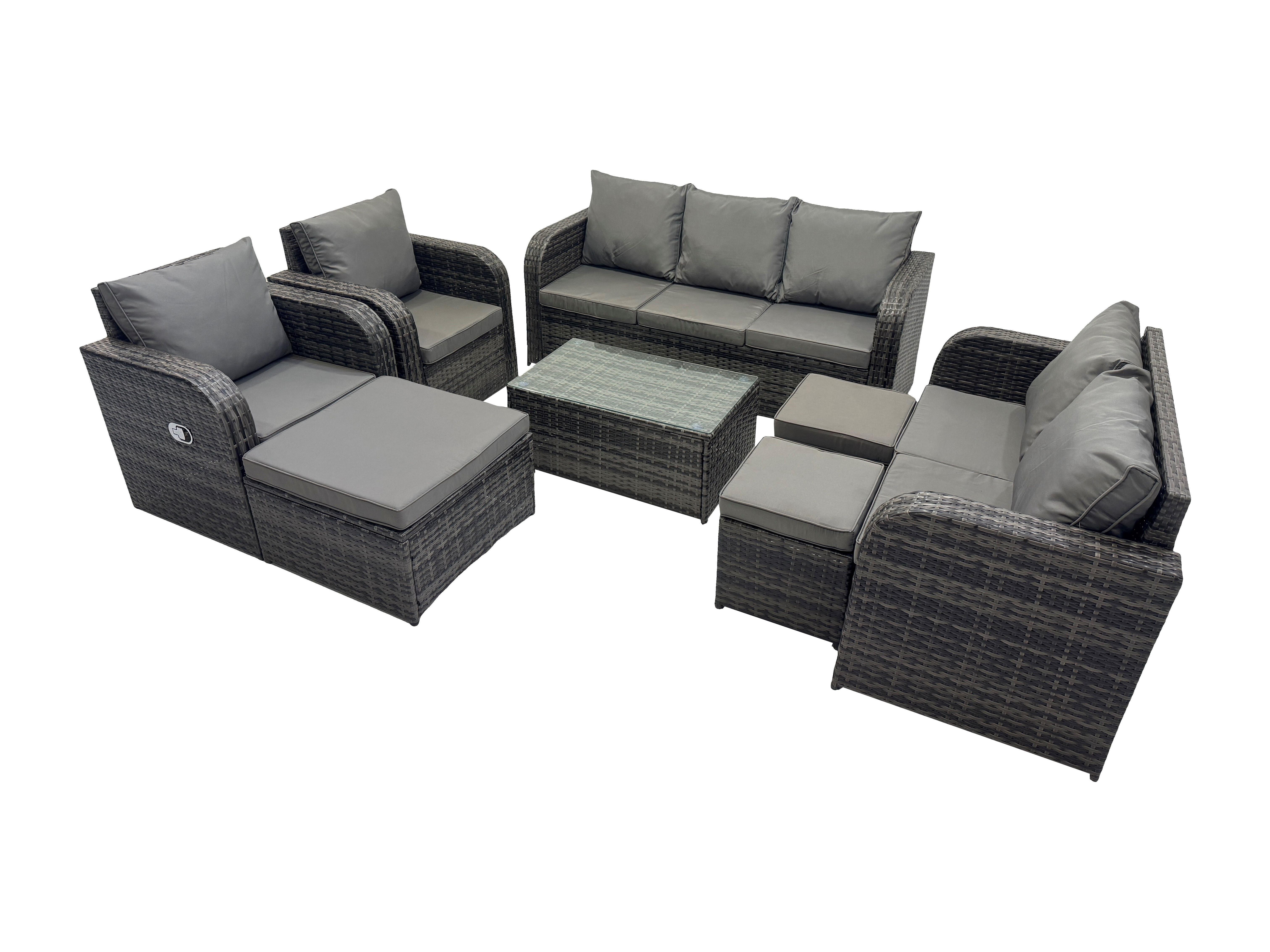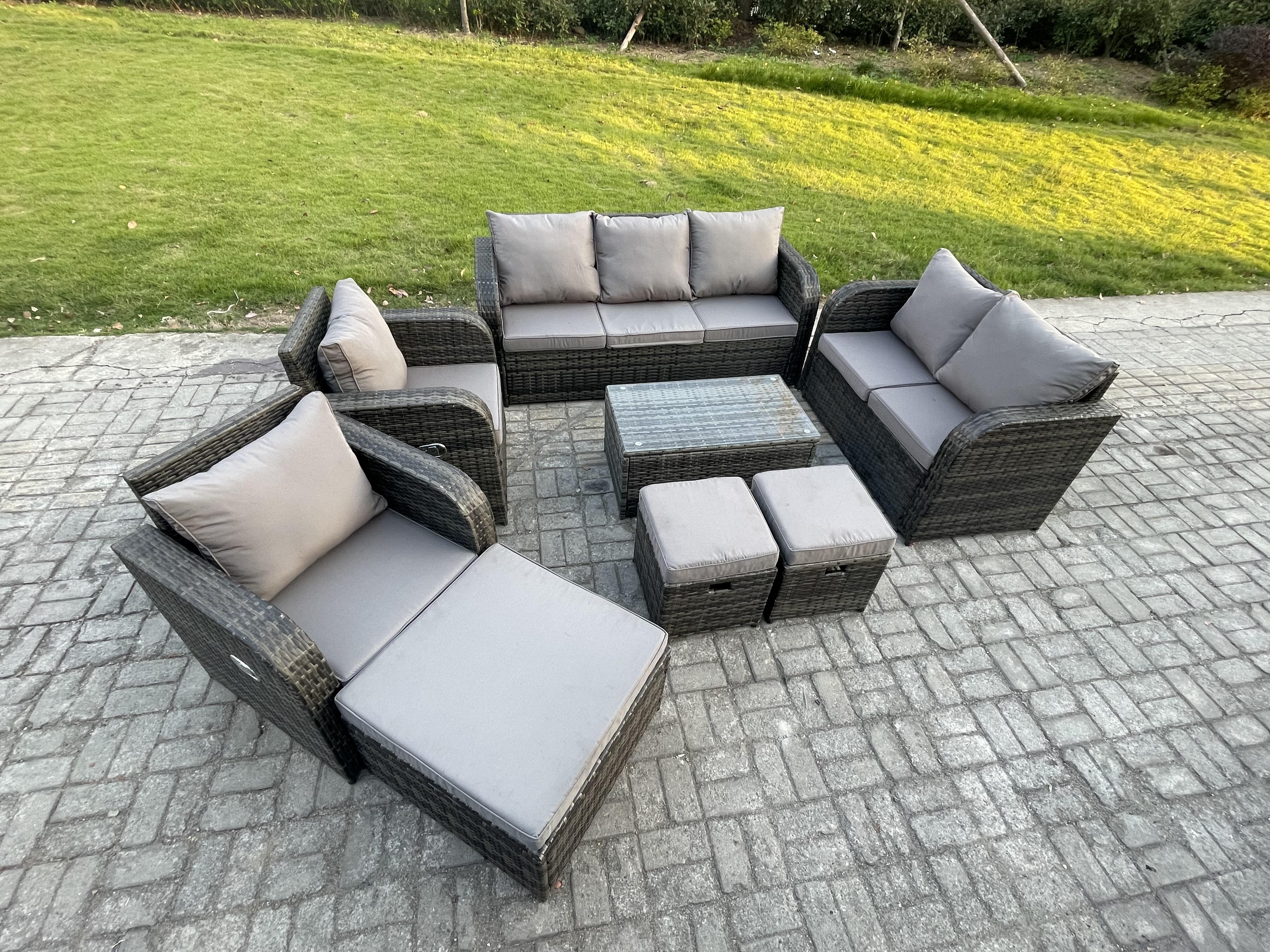 Rattan Gartenmöbel Set im Balkon 10-Sitzer Garten Sofa Set mit Rechteckiger Couchtisch Liegestühle Loveseat Sofa 3 Hockern